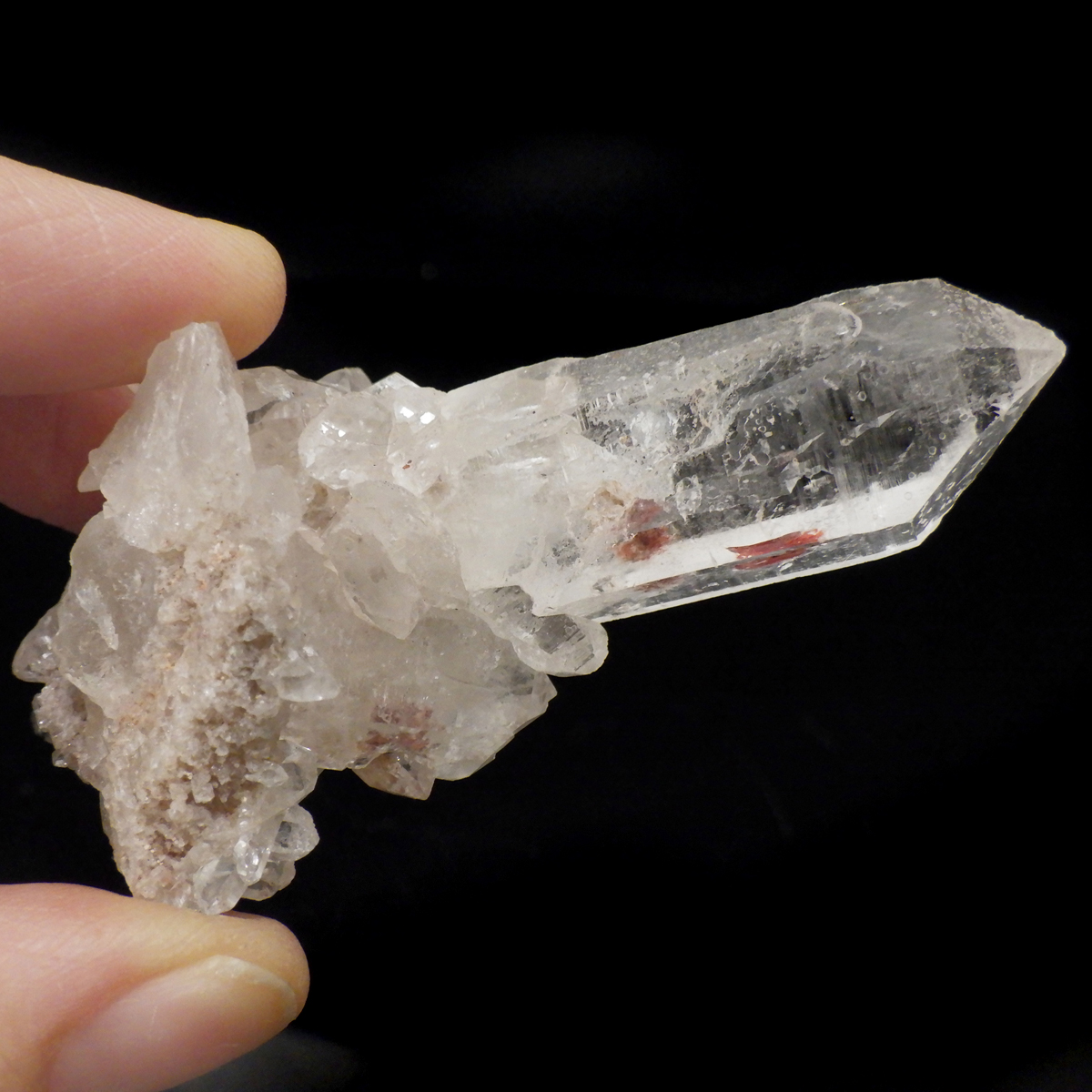 インド・ヒマラヤ山脈にあるパールバティー渓谷産の水晶クラスターです。この地で採掘される水晶には表面がピンク、又はグリーンをしたものがよく見られます。ピンク色の水晶といえばローズクォーツが有名ですが、それとは別で土壌に含まれる赤褐色をした酸化鉄により表面や母岩部がピンク色になっています。ほんのりと淡いピンク色や濃いピンク色、オレンジがかったピンク色などそれぞれ微妙に色合いも違います。グリーンはクローライトを内包したものになります。