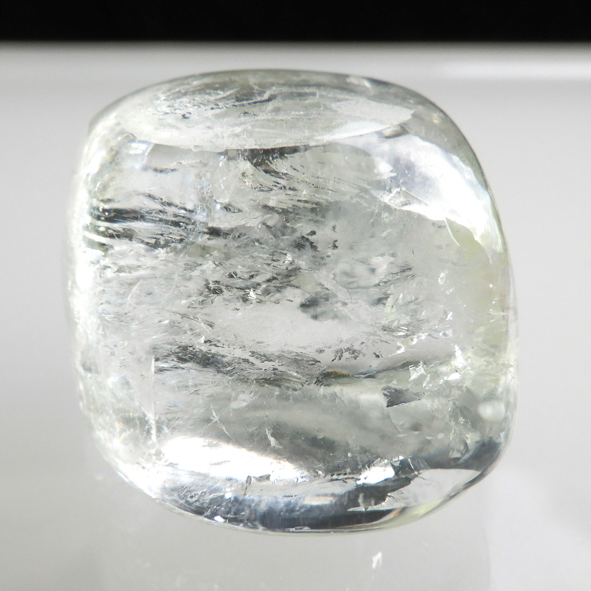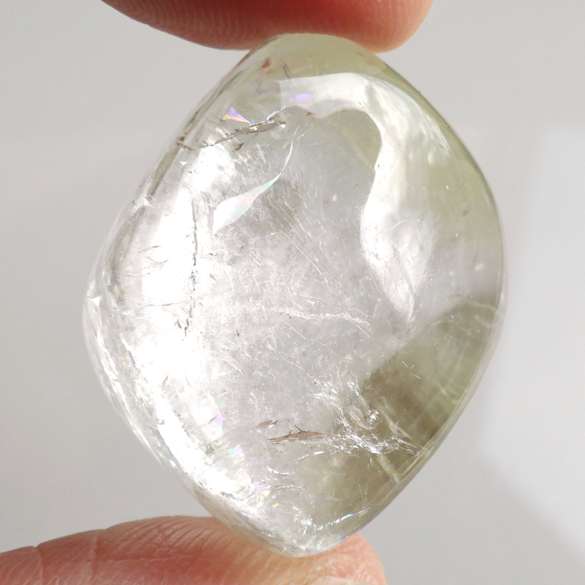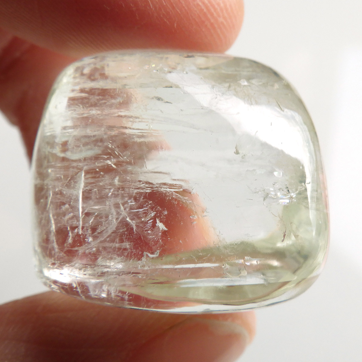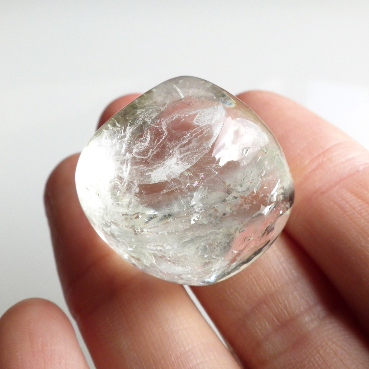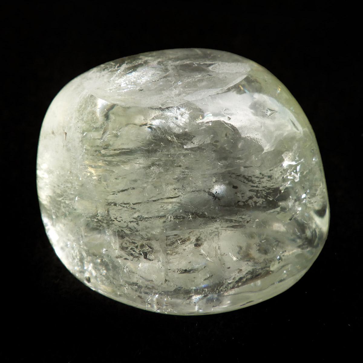 インド、プネー産のグリーンアポフィライト、タンブルです。アポフィライトは、柱状や正方錘状の結晶を持ち、ひとつひとつの結晶が複雑に入り組んだ群晶が水晶とは違う神々しい輝きを魅せてくれます。透明度が非常に高くキラキラ輝き神秘的でとてもきれいです。