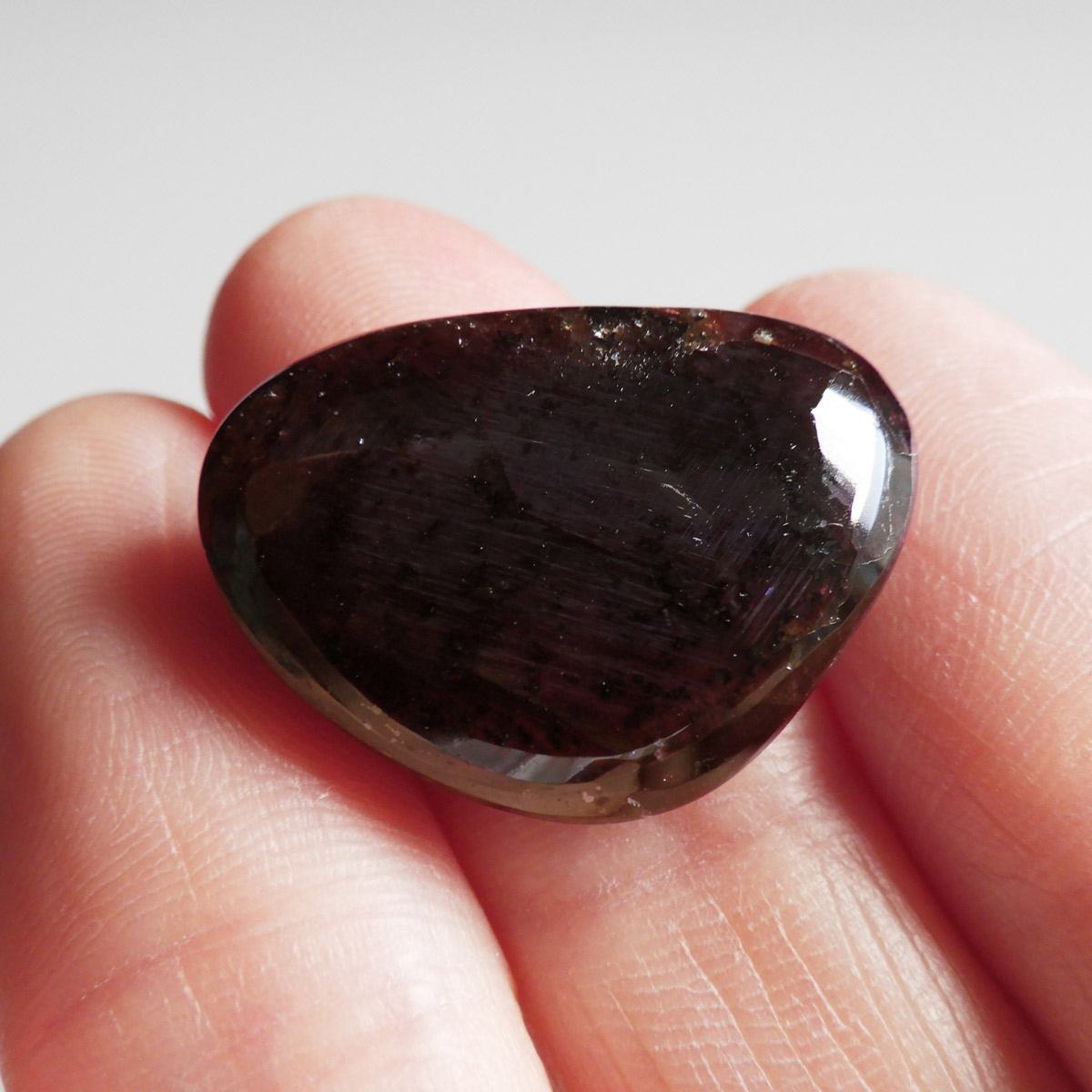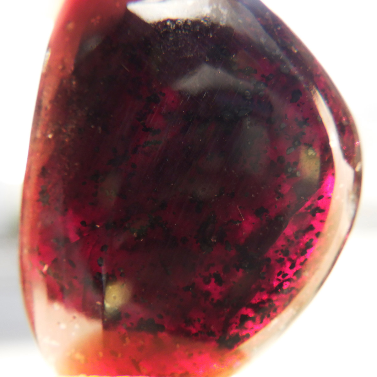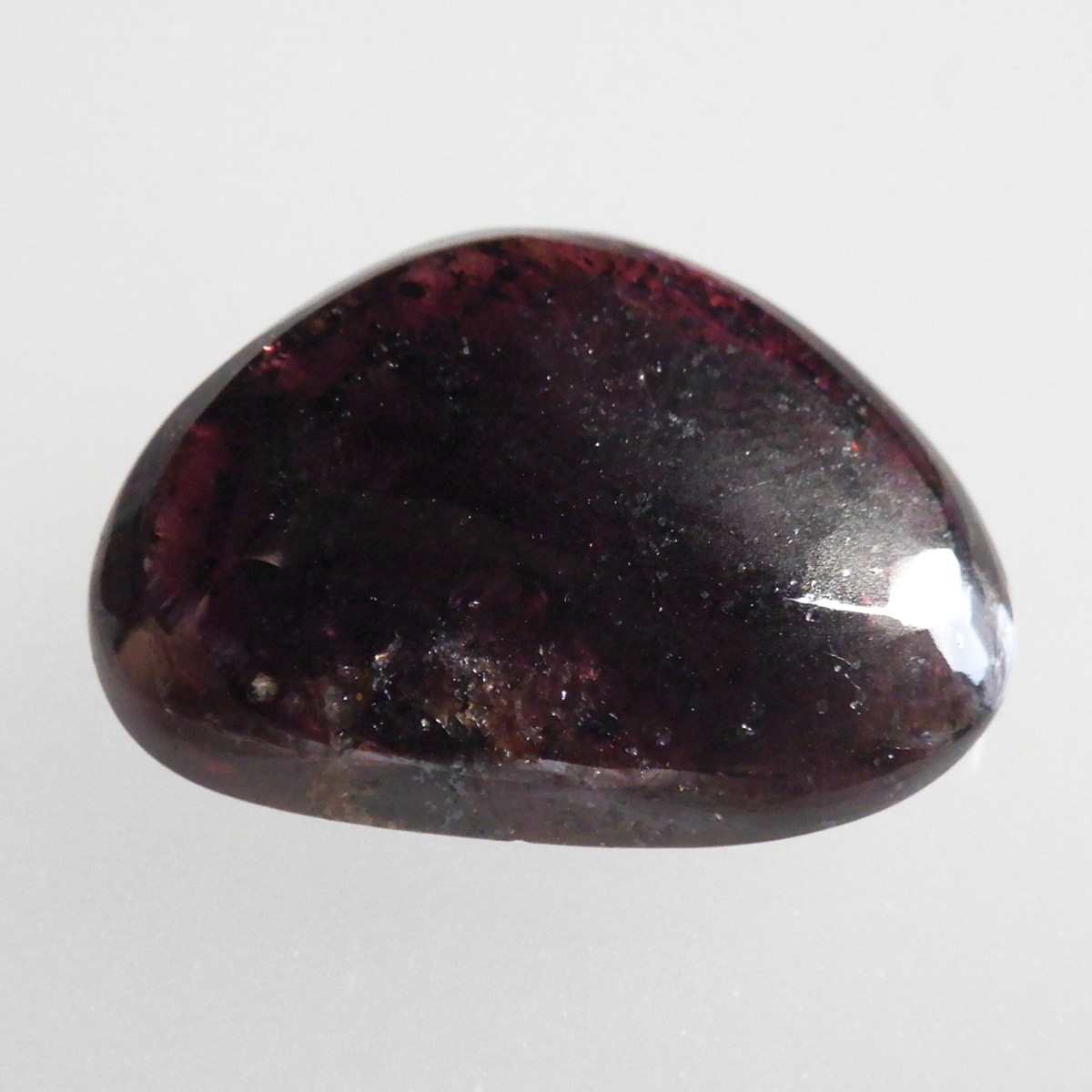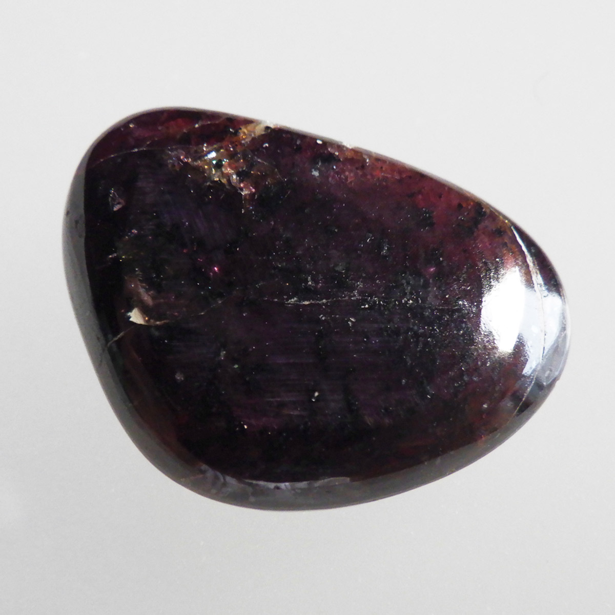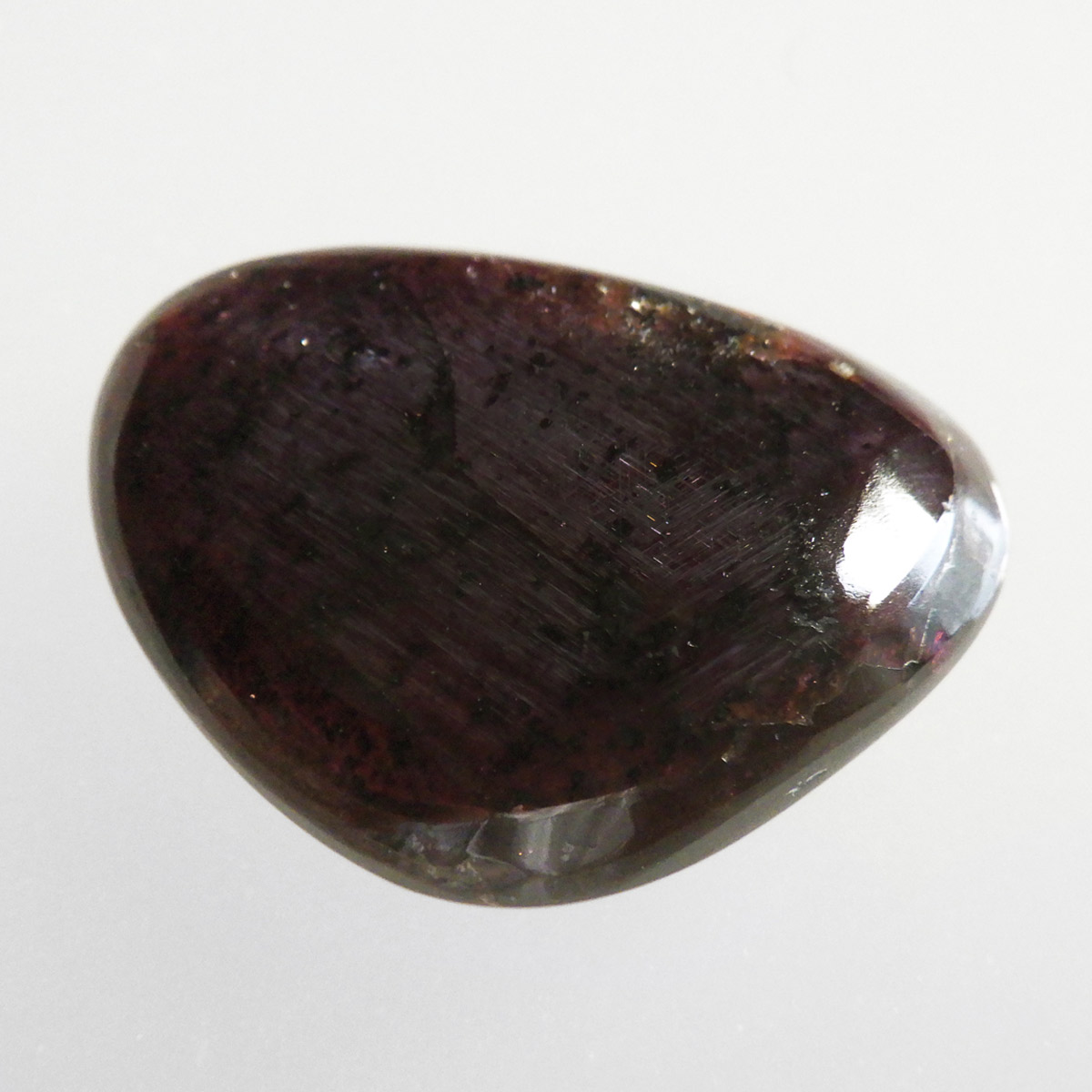 インド産ロードライトガーネット、タンブルです。ロードライトガーネットは紫帯びた赤のワインレッド色が非常に美しいガーネットのことです。アルマンディン(鉄礬柘榴石)とパイロープ(苦礬柘榴石)の混合ガーネットであり、貴重で高価、そして数少ないパワーストーンであることから、人気がとても高いストーンです。光に透かすとよりきれいな色彩が現れます。