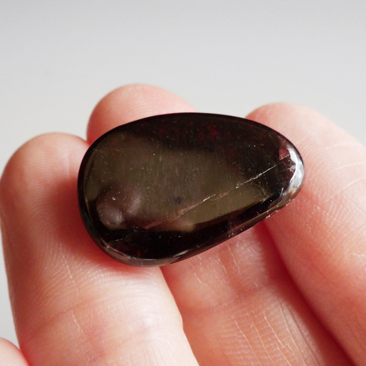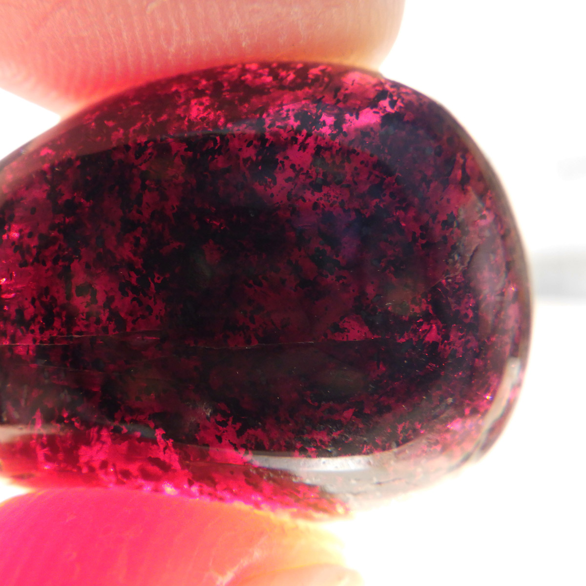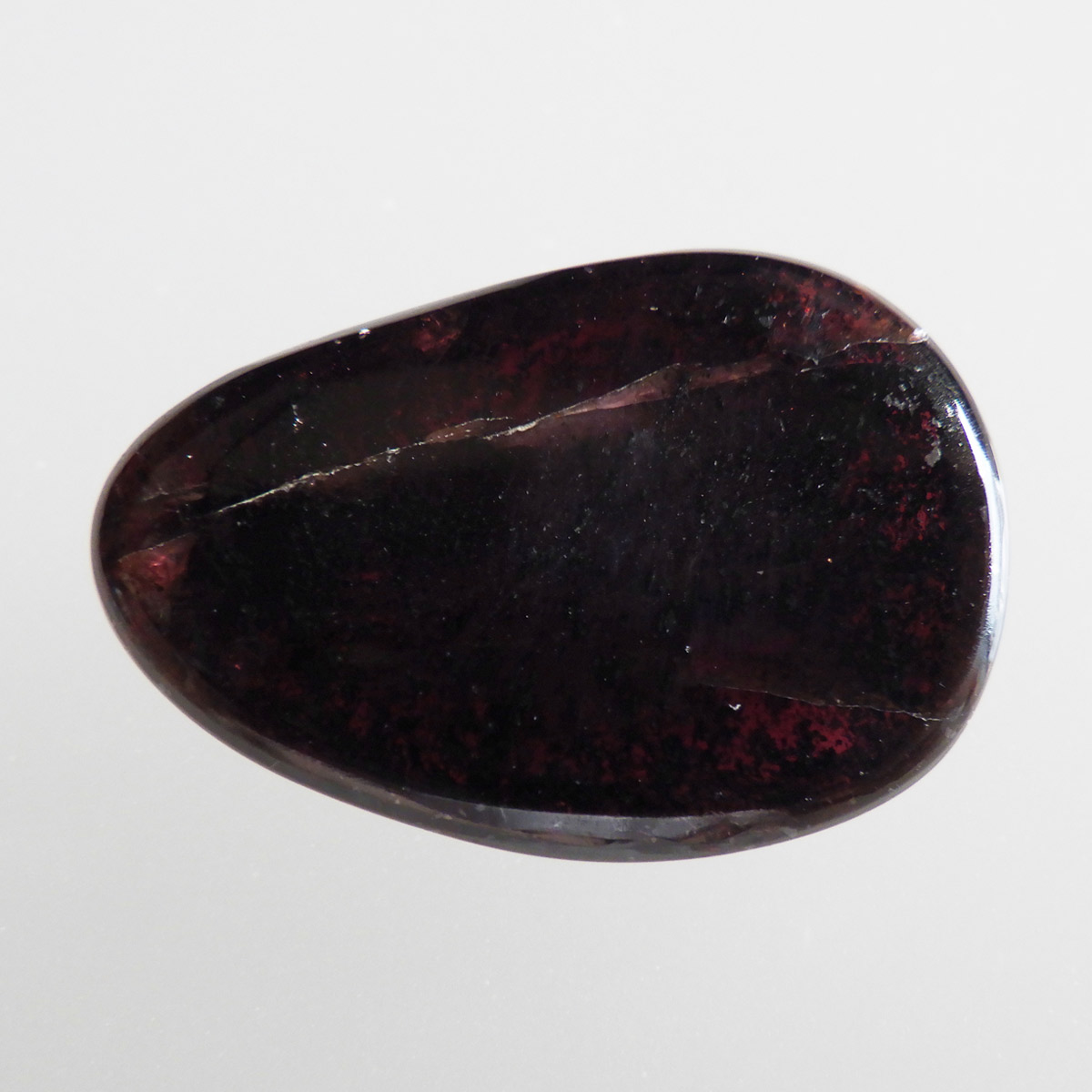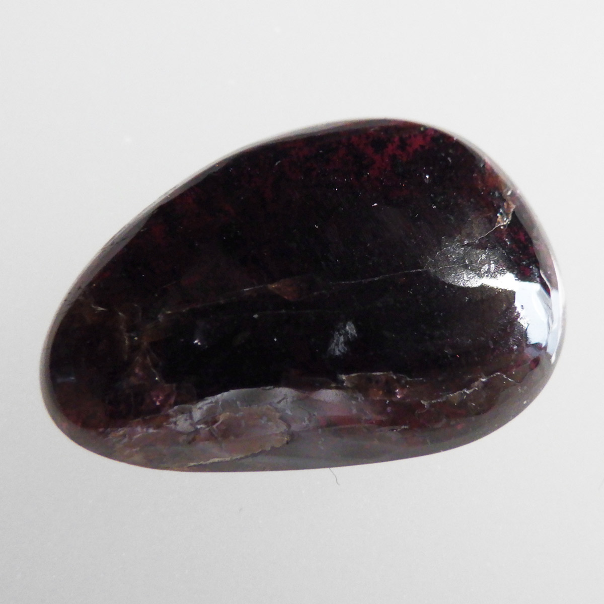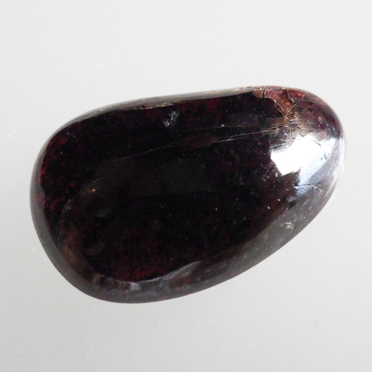 インド産ロードライトガーネット、タンブルです。ロードライトガーネットは紫帯びた赤のワインレッド色が非常に美しいガーネットのことです。アルマンディン(鉄礬柘榴石)とパイロープ(苦礬柘榴石)の混合ガーネットであり、貴重で高価、そして数少ないパワーストーンであることから、人気がとても高いストーンです。光に透かすとよりきれいな色彩が現れます。