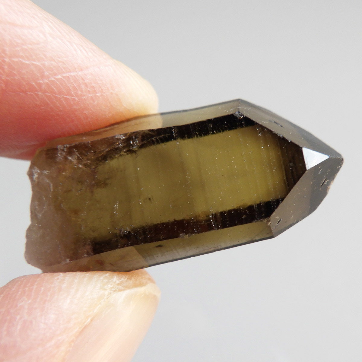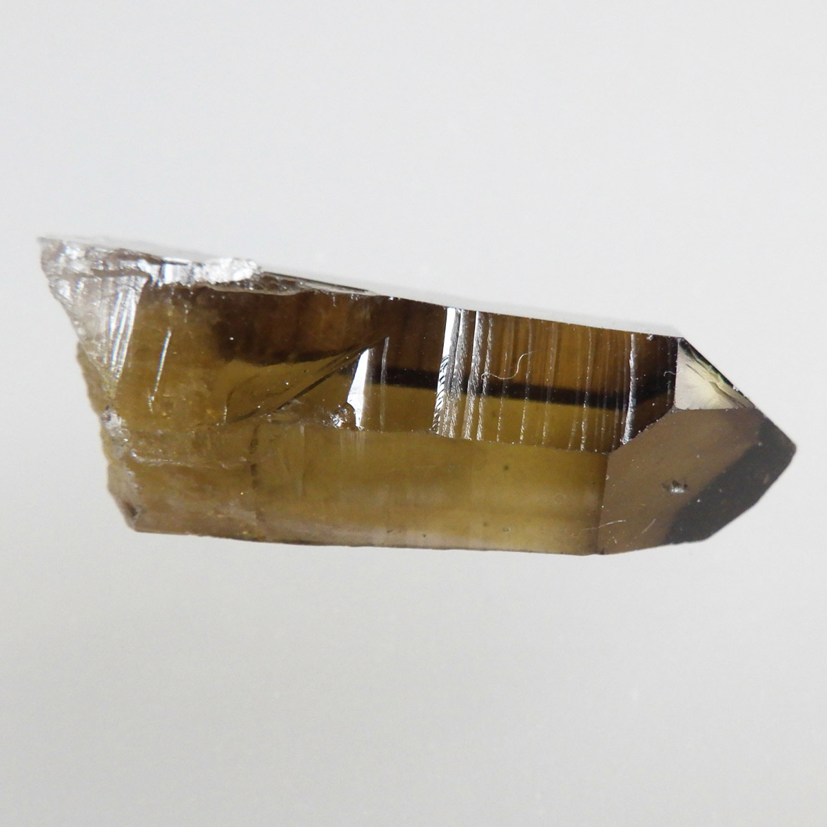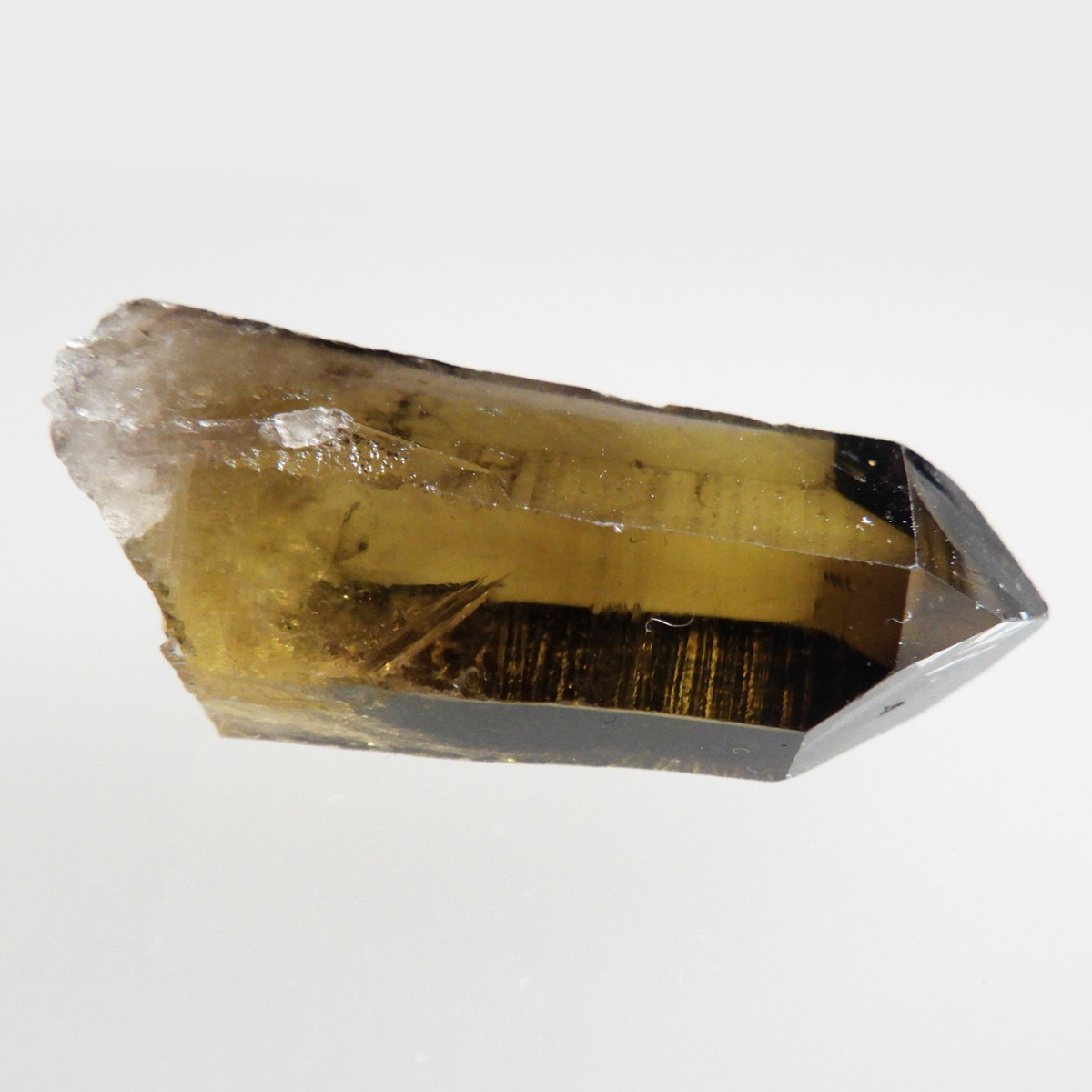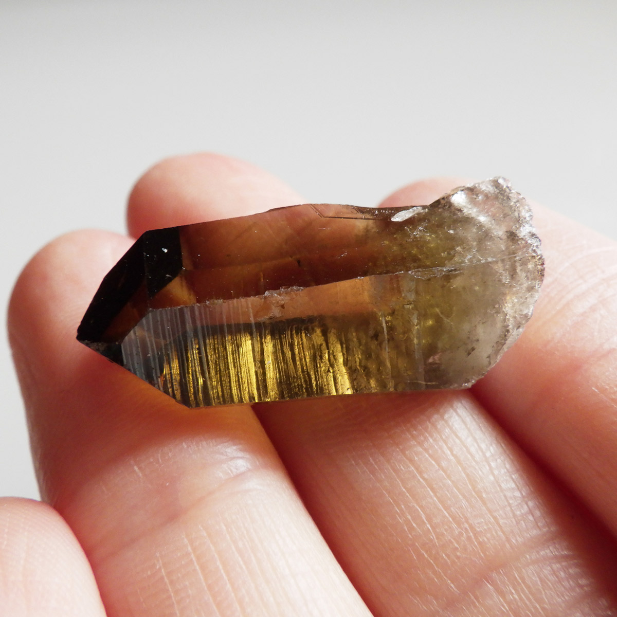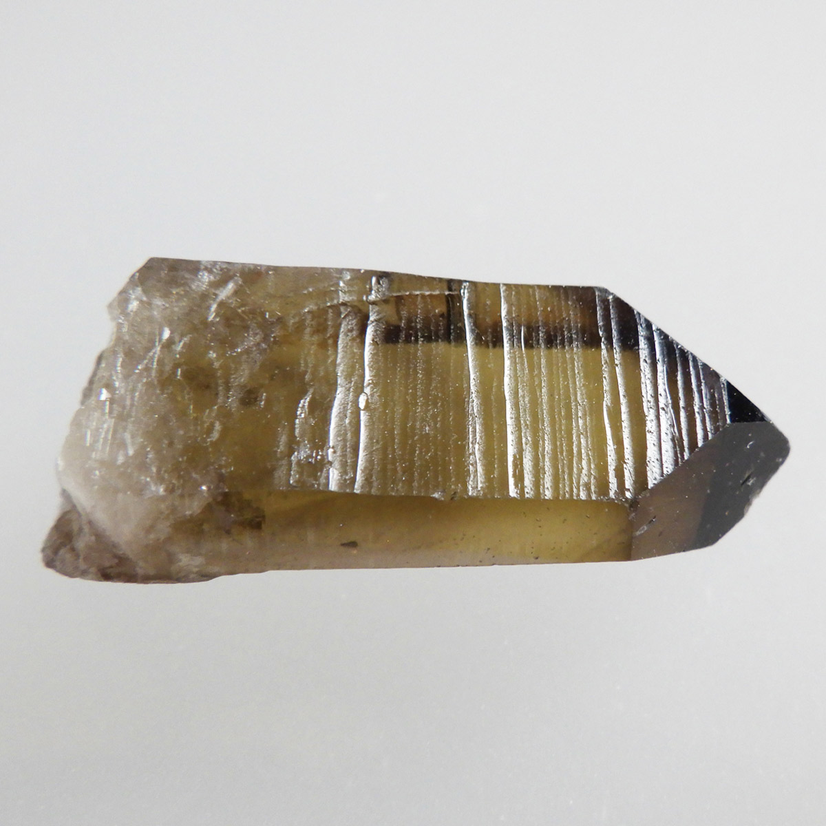 世界有数のパワースポット、ウラル山脈で産出されたスモーキーシトリンです。天然のカラーとポリッシュをかけていない天然の姿のスモーキーシトリンポイントです。透明度が非常に高く、一見黒くスモーキーに見えますが光を通すと黄色味がかった姿を現します。表面の照りも面白いですし、内部のモクモクとしたファントムも見られます。ウラル産の天然スモーキーシトリン、人工物にはない深いエネルギーを秘めたような感じが漂う一点です。