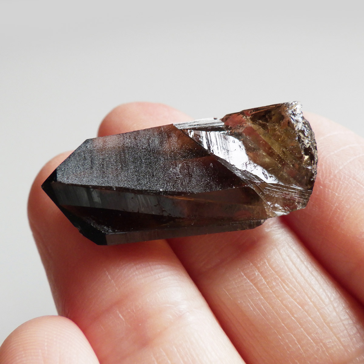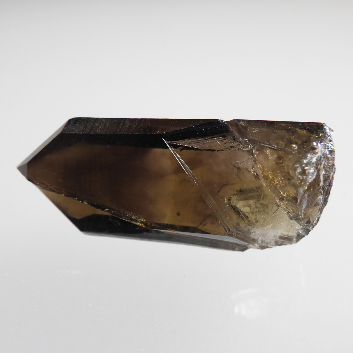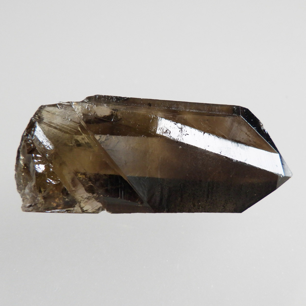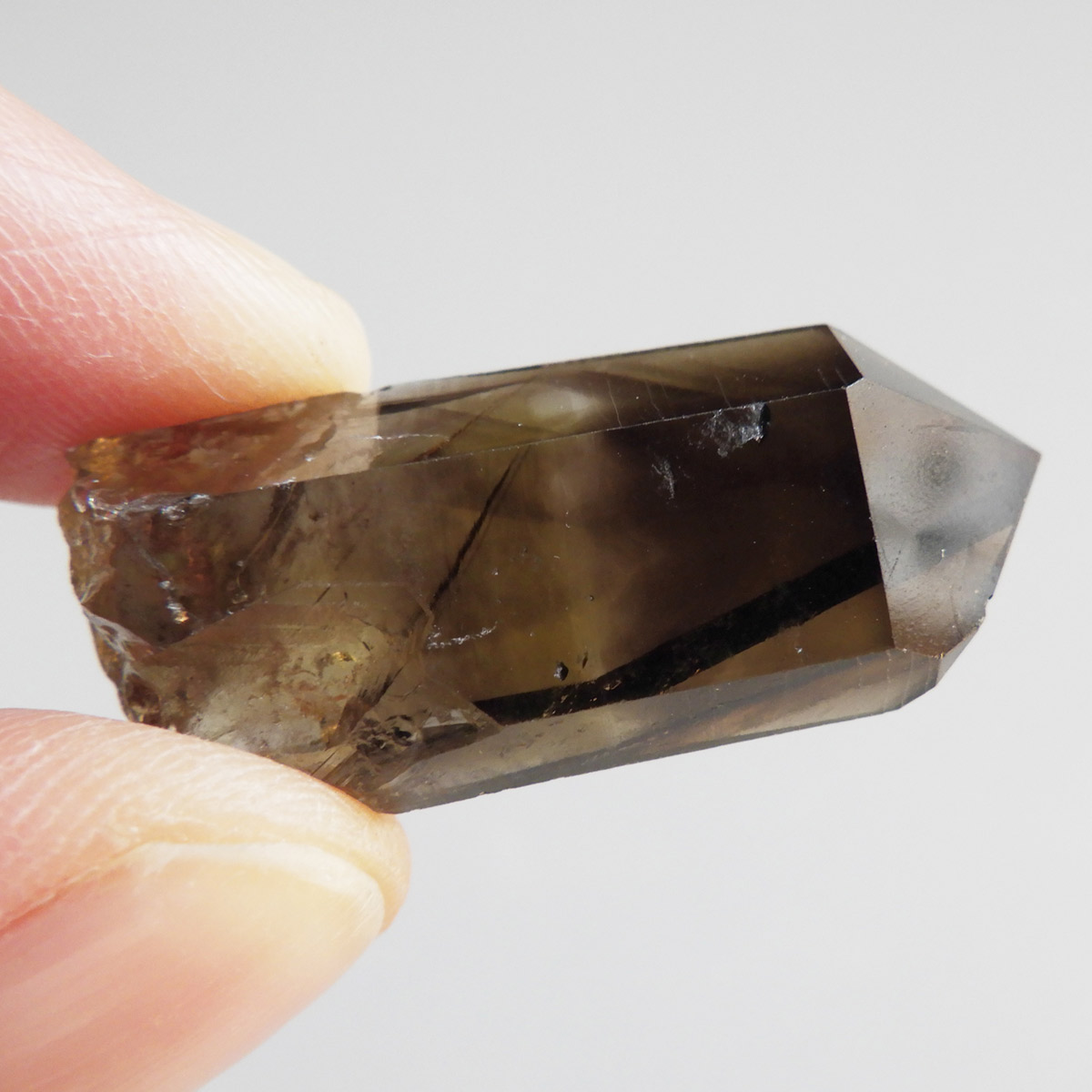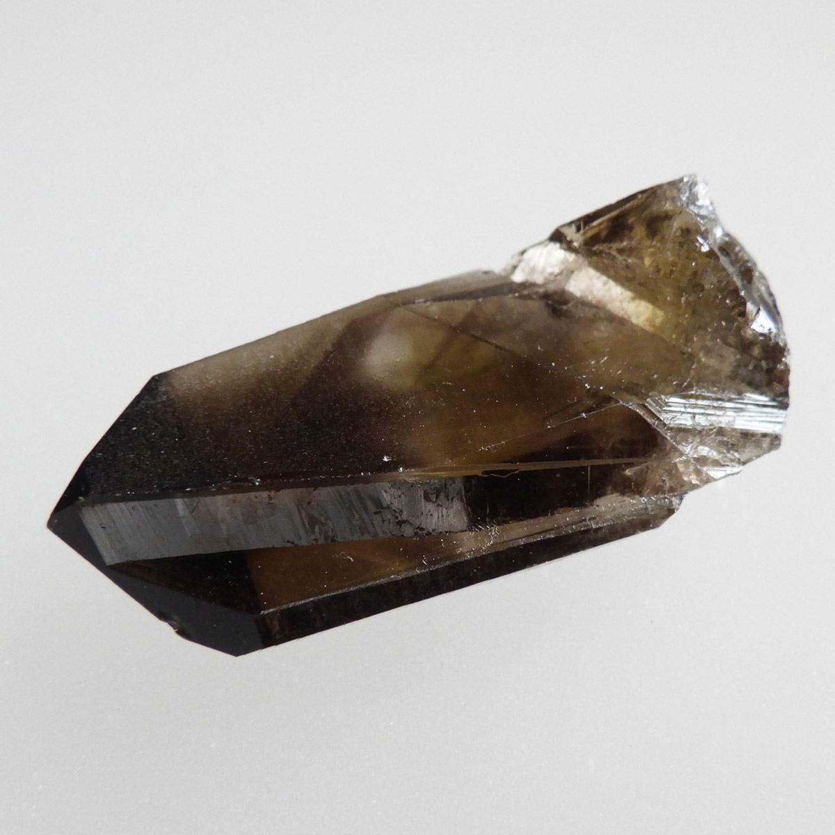 世界有数のパワースポット、ウラル山脈で産出されたスモーキーシトリンです。天然のカラーとポリッシュをかけていない天然の姿のスモーキーシトリンポイントです。透明度が非常に高く、一見黒くスモーキーに見えますが光を通すと黄色味がかった姿を現します。表面の照りも面白いですし、内部のモクモクとしたファントムも見られます。ウラル産の天然スモーキーシトリン、人工物にはない深いエネルギーを秘めたような感じが漂う一点です。