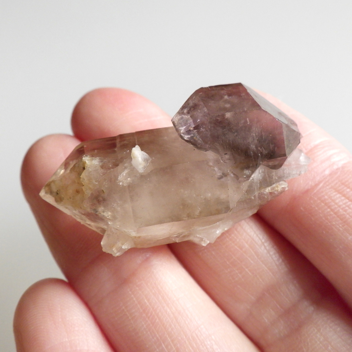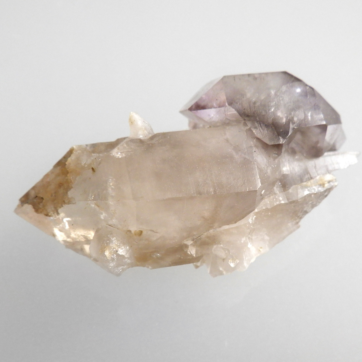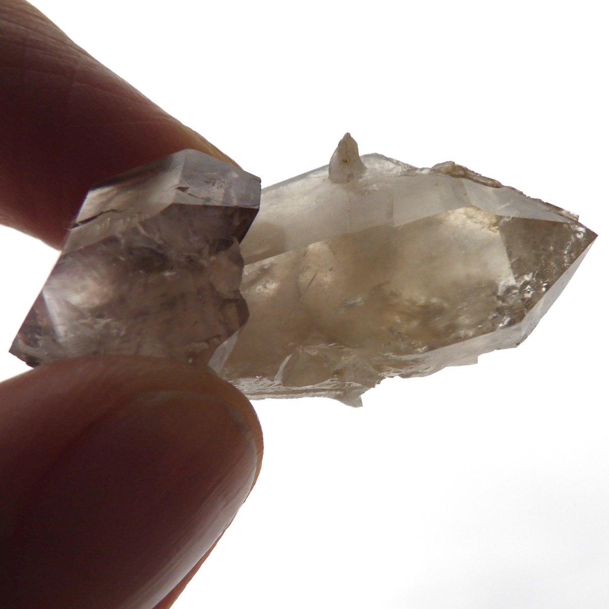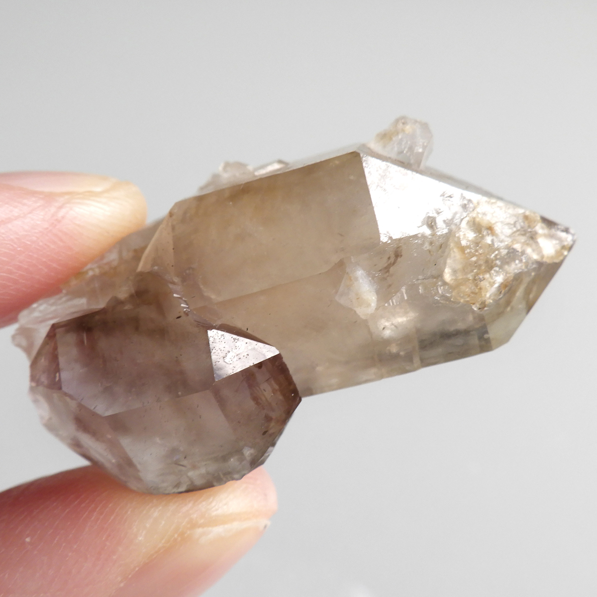 アメリカ合衆国の西部に位置するネバダ州産、スモーキークォーツの原石 ポイントです。 スモーキークォーツはまたの名を茶水晶や煙水晶とも呼ばれ、名前の通り茶色味かかった水晶で、これはアルミニウムイオンの作用とされています。 異なった二色の結晶と結晶が大変ユニークな形で結合しており、小さいですがレインボーも見られます。