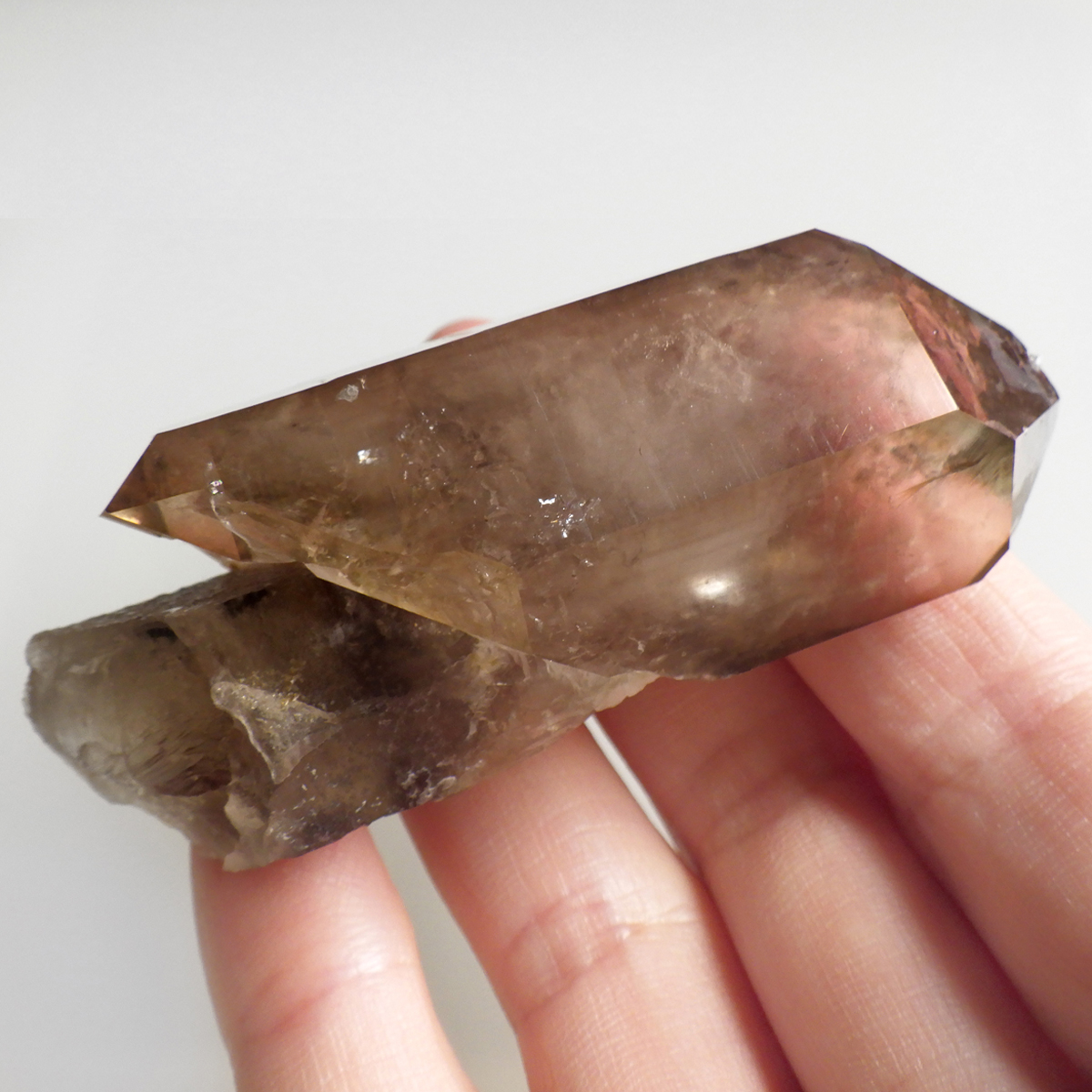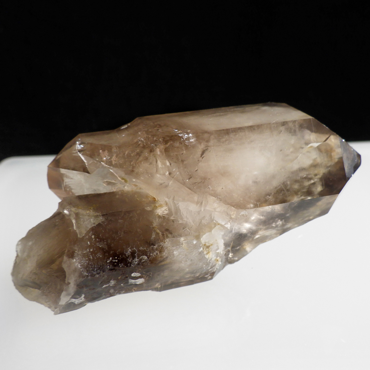 このスモーキークォーツは、柱状水晶の上に覆いかぶさるように水晶が成長する、セプタークォーツになっており、元の水晶の先端が透けて見え、大変ユニークな形状になっています。また、そのセプタークォーツがダブルポイントになっており、珍しい一点になります。