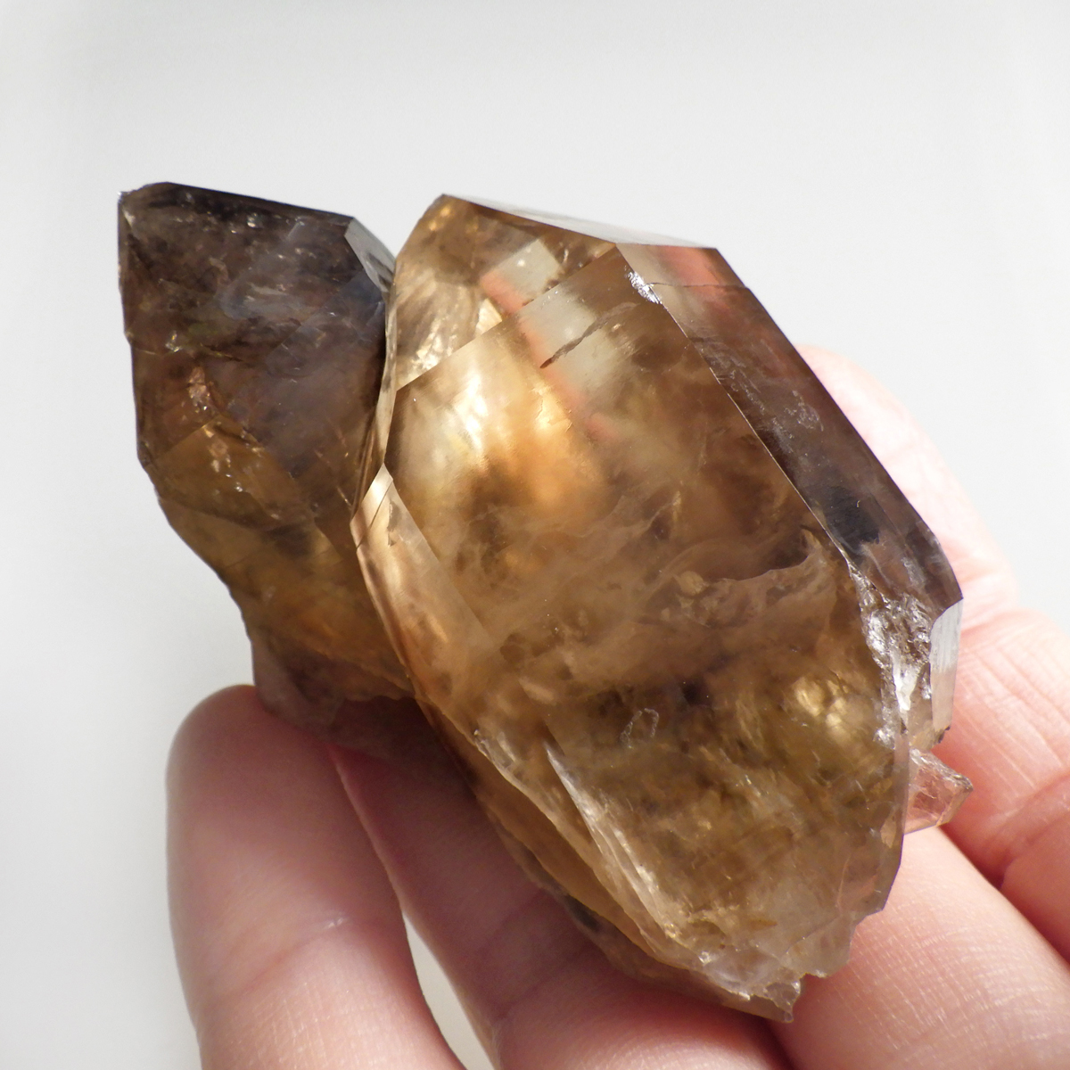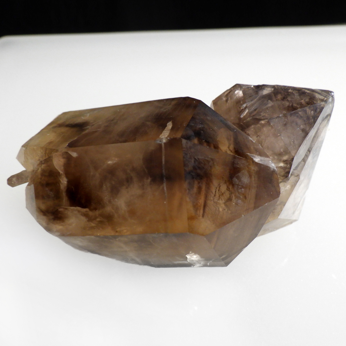 このスモーキークォーツは、結晶と結晶がユニークな形で結合しており、後ろの水晶は一部セプタークォーツのような形状になっています。また、手前の水晶の内部に美しいレインボーが見られます。