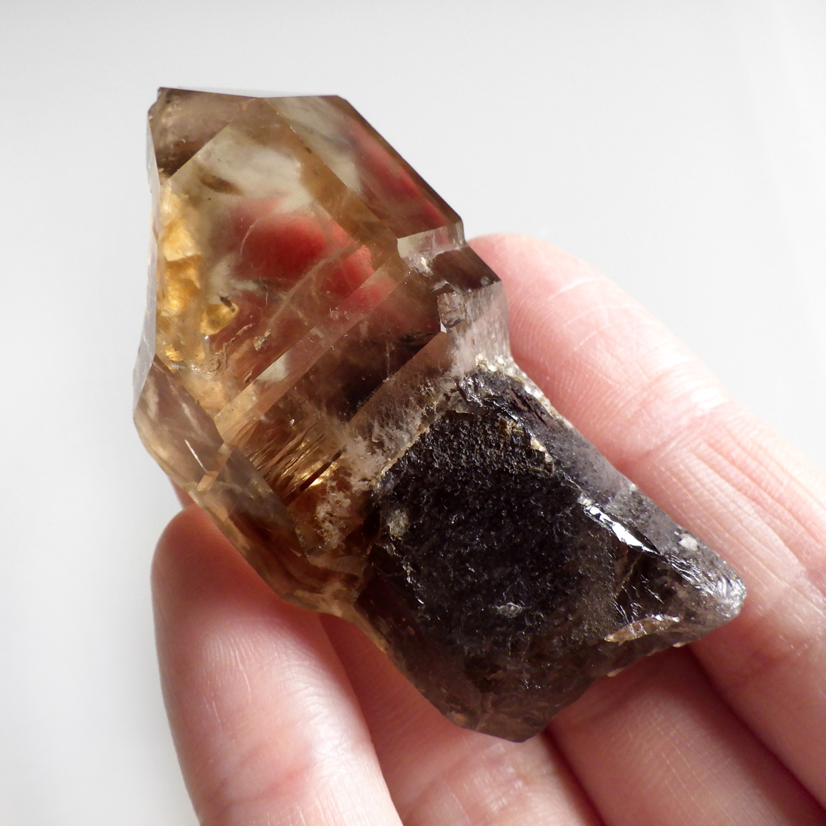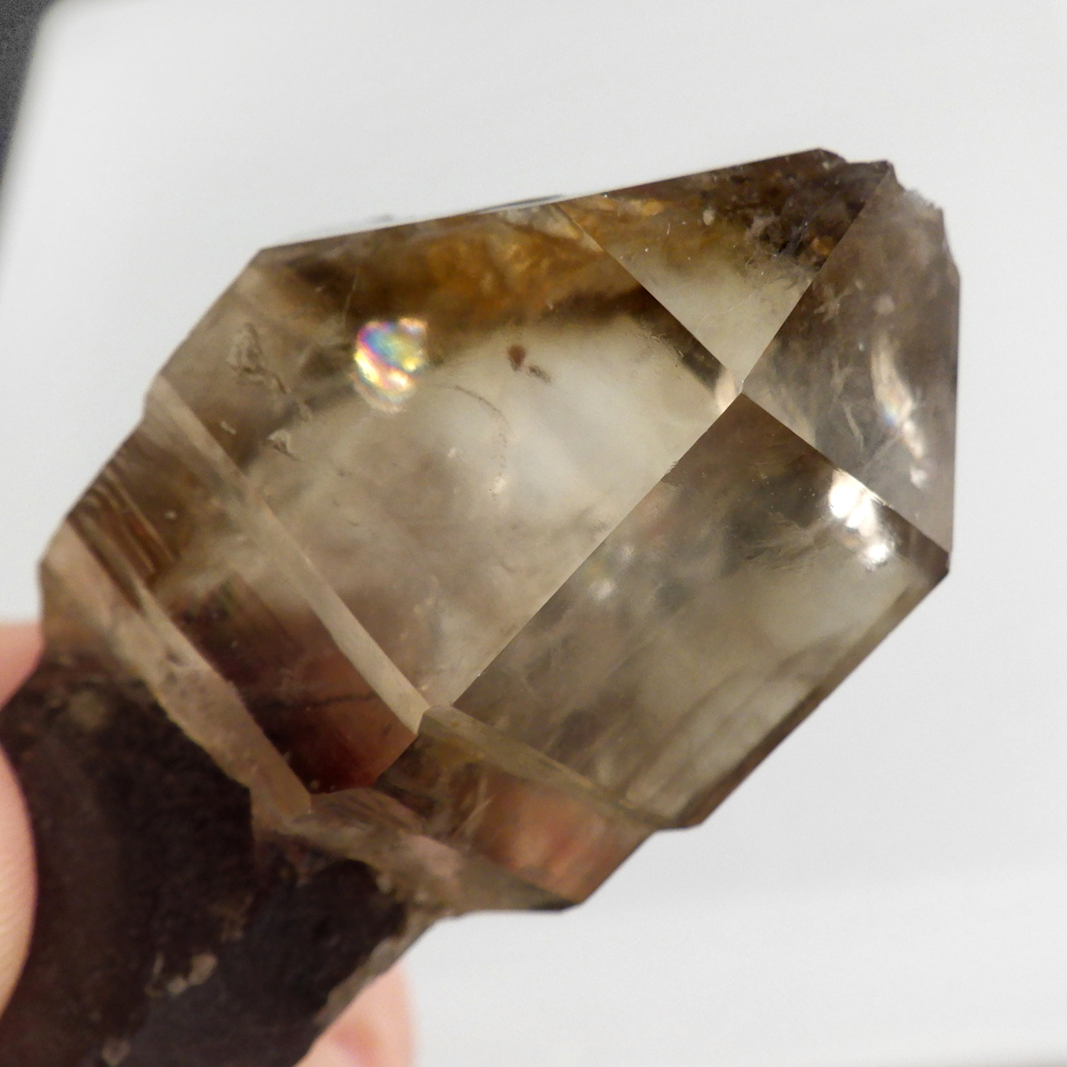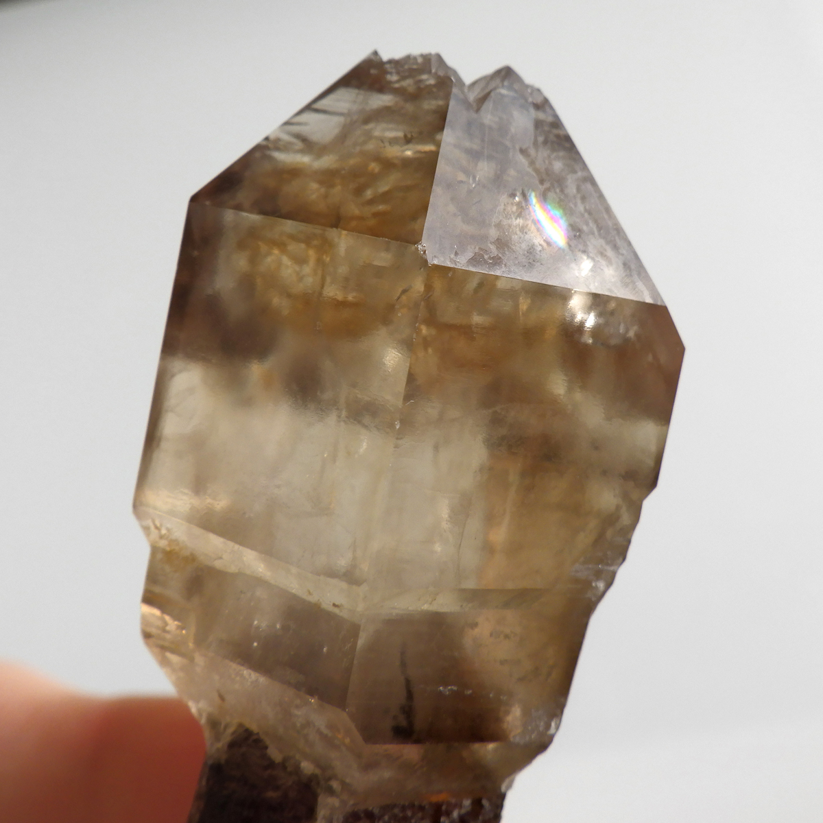 このスモーキークォーツは、柱状水晶の上に覆いかぶさるように水晶が成長する、セプタークォーツになっており、元の水晶の先端が透けて見え、大変ユニークな形状になっています。またレインボーが数か所見られます。