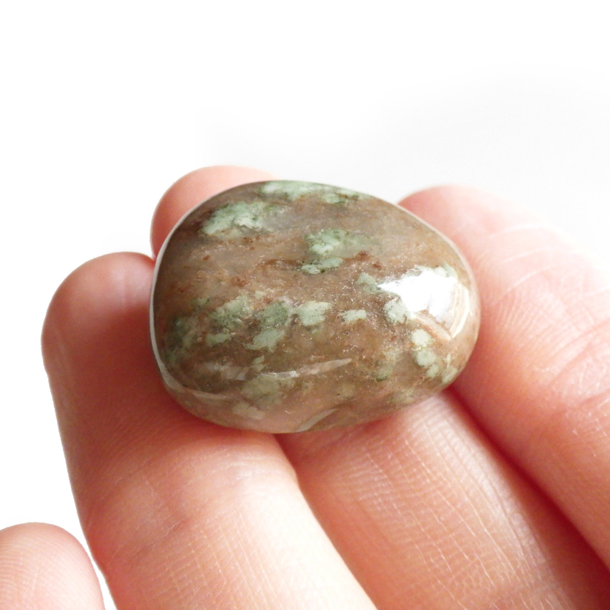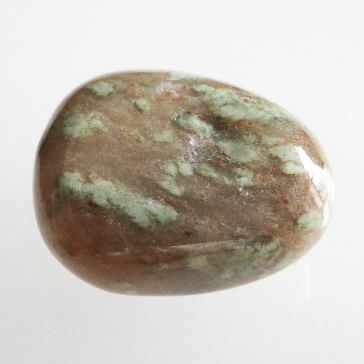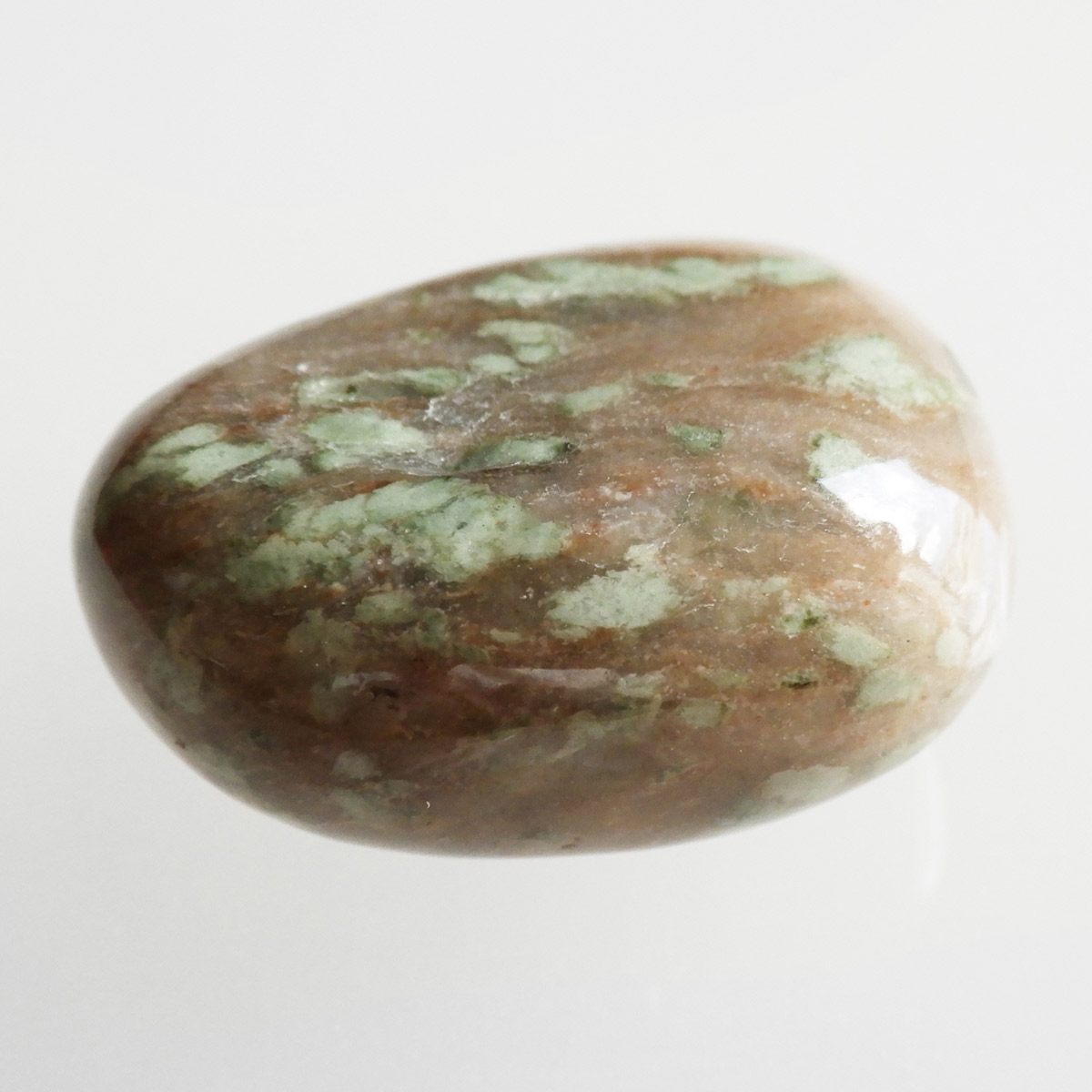 オーストラリア産のナンドライト、タンブルです。ナンドライトはオーストラリア・ニューサウスウェールズ州の小さな町ナンドルが産地である、希少であまり知られていない岩石です。ナンドライトという名前は、この産地に由来しています。ナンドライトの本質的な分類はエジリン閃長岩(エジリン・サイアナイト)にあたります。茶色やベージュ系のサイアナイト母岩の中に、深いグリーンのエジリンがドット状に散りばめられており、その独特な模様と色合いが非常に魅力的です。