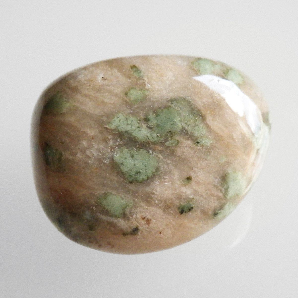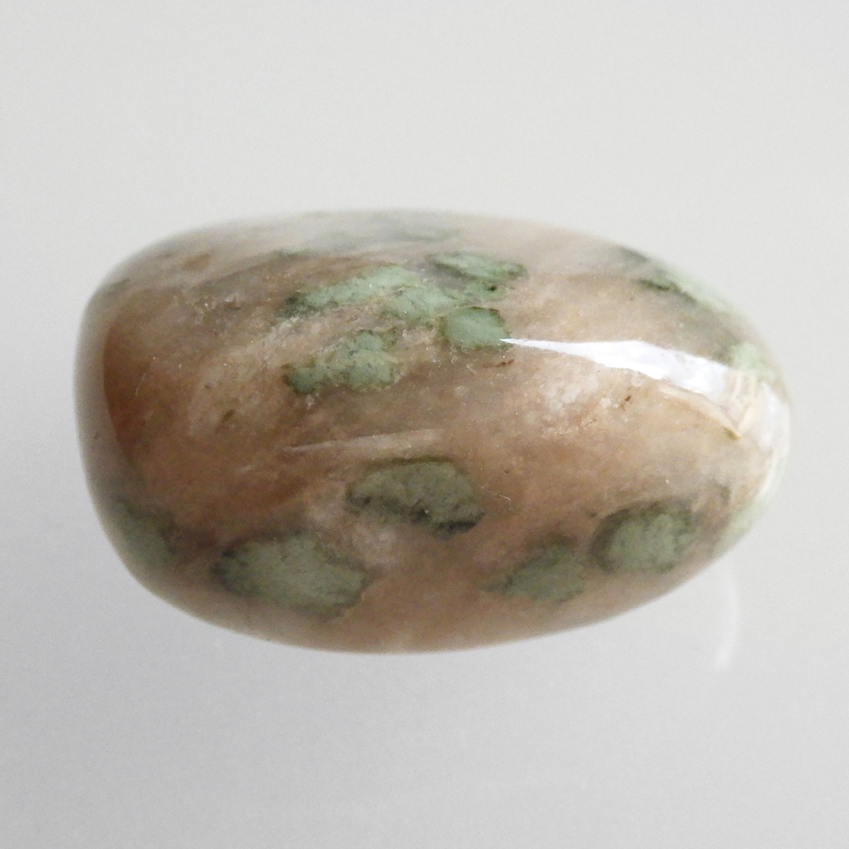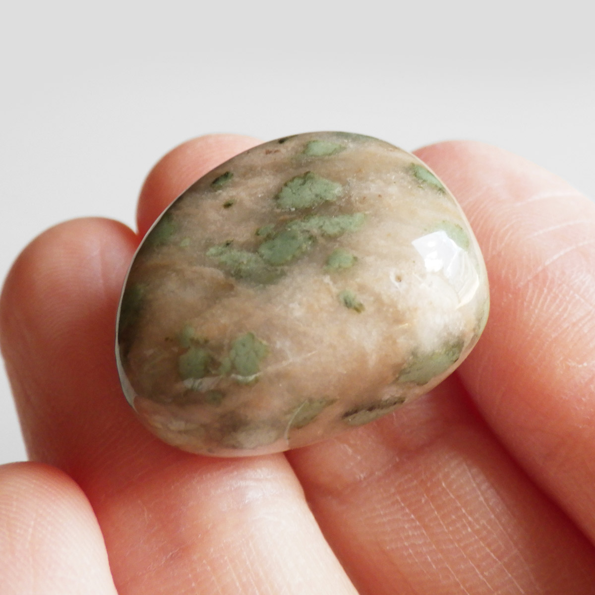 オーストラリア産のナンドライト、タンブルです。ナンドライトはオーストラリア・ニューサウスウェールズ州の小さな町ナンドルが産地である、希少であまり知られていない岩石です。ナンドライトという名前は、この産地に由来しています。ナンドライトの本質的な分類はエジリン閃長岩(エジリン・サイアナイト)にあたります。茶色やベージュ系のサイアナイト母岩の中に、深いグリーンのエジリンがドット状に散りばめられており、その独特な模様と色合いが非常に魅力的です。