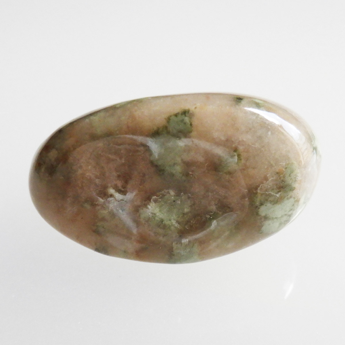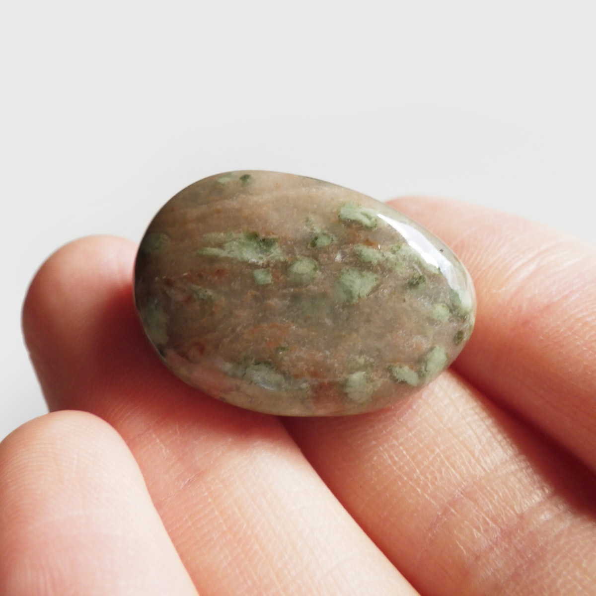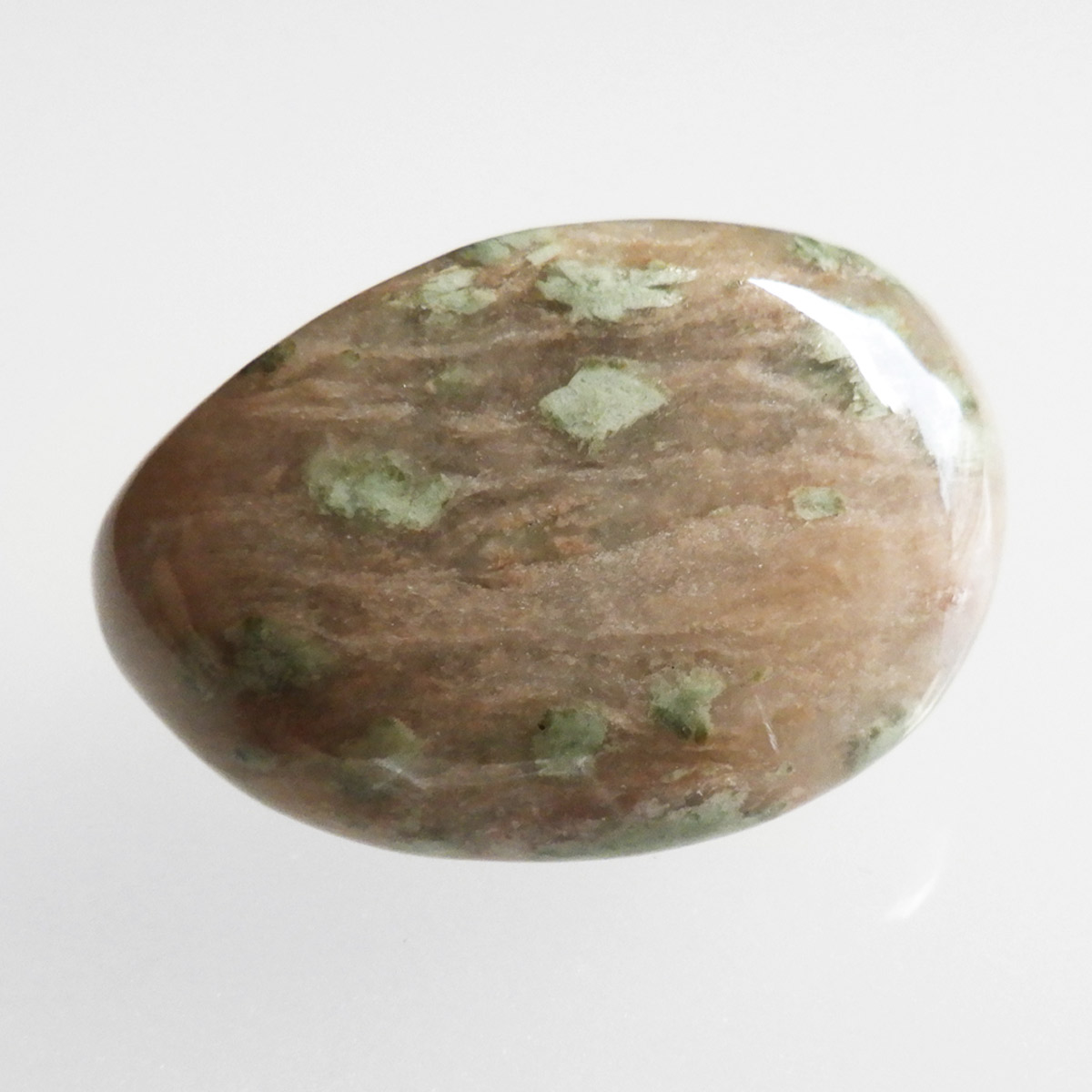 オーストラリア産のナンドライト、タンブルです。ナンドライトはオーストラリア・ニューサウスウェールズ州の小さな町ナンドルが産地である、希少であまり知られていない岩石です。ナンドライトという名前は、この産地に由来しています。ナンドライトの本質的な分類はエジリン閃長岩(エジリン・サイアナイト)にあたります。茶色やベージュ系のサイアナイト母岩の中に、深いグリーンのエジリンがドット状に散りばめられており、その独特な模様と色合いが非常に魅力的です。
