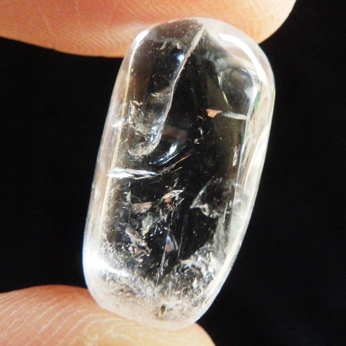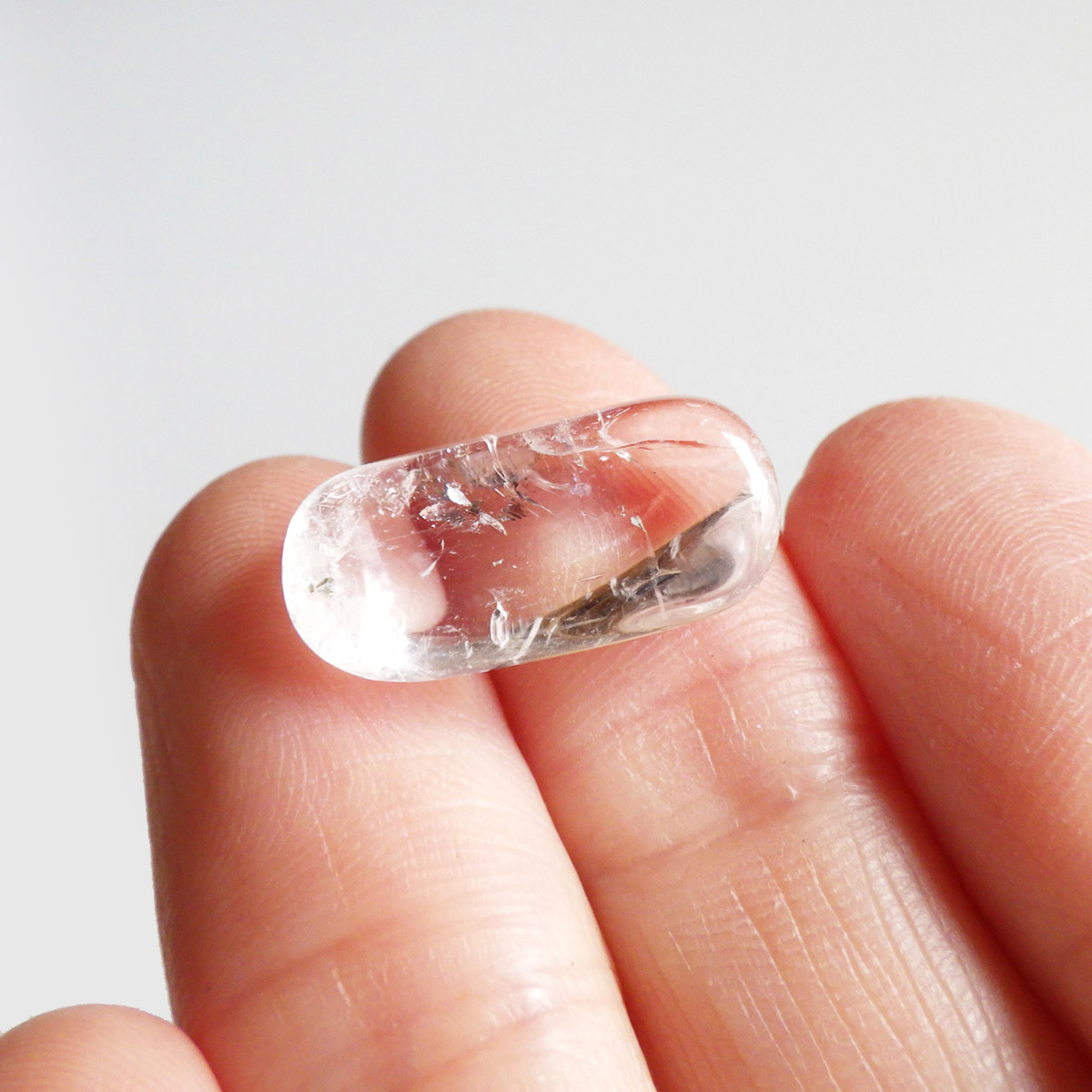 メキシコ産、ダンビュライトのタンブルです。 ダンビュライトはダイヤモンドの代用品として使われることもある石で、結晶の形はトパーズそっくりです。透明度と輝きは美しいの一言。レインボーも含まれ、基本的に透明ですが、僅かにほんのりとピンク色をしています。小さいながらも、心を奪われる魅力的なタンブルです。