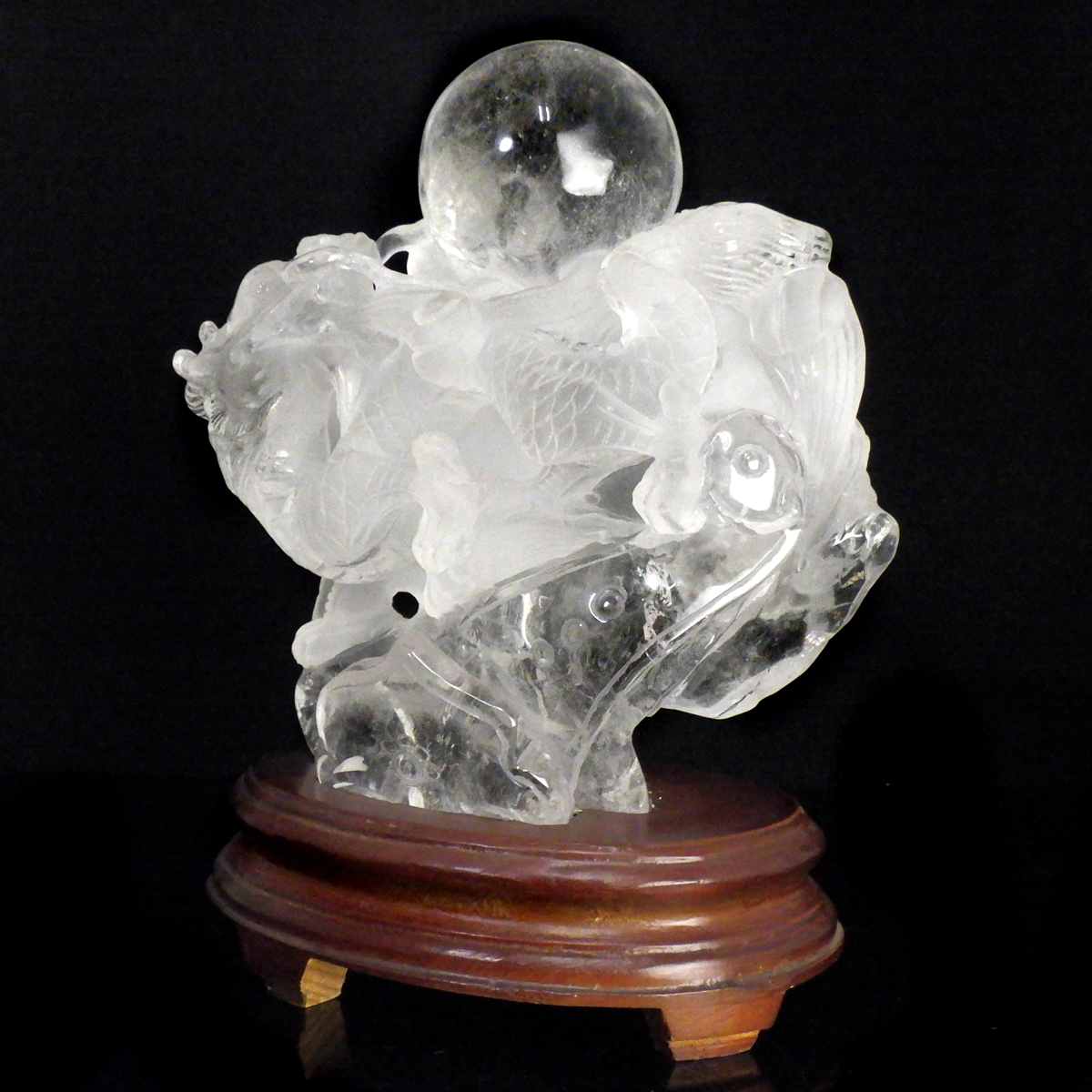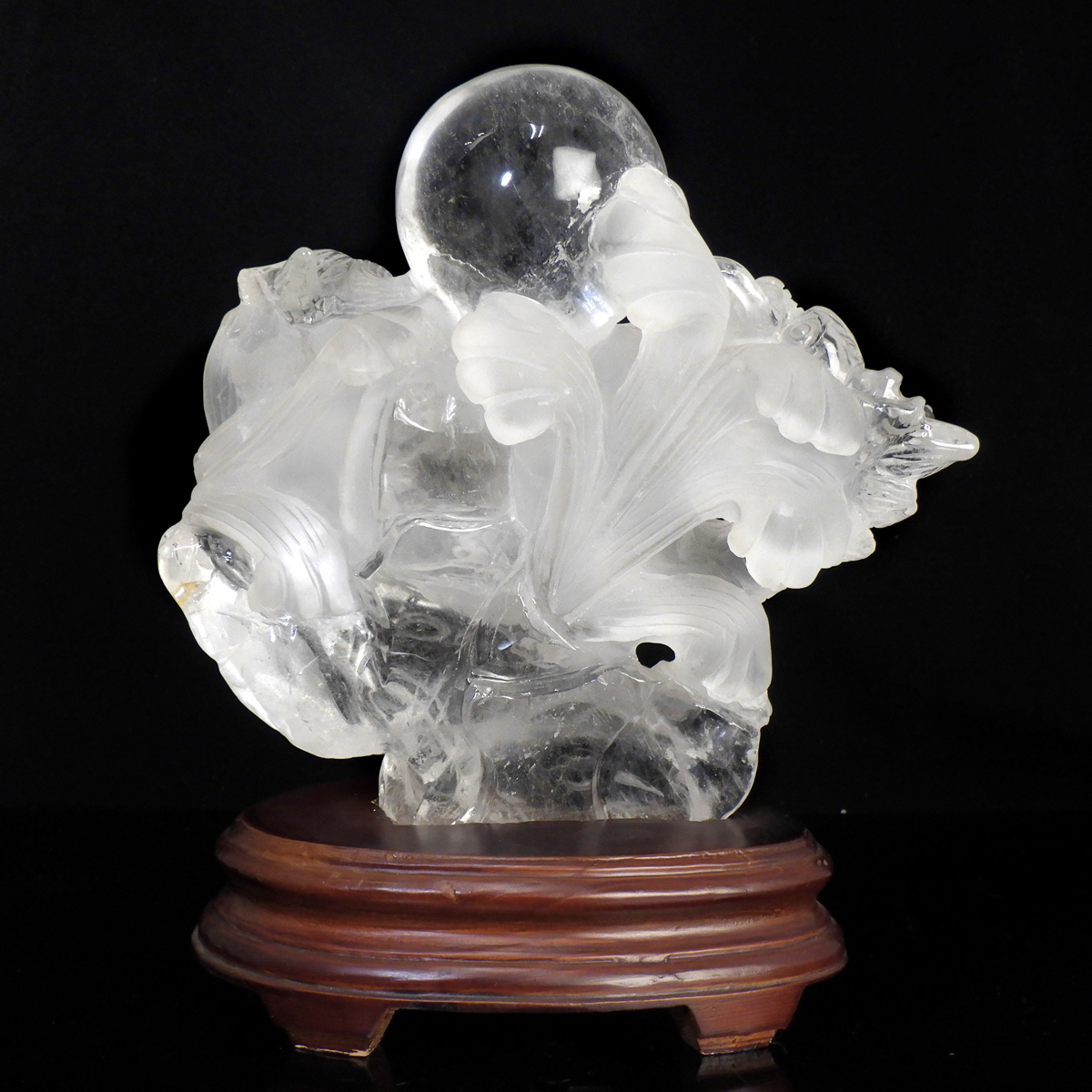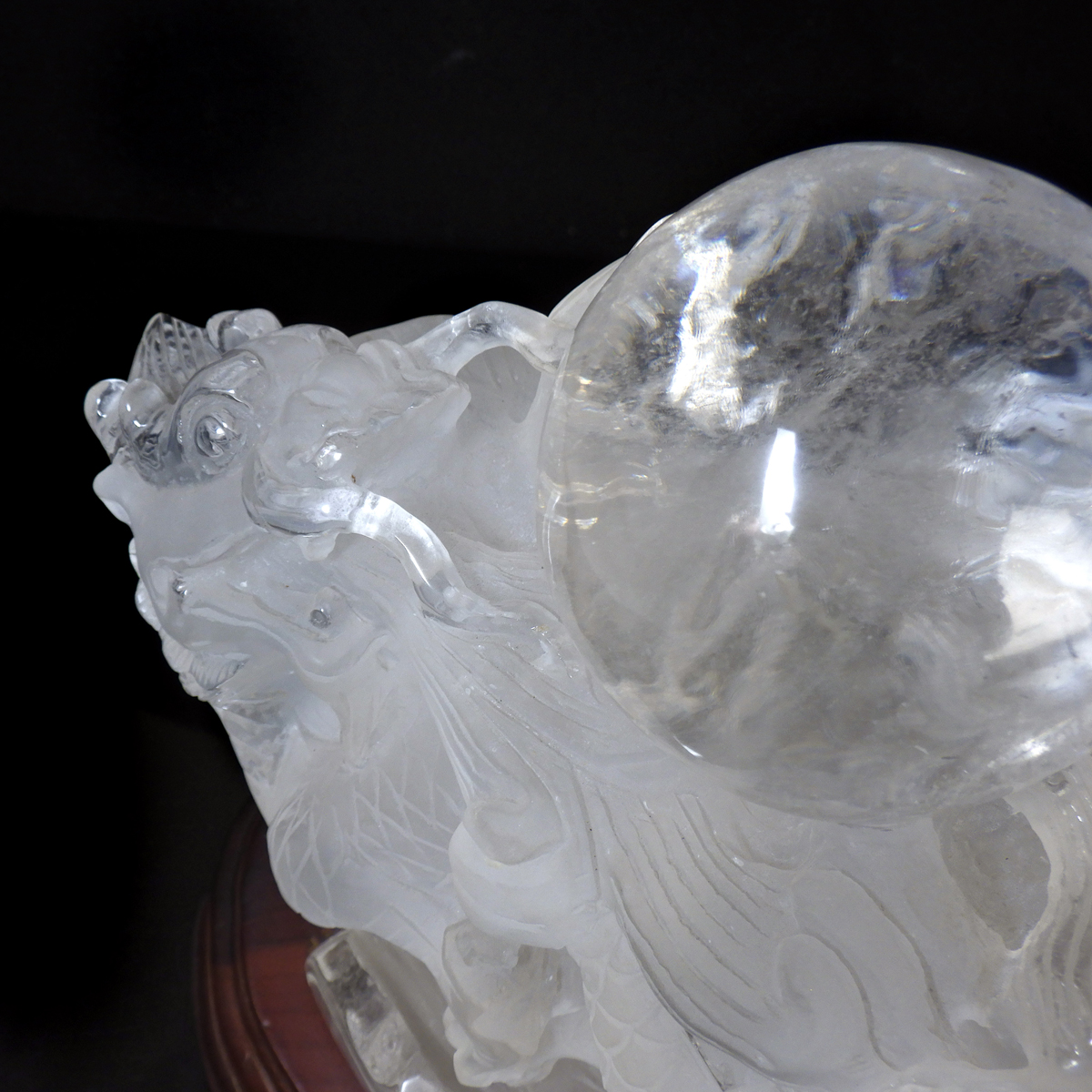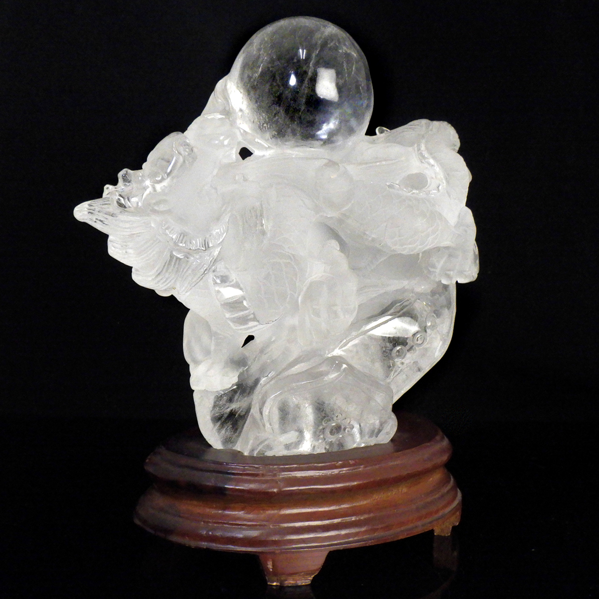 高い透明度の水晶で、龍はマットに仕上げており、迫力がある手彫りになっています。また所々にあるレインボーが美しい一点です。