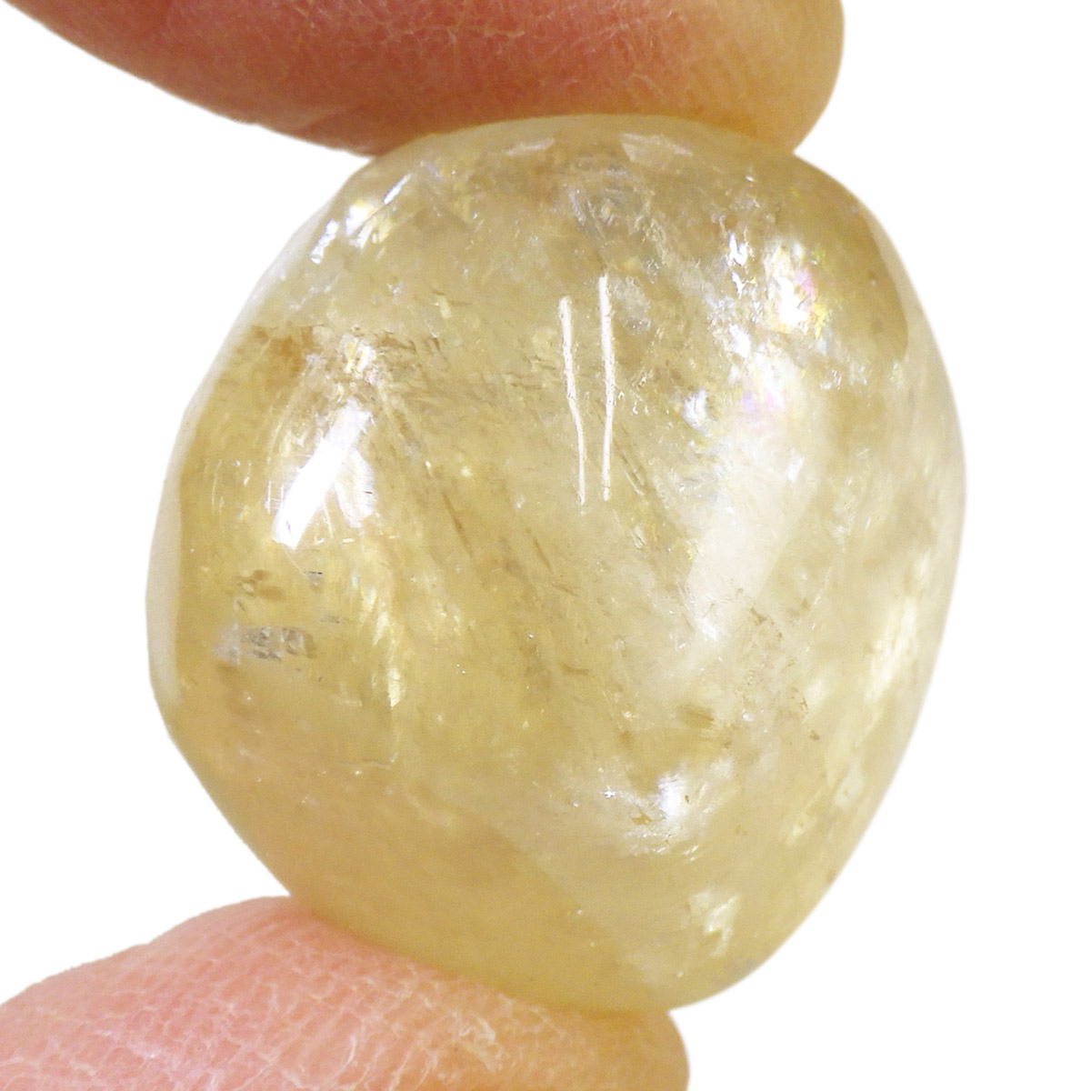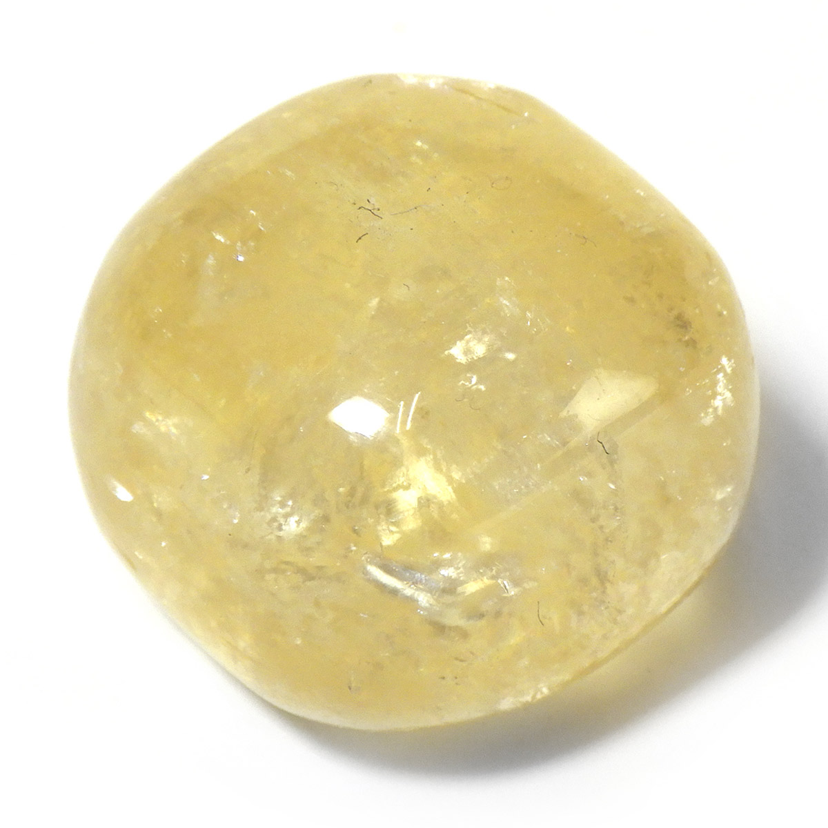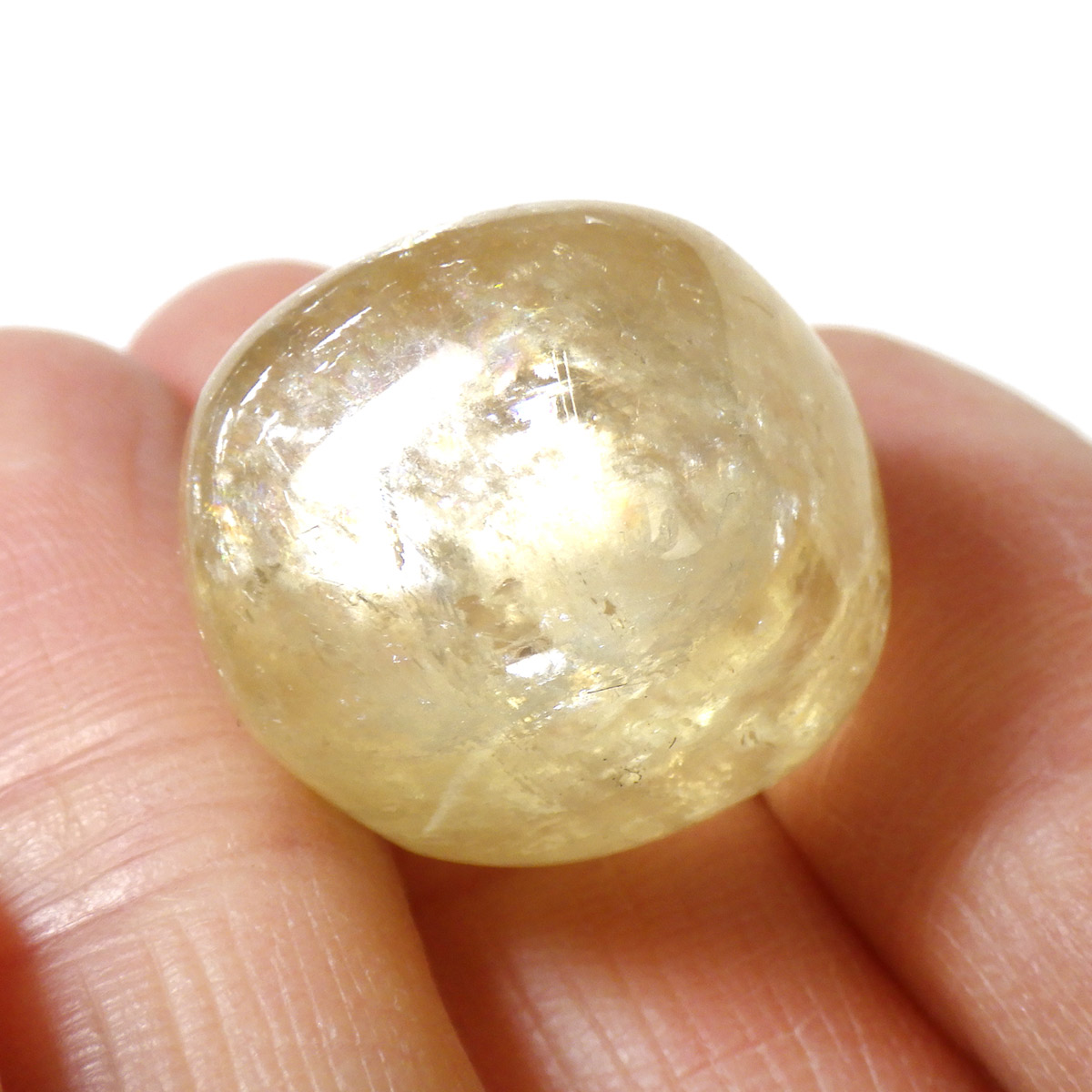 ブラジル産のゴールデンカルサイト、タンブルです。 オレンジカルサイトより透明感があり、黄金色の輝きの中にレインボーが確認できます。様々な表情でひかりますので、ぜひ自然光の元、手に乗せて光を楽しんでみてください。