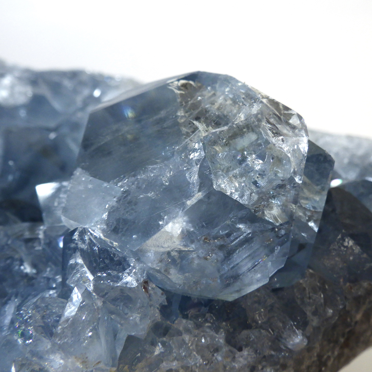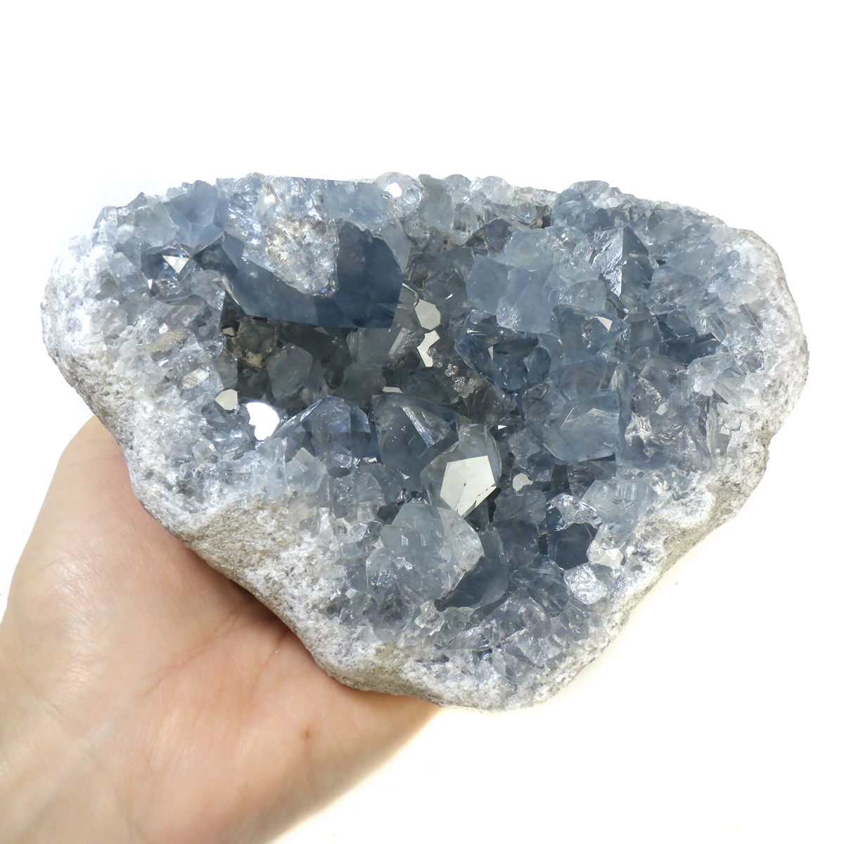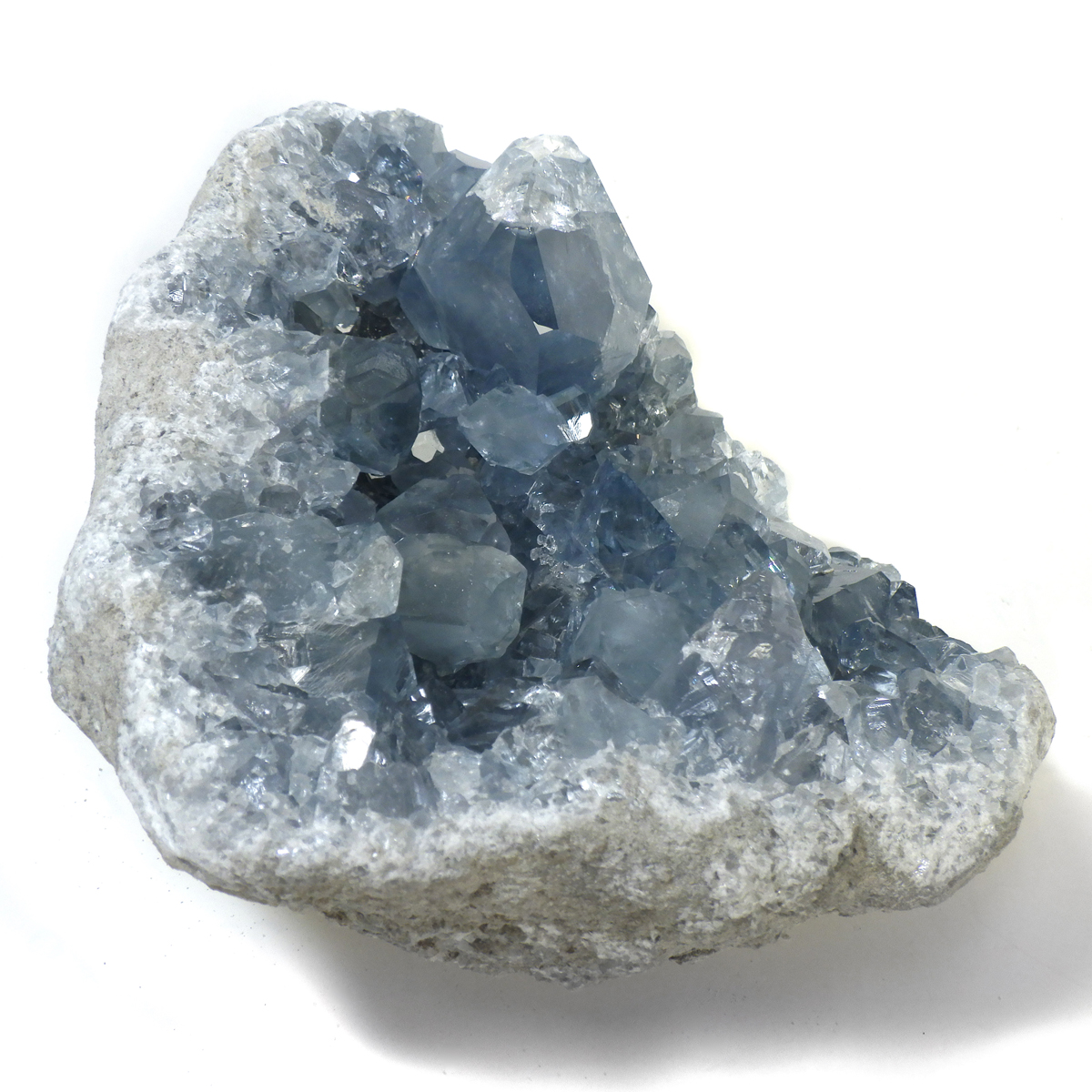 セレスタイト(天青石)母岩付きクラスターです。マダガスカル産のものは、母岩が丸みを帯びており、土台が白っぽいのが特徴です。 土台から突き出た、透明感あるブルーの結晶は非常に魅力的です。結晶が大きく艶のある濃い色が特徴です。