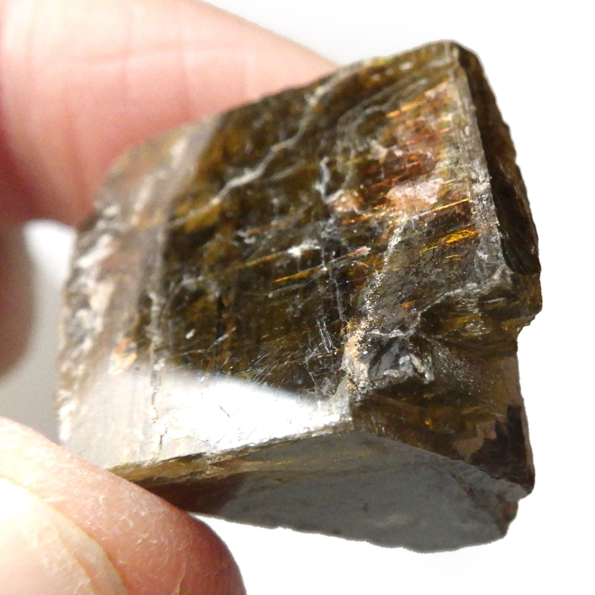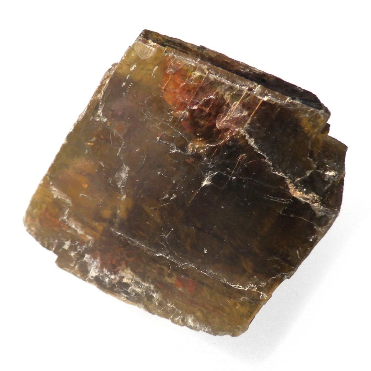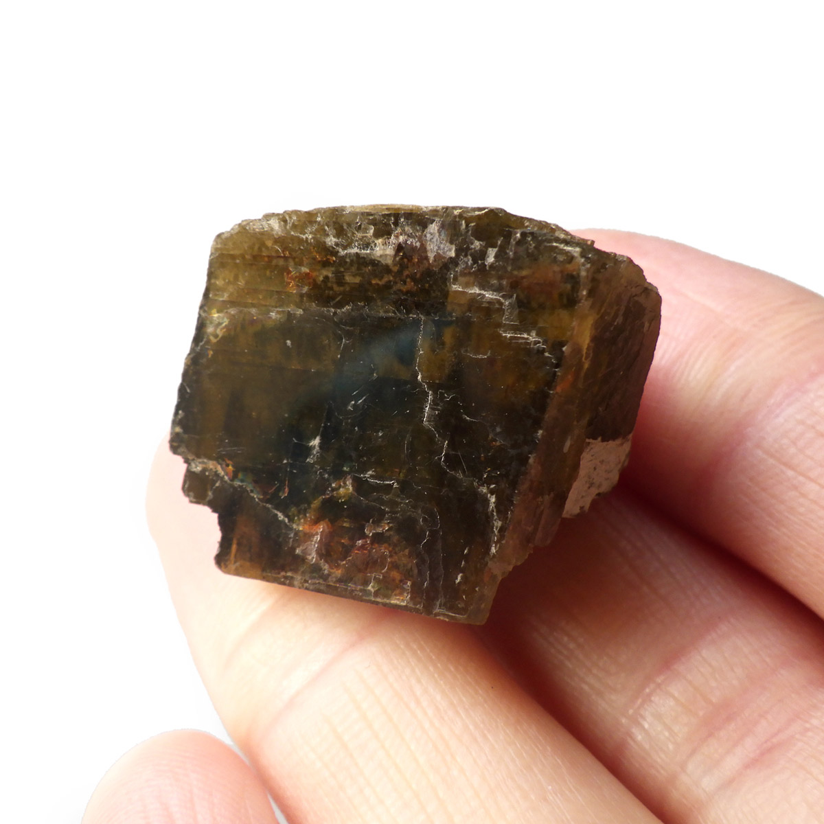 ブラジル・ミナスジェライス州産のシデライト原石です。和名は菱鉄鉱。菱鉄鉱は方解石と同じ結晶構造を持つ菱面体の結晶になります。硬度は比較的低く劈開性があります。色は黄褐色から暗褐色でガラス光沢を示す部分も見られます。表面に僅かながらレインボーのような虹の波紋も見られます。ライトなどで光に透かすとイエローが際立ちとてもきれいです。