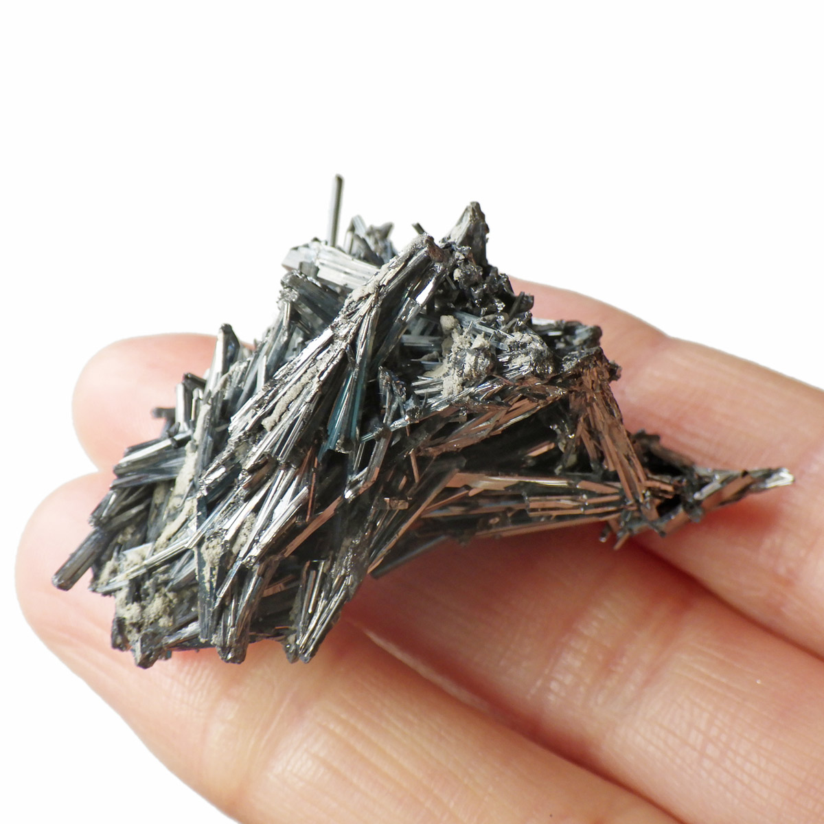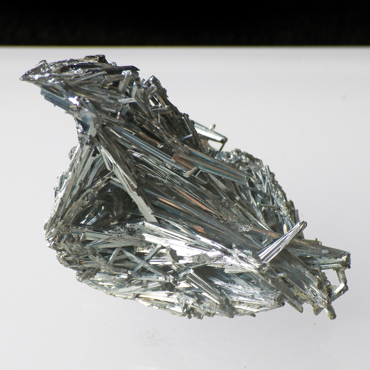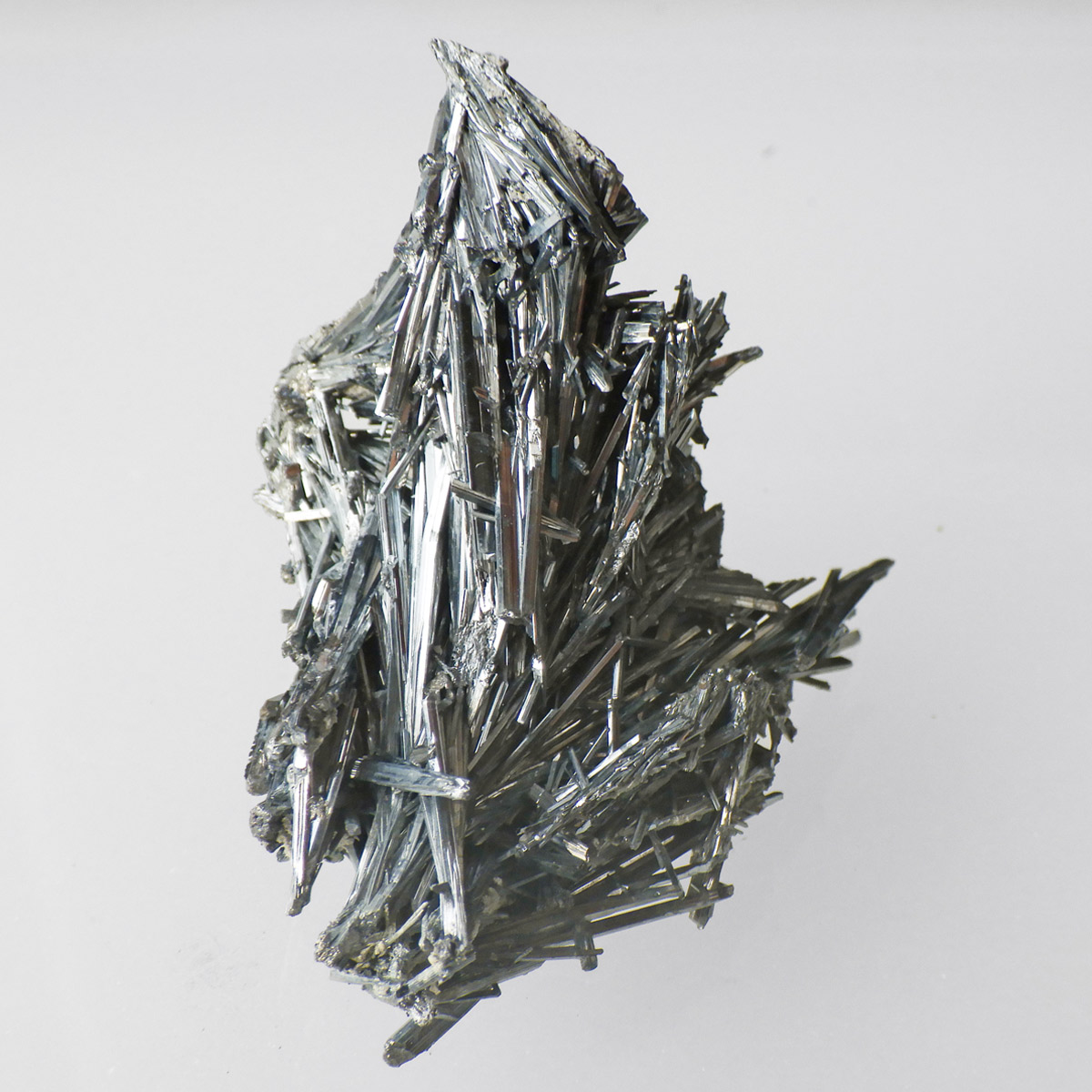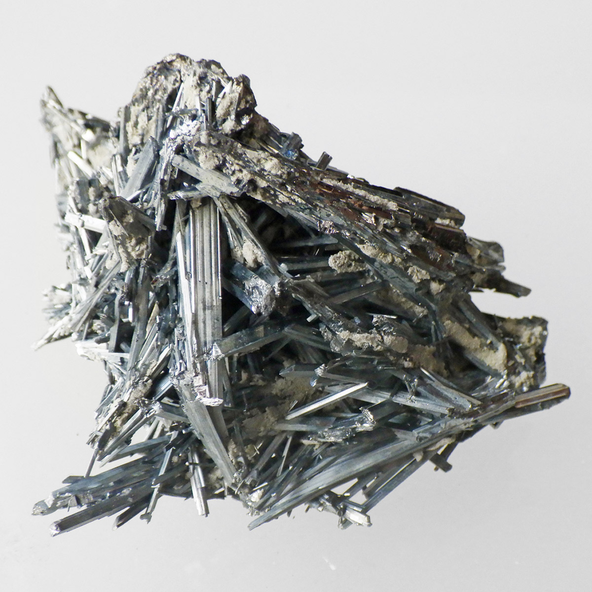 チャイナ産のスティブナイト原石です。和名は輝安鉱。天然のアンチモン化合物。希少鉱物でアンチモン自体はレアメタルに分類されています。シルバーメタルに輝く、金属光沢が非常に美しい鉱物です。硬度は2と低く扱いに注意が必要です。