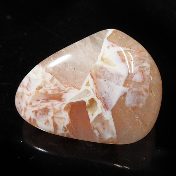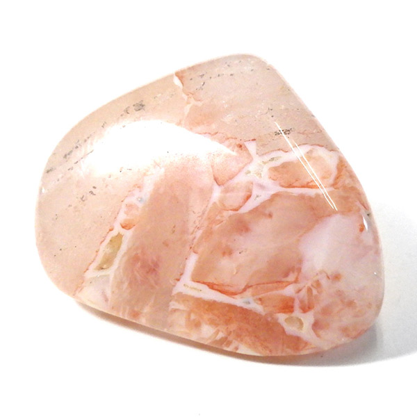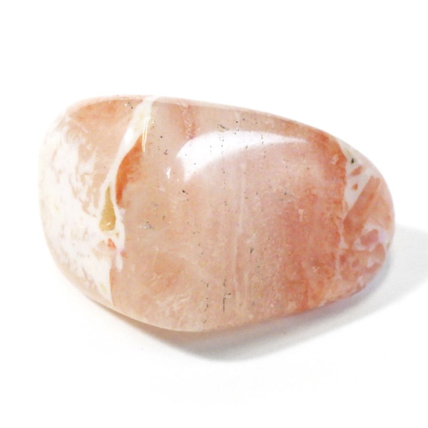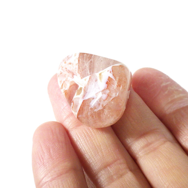 インド産のムーランクォーツ、タンブルです。ムーランクォーツは南インドに産するクォーツで、ヘマタイトによる赤い発色と、オパーライズド(オパール化)された部分がマーブル状に模様を描いています。オパールカルセドニーインクォーツという呼称で流通したこともある人気の石です。エンジェルシリカやジェムシリカといった類の希有な成長を遂げた石になります。