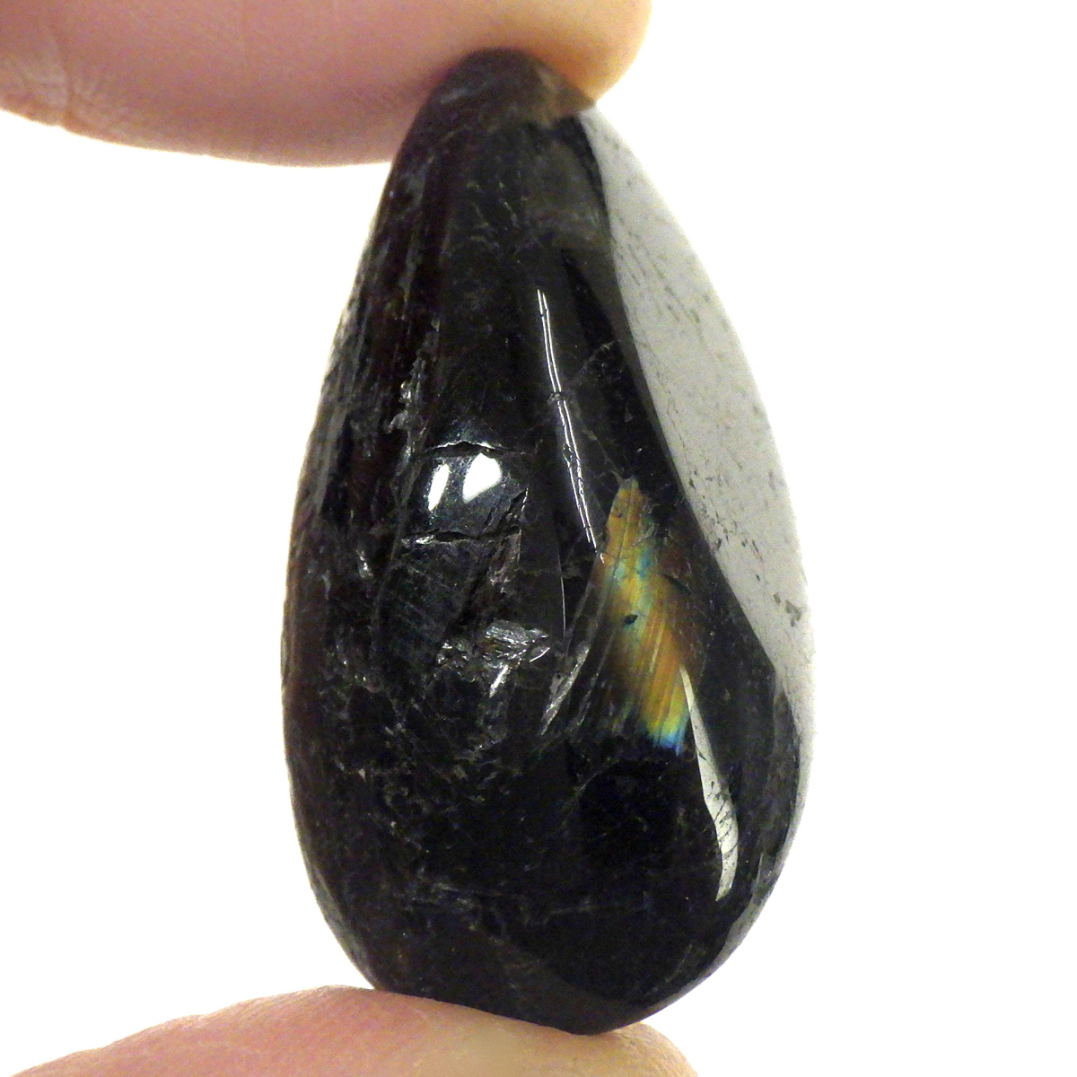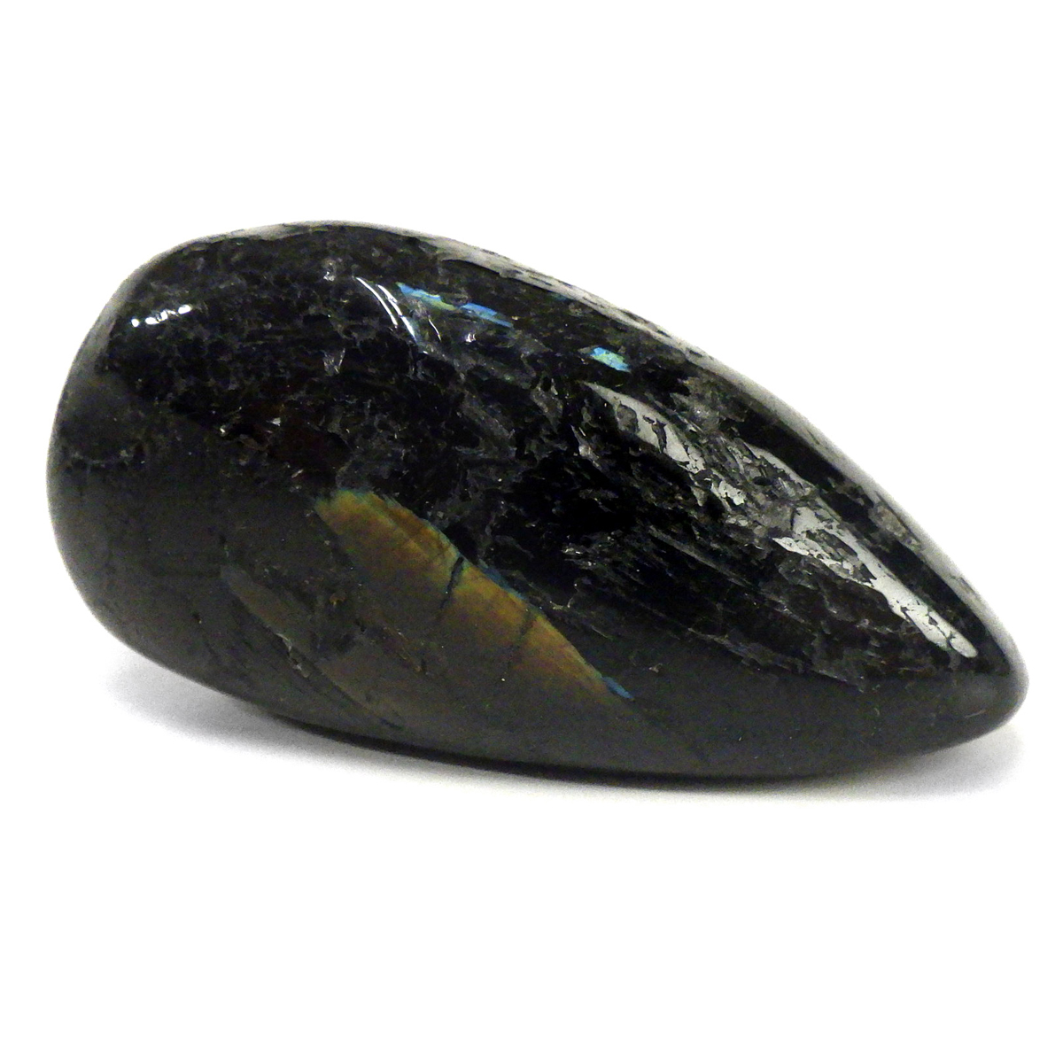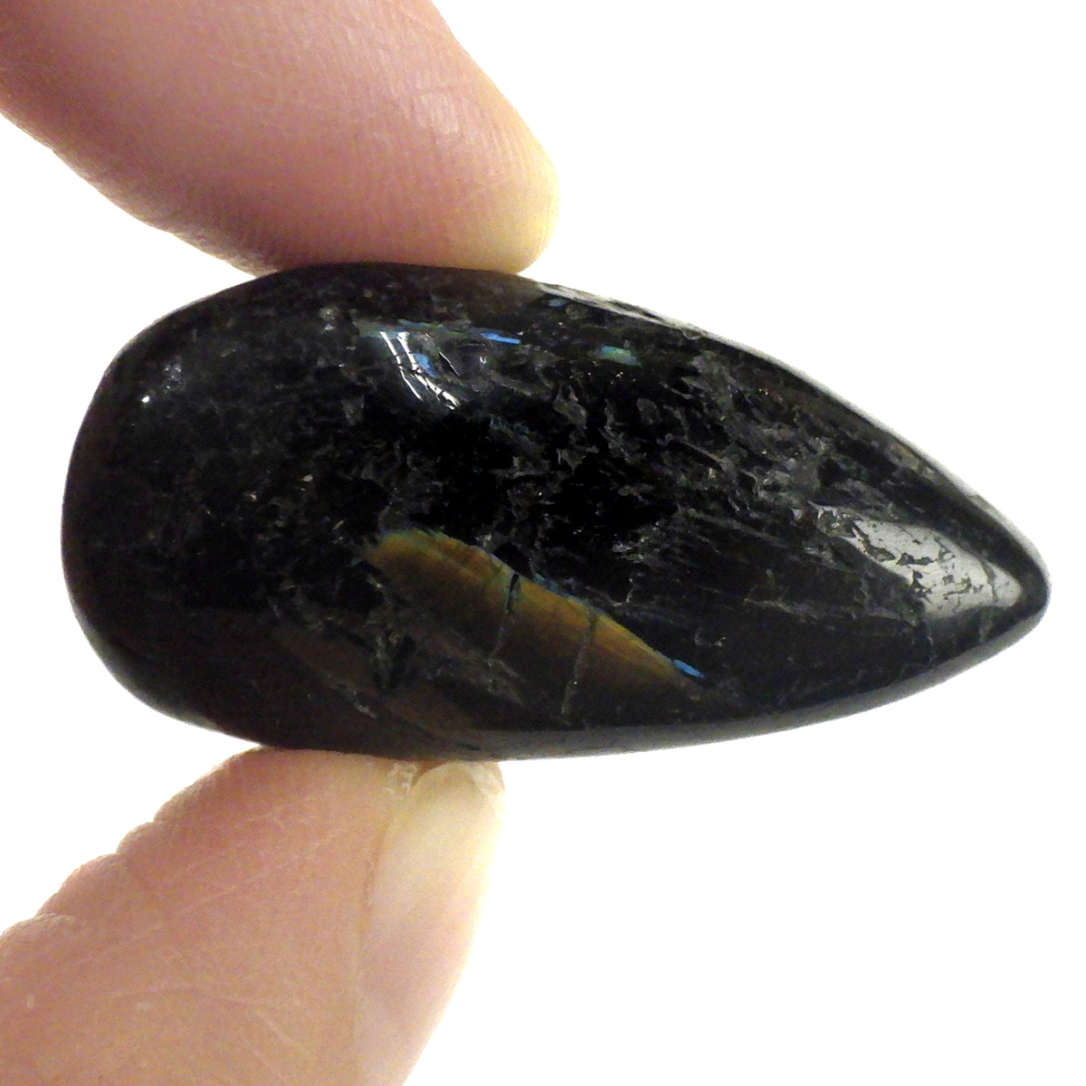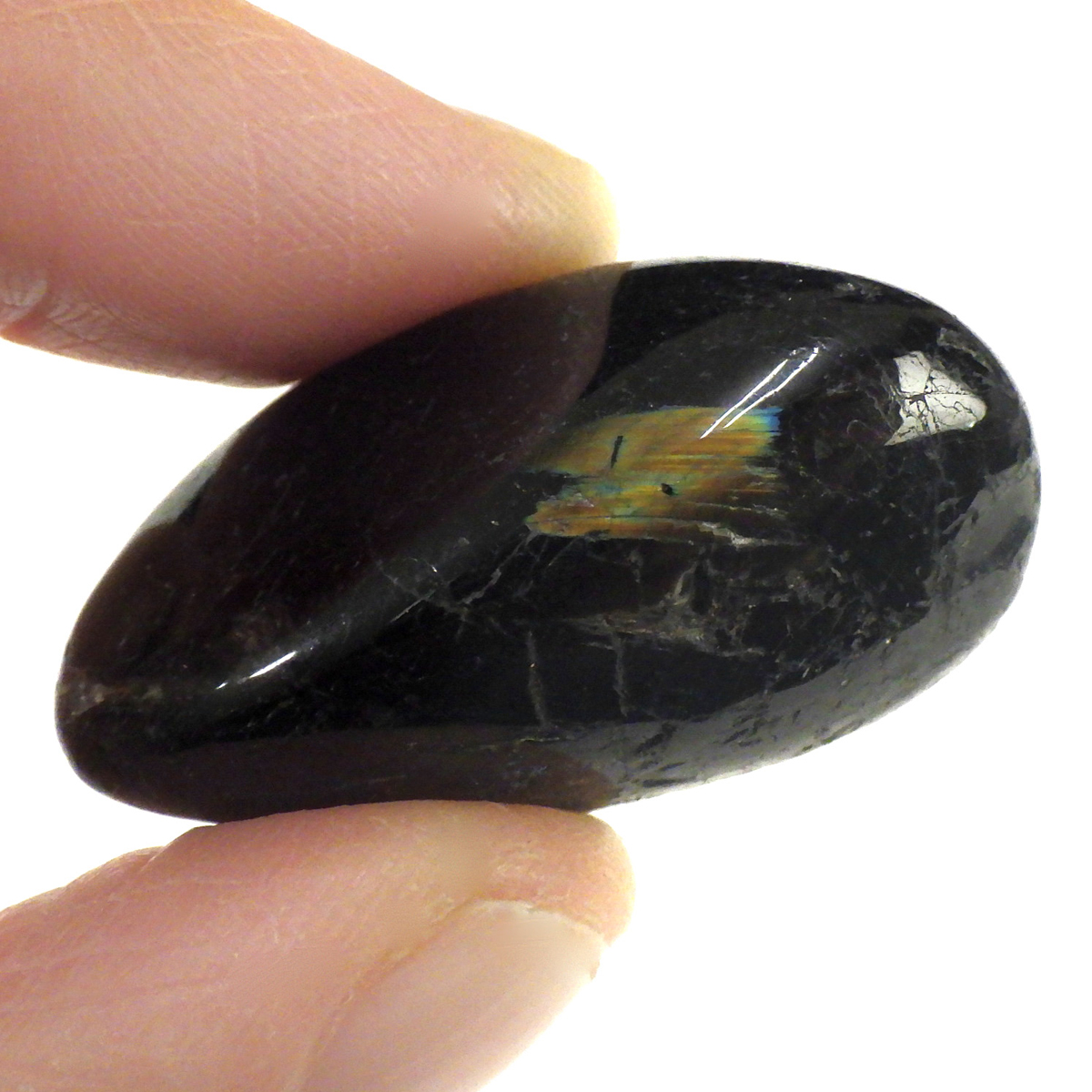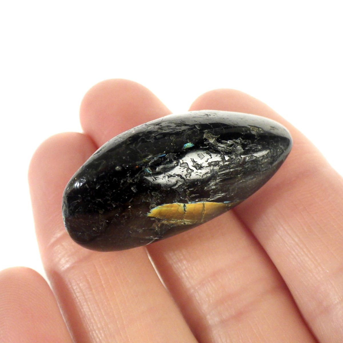 グリーンランド産の高品質ヌーマイト、タンブルです。 ヌーマイトは、1982年にグリーンランドのヌーク地方で発見され、地名に因んで名づけられました。ヌーマイト自体は30億年前から地球に存在したといわれる石で、気の遠くなるような年月を経て現代に現れた石だといわれています。和名は角閃石片麻岩。アンソフィライトやゲドライト、石英、など多様なミネラルを含んでいるといわれています。一見、真っ黒い石に見えますが、光の角度によって鮮やかなゴールド、グリーン、ブルーなどのさまざまな色の閃光を示します。グリーンランド産のヌーマイトの虹色は、極微視的なアンソフィライトとゲドライトの交互の溶出ラメラ構造から反射された光の干渉によるものということです。世界で最も美しいと知られるのがグリーンランドのヌーマイトといわれています。
