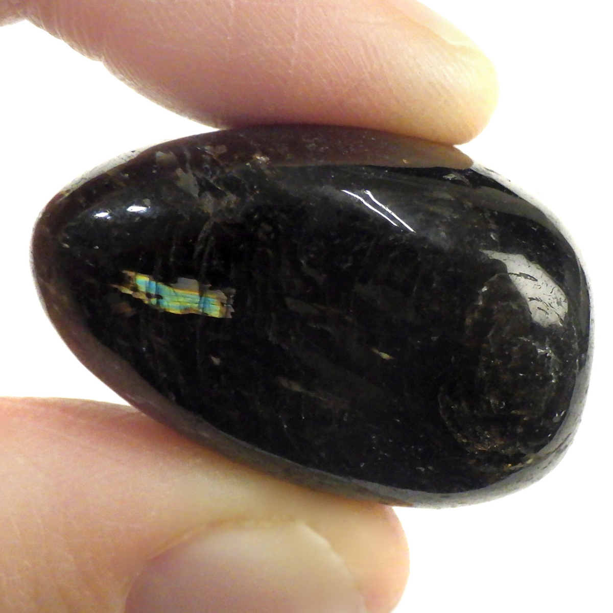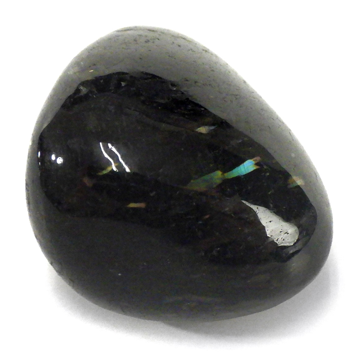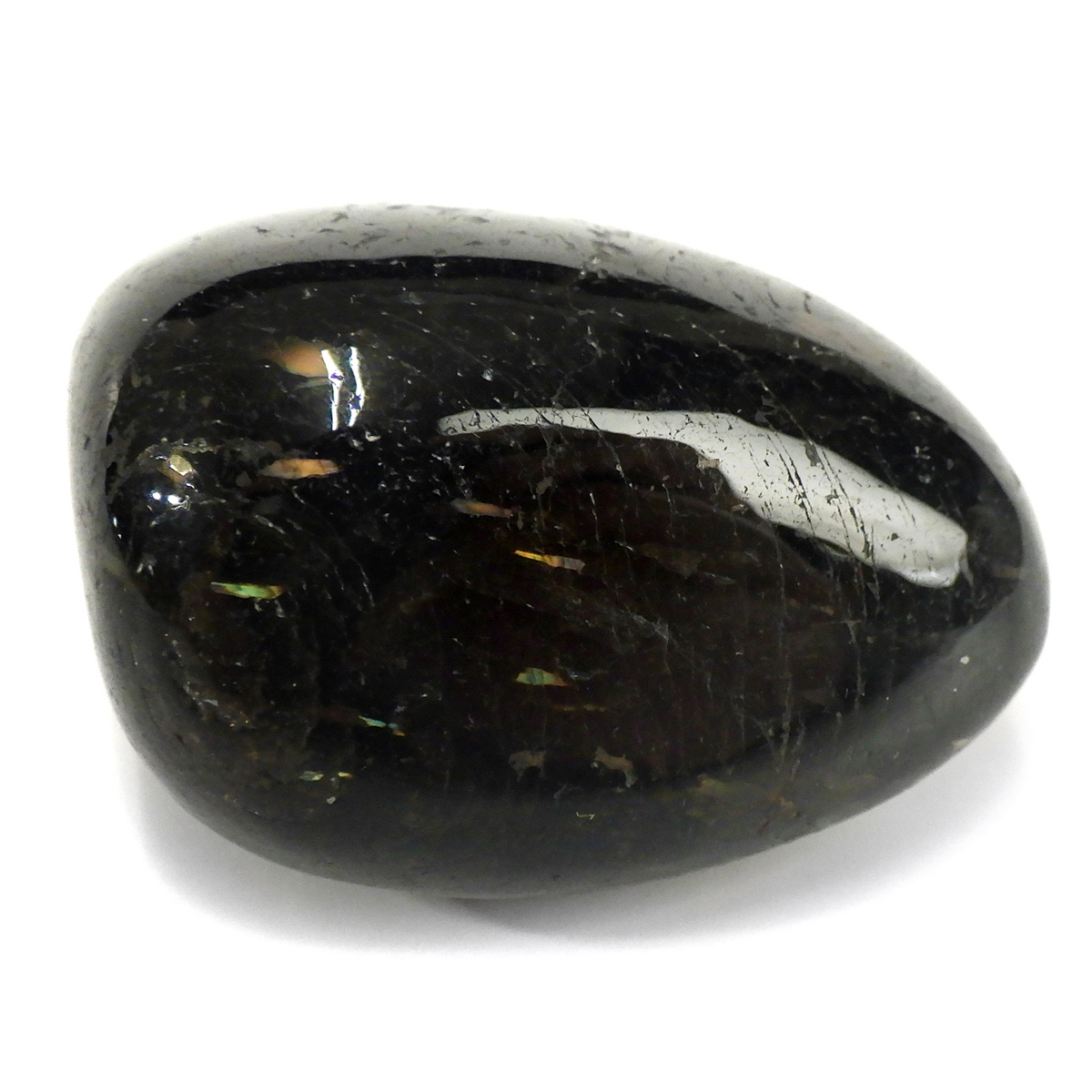 グリーンランド産の高品質ヌーマイト、タンブルです。 ヌーマイトは、1982年にグリーンランドのヌーク地方で発見され、地名に因んで名づけられました。ヌーマイト自体は30億年前から地球に存在したといわれる石で、気の遠くなるような年月を経て現代に現れた石だといわれています。和名は角閃石片麻岩。アンソフィライトやゲドライト、石英、など多様なミネラルを含んでいるといわれています。一見、真っ黒い石に見えますが、光の角度によって鮮やかなゴールド、グリーン、ブルーなどのさまざまな色の閃光を示します。グリーンランド産のヌーマイトの虹色は、極微視的なアンソフィライトとゲドライトの交互の溶出ラメラ構造から反射された光の干渉によるものということです。世界で最も美しいと知られるのがグリーンランドのヌーマイトといわれています。