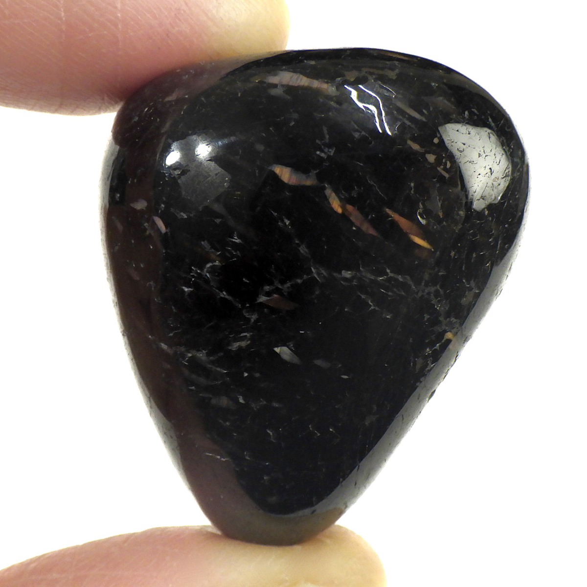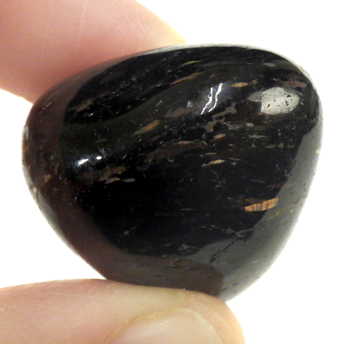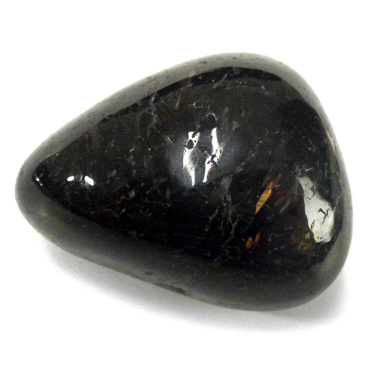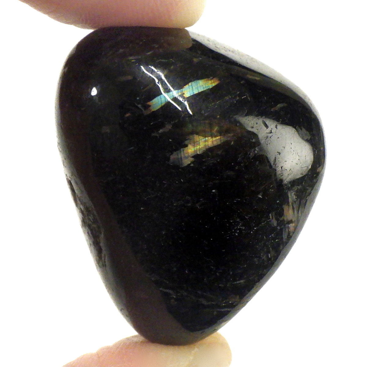 グリーンランド産の高品質ヌーマイト、タンブルです。 ヌーマイトは、1982年にグリーンランドのヌーク地方で発見され、地名に因んで名づけられました。ヌーマイト自体は30億年前から地球に存在したといわれる石で、気の遠くなるような年月を経て現代に現れた石だといわれています。和名は角閃石片麻岩。アンソフィライトやゲドライト、石英、など多様なミネラルを含んでいるといわれています。一見、真っ黒い石に見えますが、光の角度によって鮮やかなゴールド、グリーン、ブルーなどのさまざまな色の閃光を示します。グリーンランド産のヌーマイトの虹色は、極微視的なアンソフィライトとゲドライトの交互の溶出ラメラ構造から反射された光の干渉によるものということです。世界で最も美しいと知られるのがグリーンランドのヌーマイトといわれています。