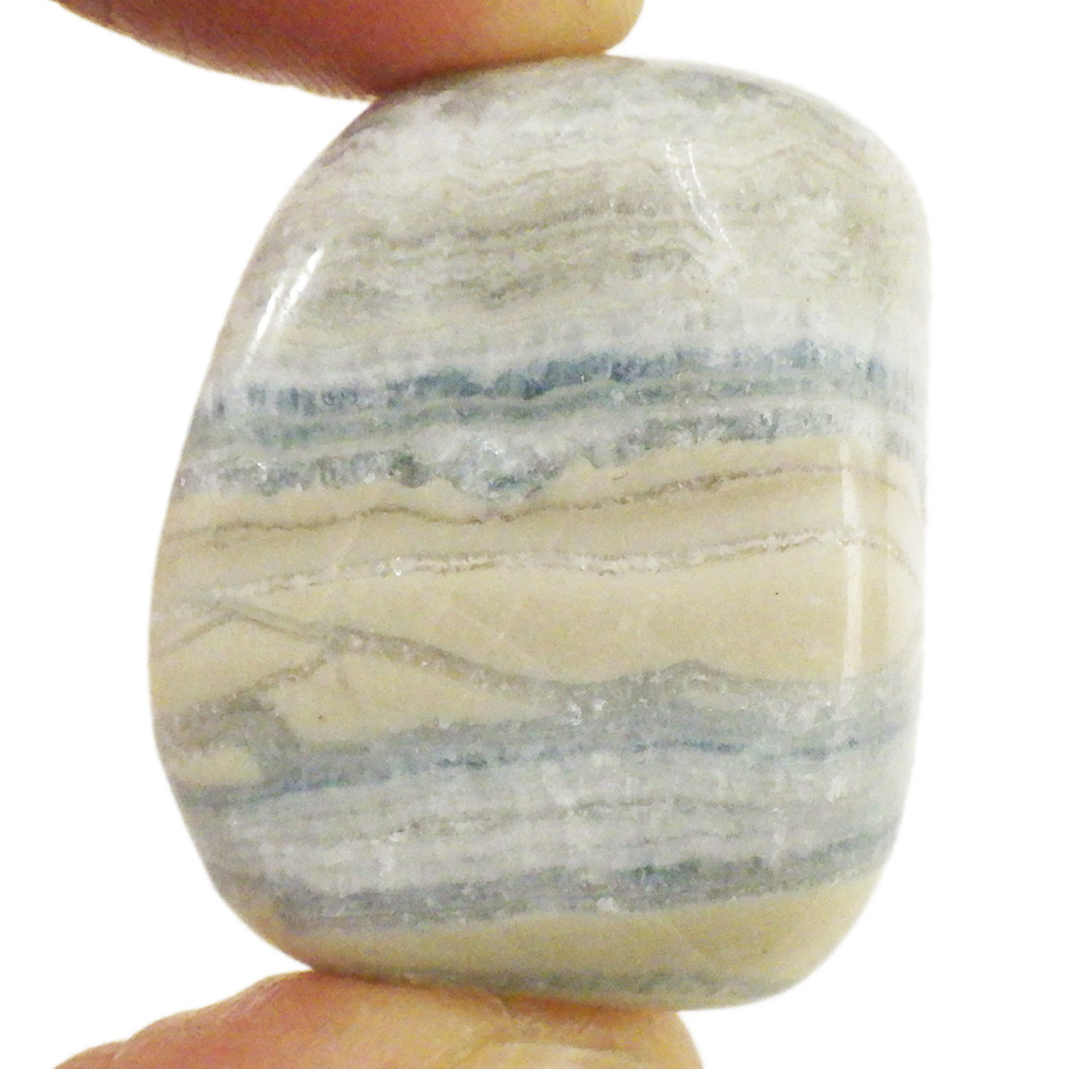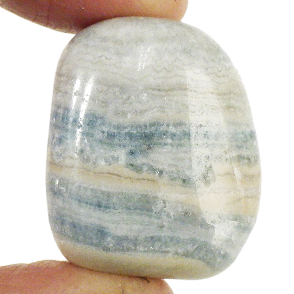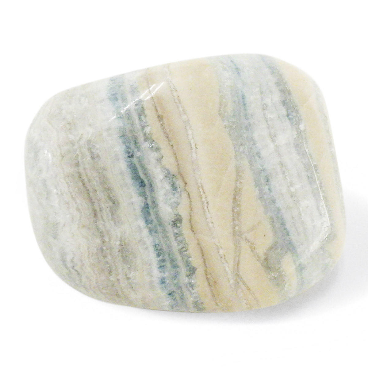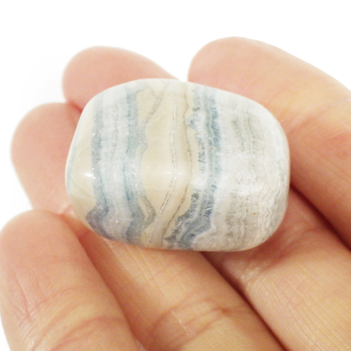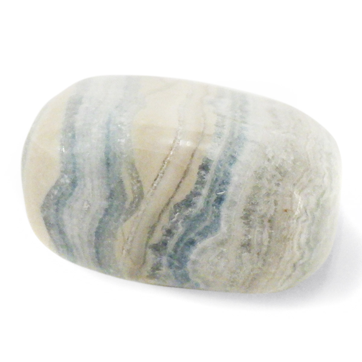 トルコ産ブルーシェーライト(シーライト)、タンブルです。この心静まるような美しいブルーの石はトルコの鉱山で唯一産出される混合石です。ブルーシェーライト(シーライト)と呼ばれていますが、厳密には主にドロマイトとカルサイトの混合物だそうです。クリーム色、金色または黄色の濃い部分はシェーライトで、青い部分はブルードロマイトです。青い縞模様(レース)が入ることから、ラピスレースオニキスという可愛らしいニックネームでも流通しております。欧米では少しづつ認知が進んでおりますが、日本ではまだまだ稀少なレアストーンです。