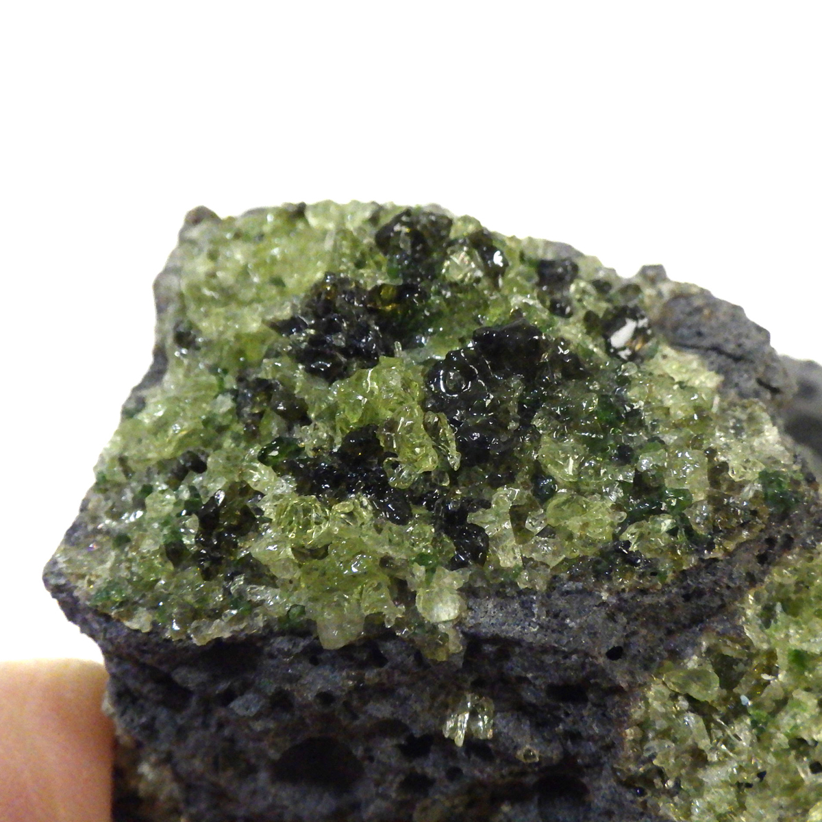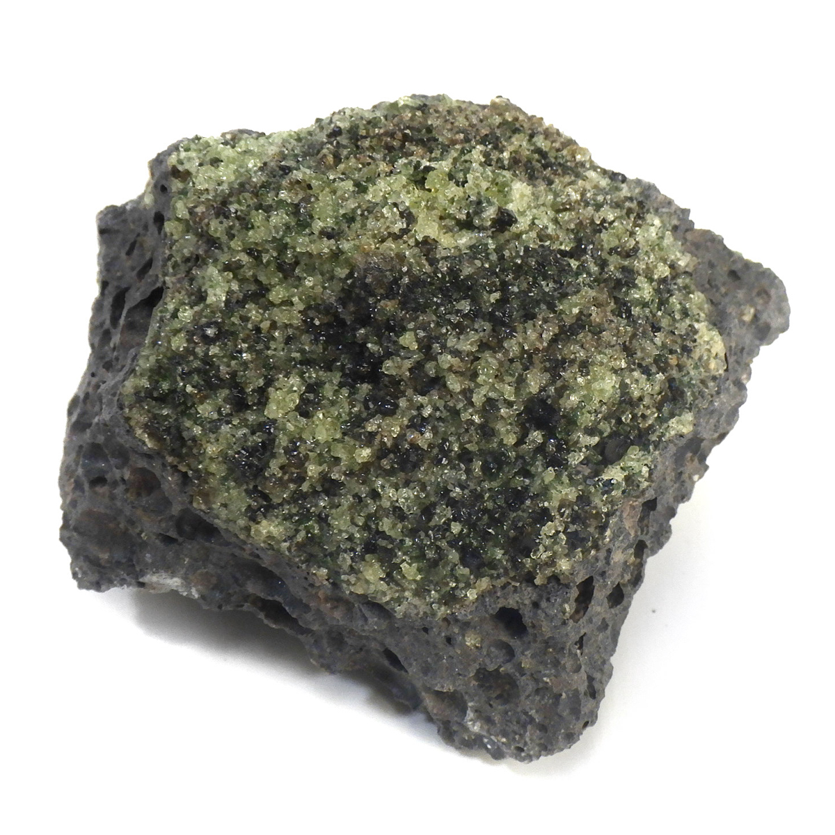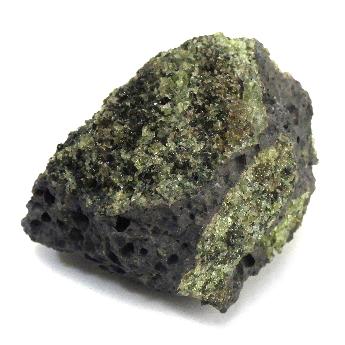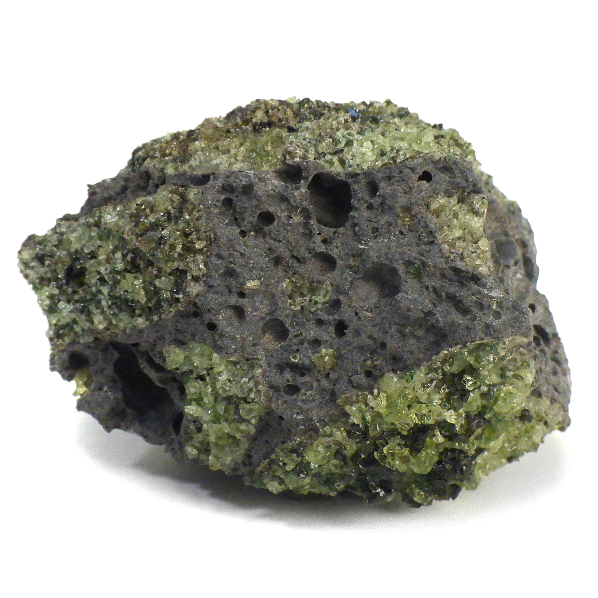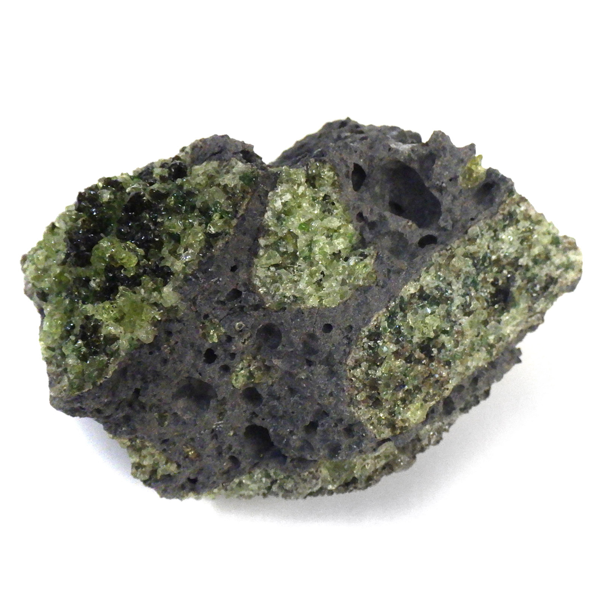 アメリカ・アリゾナ州産のペリドット母岩付き原石です。鉱物名をオリビンと呼ぶのですが、日本では宝石名のペリドットが浸透しています。和名は橄欖(かんらん)石といいます。主にグリーンの結晶がかんらん石でグレーの母岩が玄武岩です。かんらん石は月の岩石や石質隕石、石鉄隕石にも含まれており、鉄の含有量によって、白色から黒色まで色調が変化します。かんらん石は地球の上部マントルの主要構成鉱物でマグマの噴火によって溶岩の塊に運ばれて地表に出てきます。まさにその姿を切り取ったようなこの原石は、様々な濃淡の結晶が多面にわたり観察できます。
