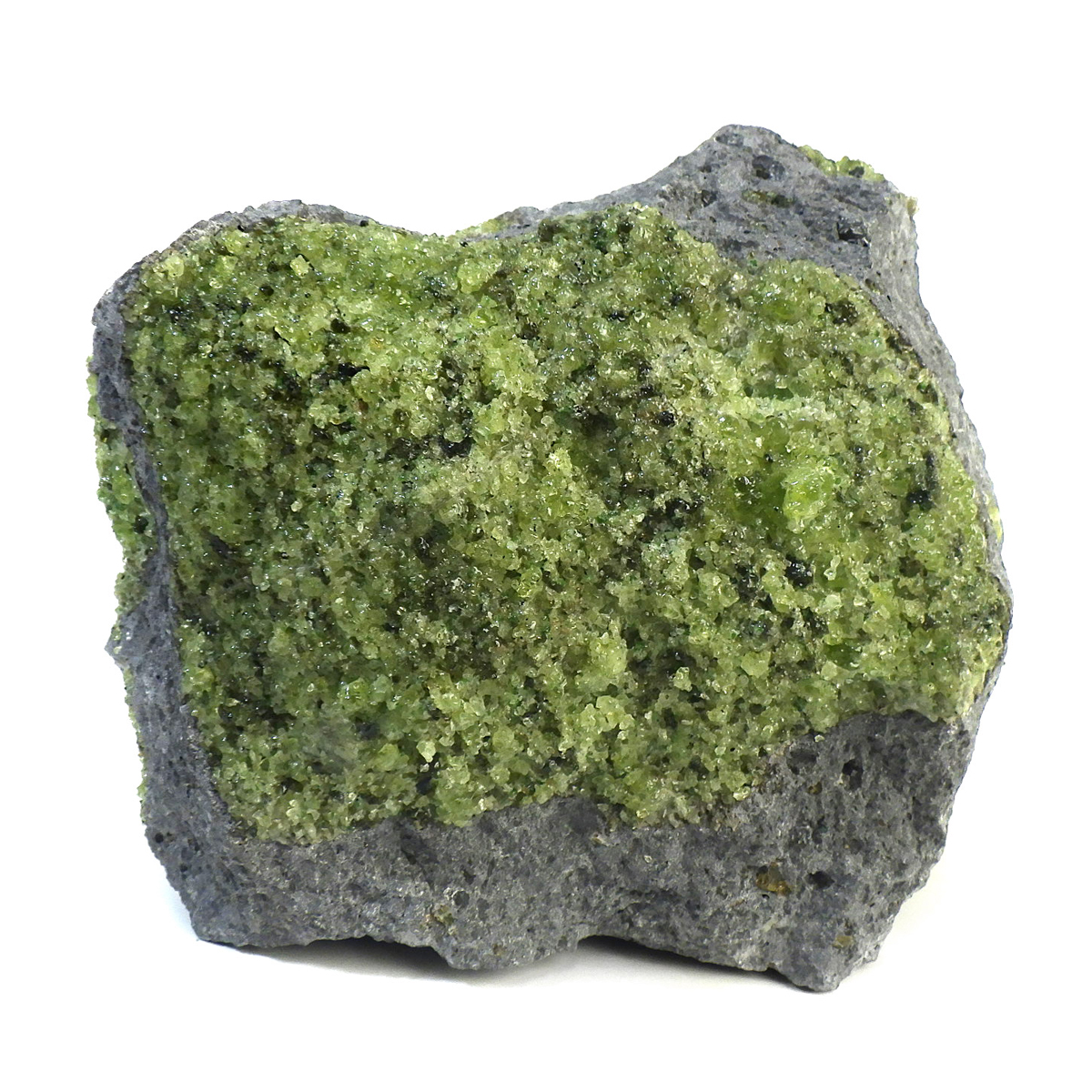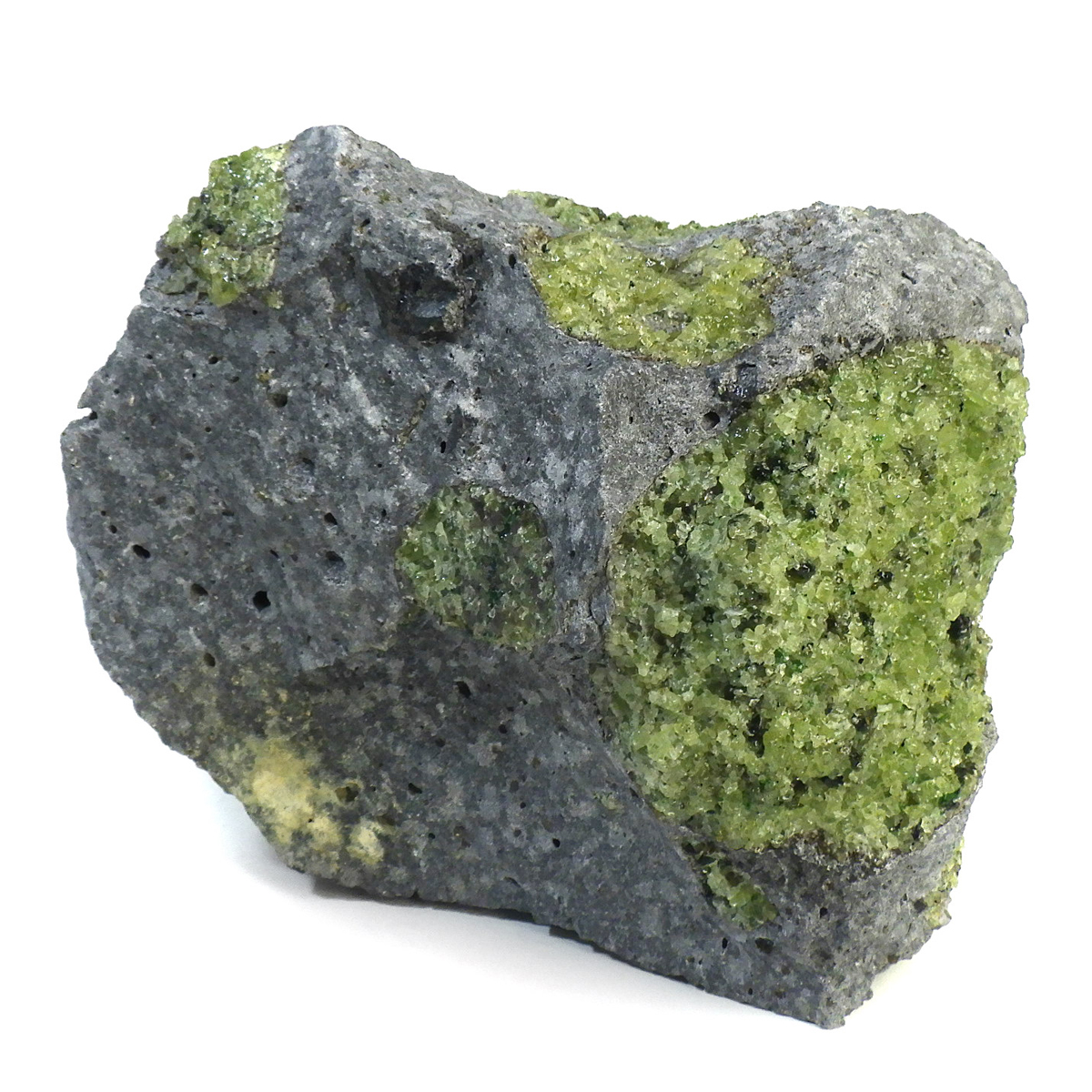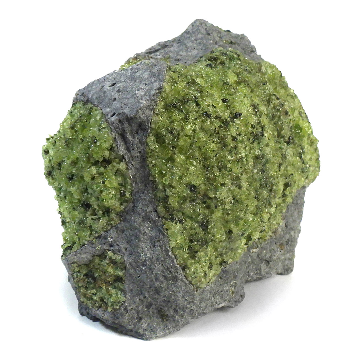 アメリカ・アリゾナ州産のペリドット母岩付き原石です。鉱物名をオリビンと呼ぶのですが、日本では宝石名のペリドットが浸透しています。和名は橄欖(かんらん)石といいます。主にグリーンの結晶がかんらん石でグレーの母岩が玄武岩です。かんらん石は月の岩石や石質隕石、石鉄隕石にも含まれており、鉄の含有量によって、白色から黒色まで色調が変化します。かんらん石は地球の上部マントルの主要構成鉱物でマグマの噴火によって溶岩の塊に運ばれて地表に出てきます。まさにその姿を切り取ったようなこの原石は、様々な濃淡の結晶が多面にわたり観察できます。