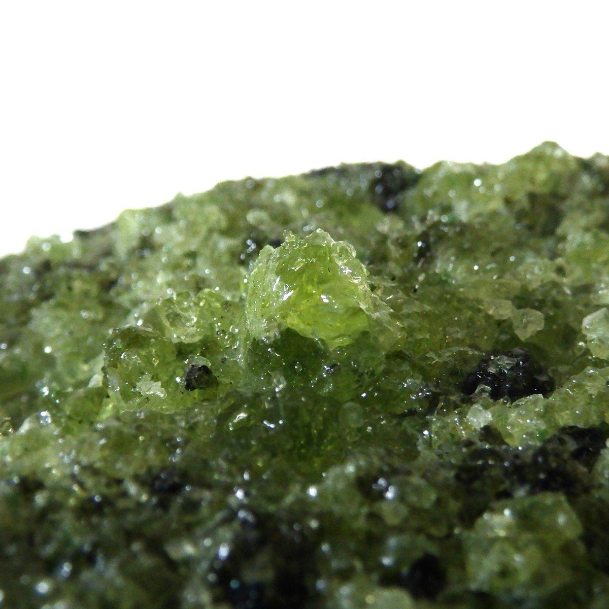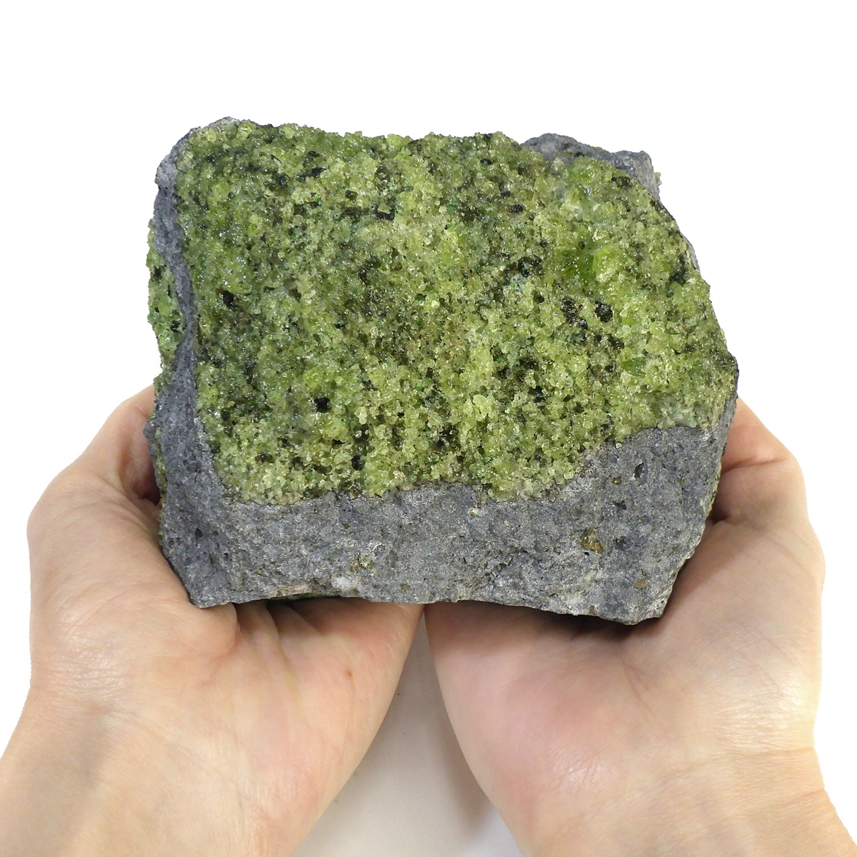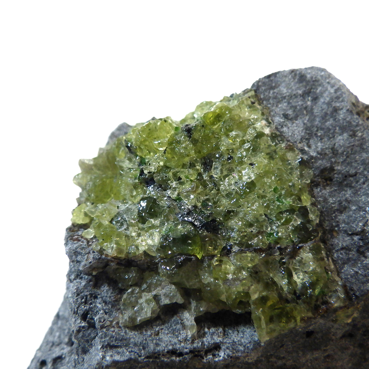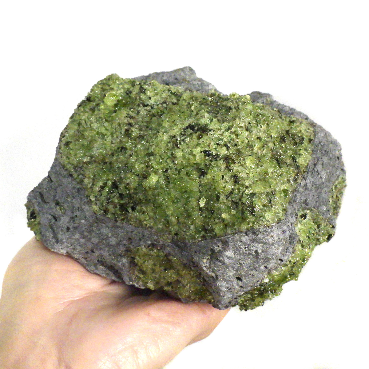 アメリカ・アリゾナ州産のペリドット母岩付き原石です。鉱物名をオリビンと呼ぶのですが、日本では宝石名のペリドットが浸透しています。和名は橄欖(かんらん)石といいます。主にグリーンの結晶がかんらん石でグレーの母岩が玄武岩です。かんらん石は月の岩石や石質隕石、石鉄隕石にも含まれており、鉄の含有量によって、白色から黒色まで色調が変化します。かんらん石は地球の上部マントルの主要構成鉱物でマグマの噴火によって溶岩の塊に運ばれて地表に出てきます。まさにその姿を切り取ったようなこの原石は、様々な濃淡の結晶が多面にわたり観察できます。