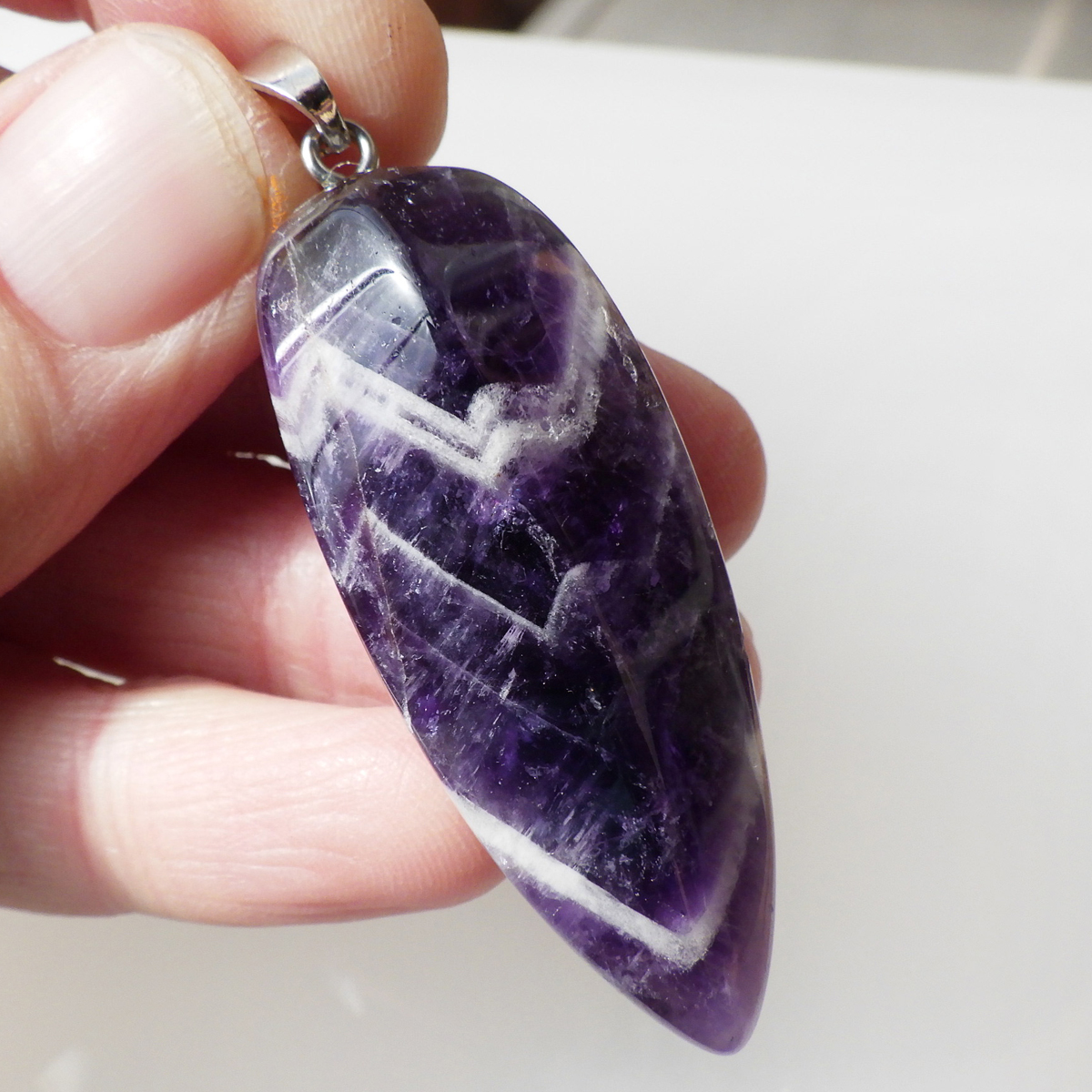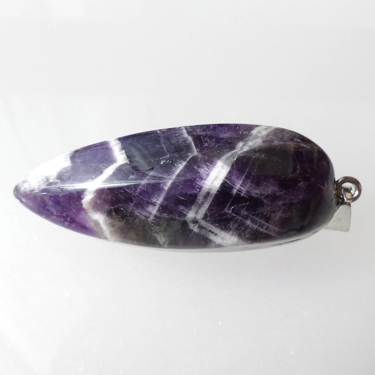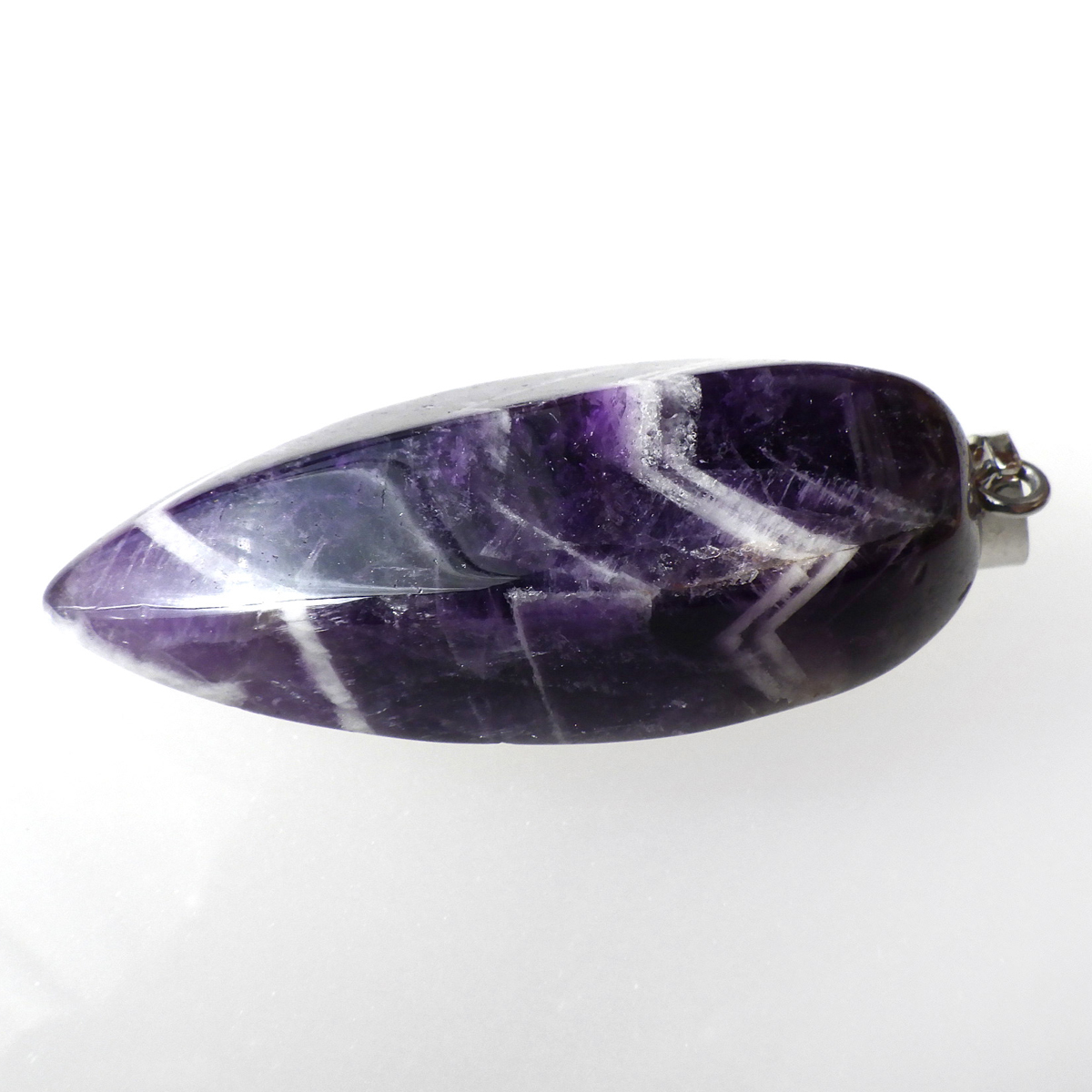 ブラジル産、シェブロンアメジストのペンダントトップです。 シェブロンとは、層状の紋章模様がギザギザと山形に見えることから、山を意味する言葉です。 シェブロンアメジストは、濃淡のある紫色のアメジストと、細い線状の白色をした石英が交互に重なりながら層状に成長し、このような模様が形成されているのです。ヒーリングの世界でも、大変すぐれた物とされて重宝されているそうです。濃い紫とくっきりとした白い紋章模様のラインが美しい品質の良い一点です。