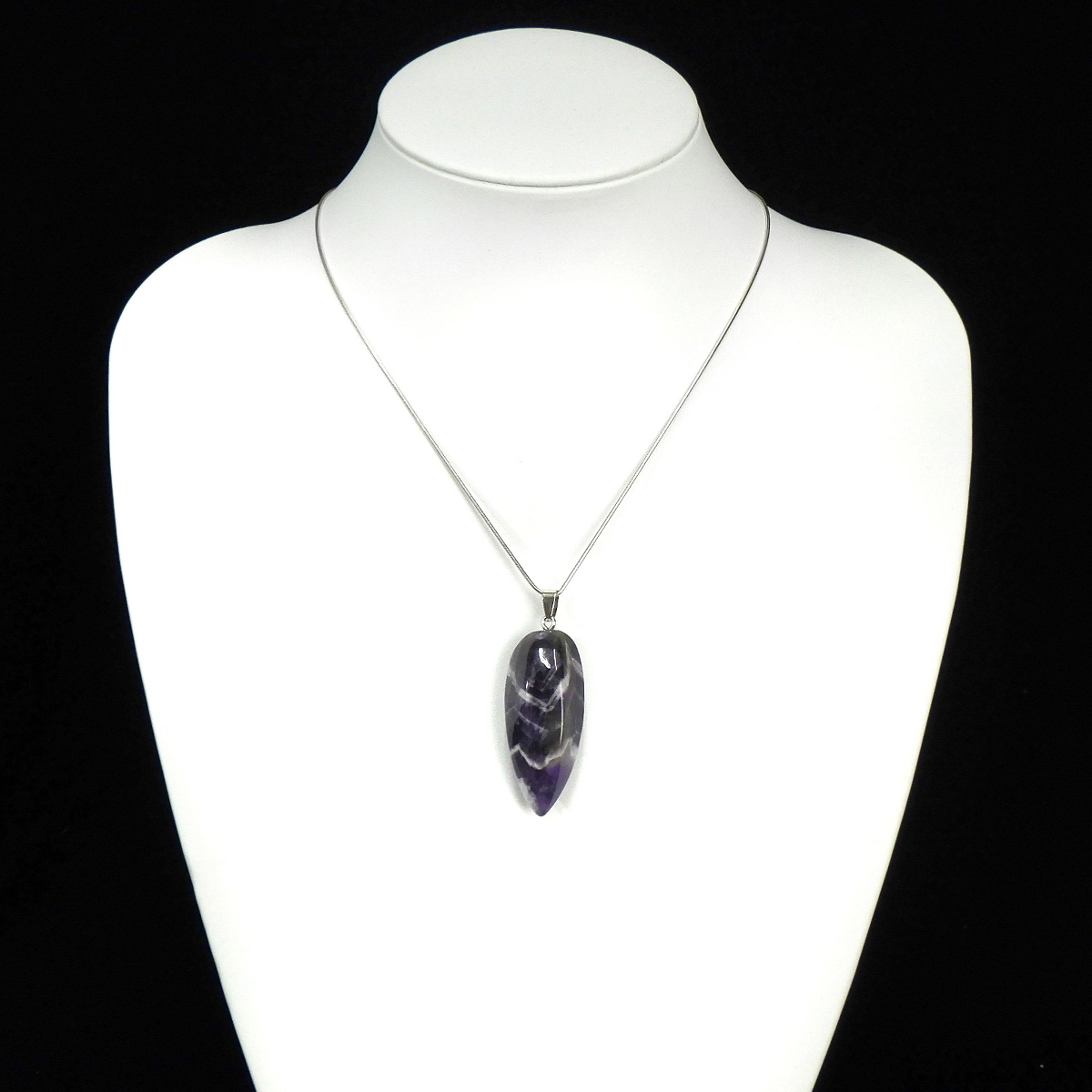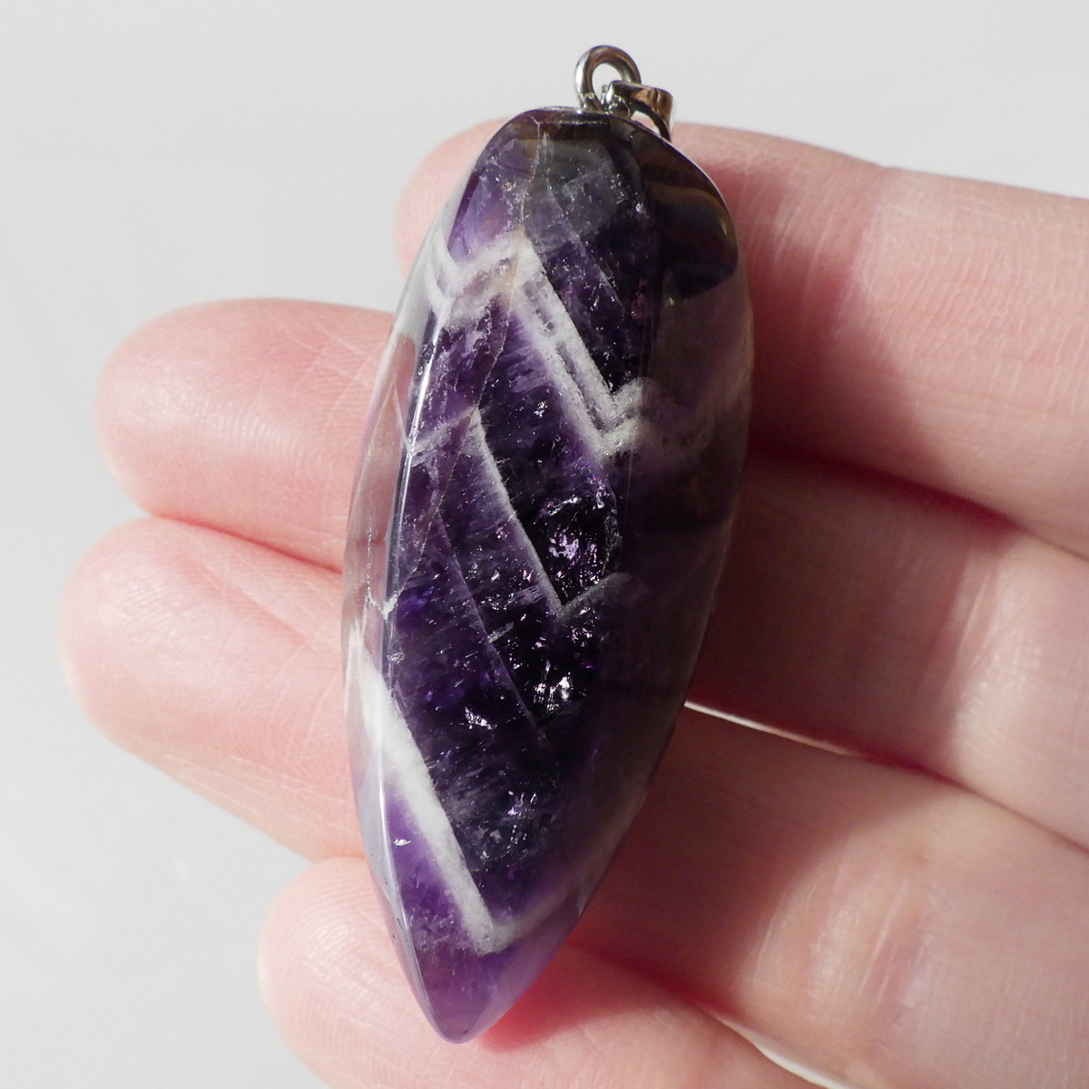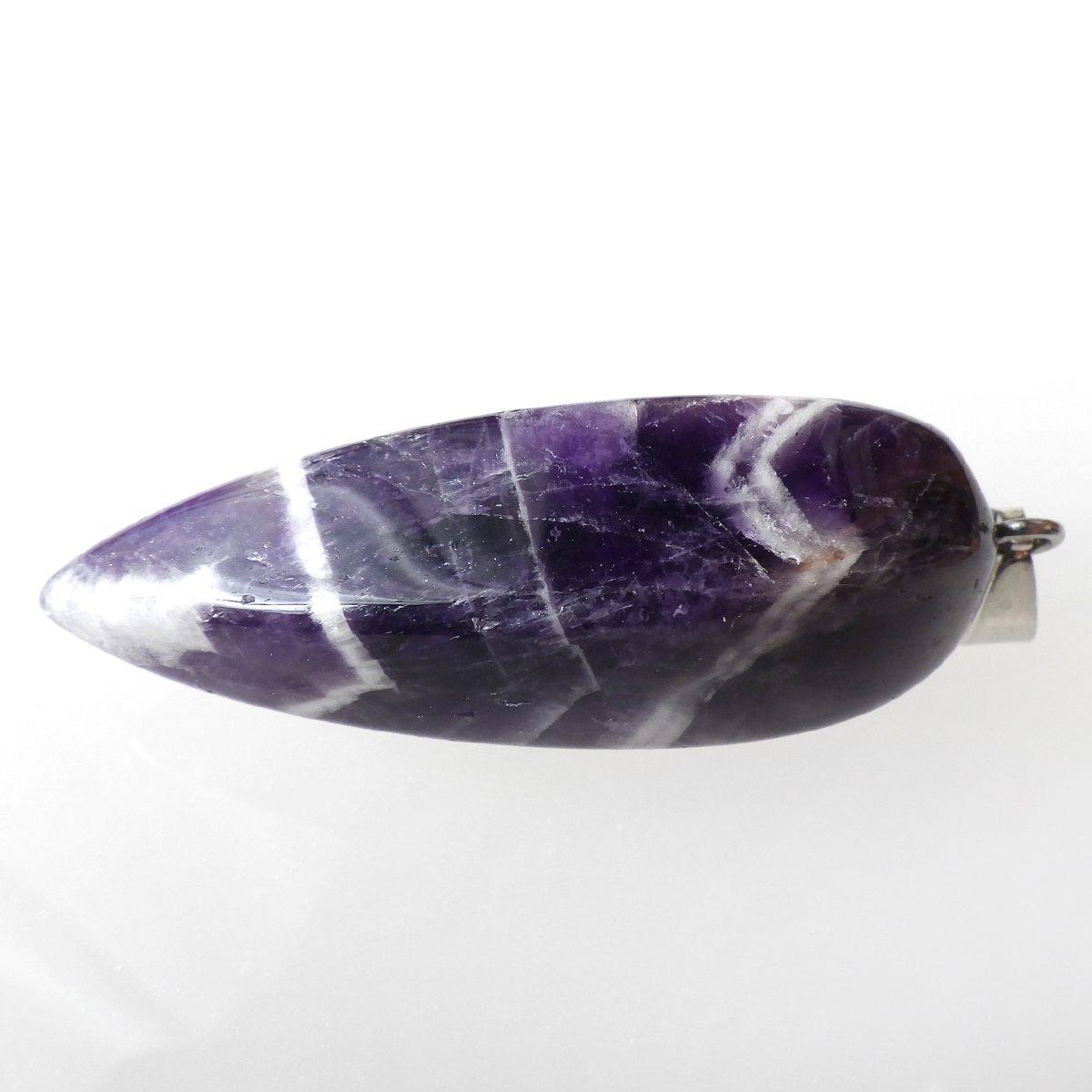 ブラジル産、シェブロンアメジストのペンダントトップです。 シェブロンとは、層状の紋章模様がギザギザと山形に見えることから、山を意味する言葉です。 シェブロンアメジストは、濃淡のある紫色のアメジストと、細い線状の白色をした石英が交互に重なりながら層状に成長し、このような模様が形成されているのです。ヒーリングの世界でも、大変すぐれた物とされて重宝されているそうです。濃い紫とくっきりとした白い紋章模様のラインが美しい品質の良い一点です。