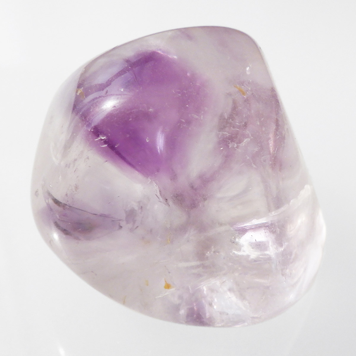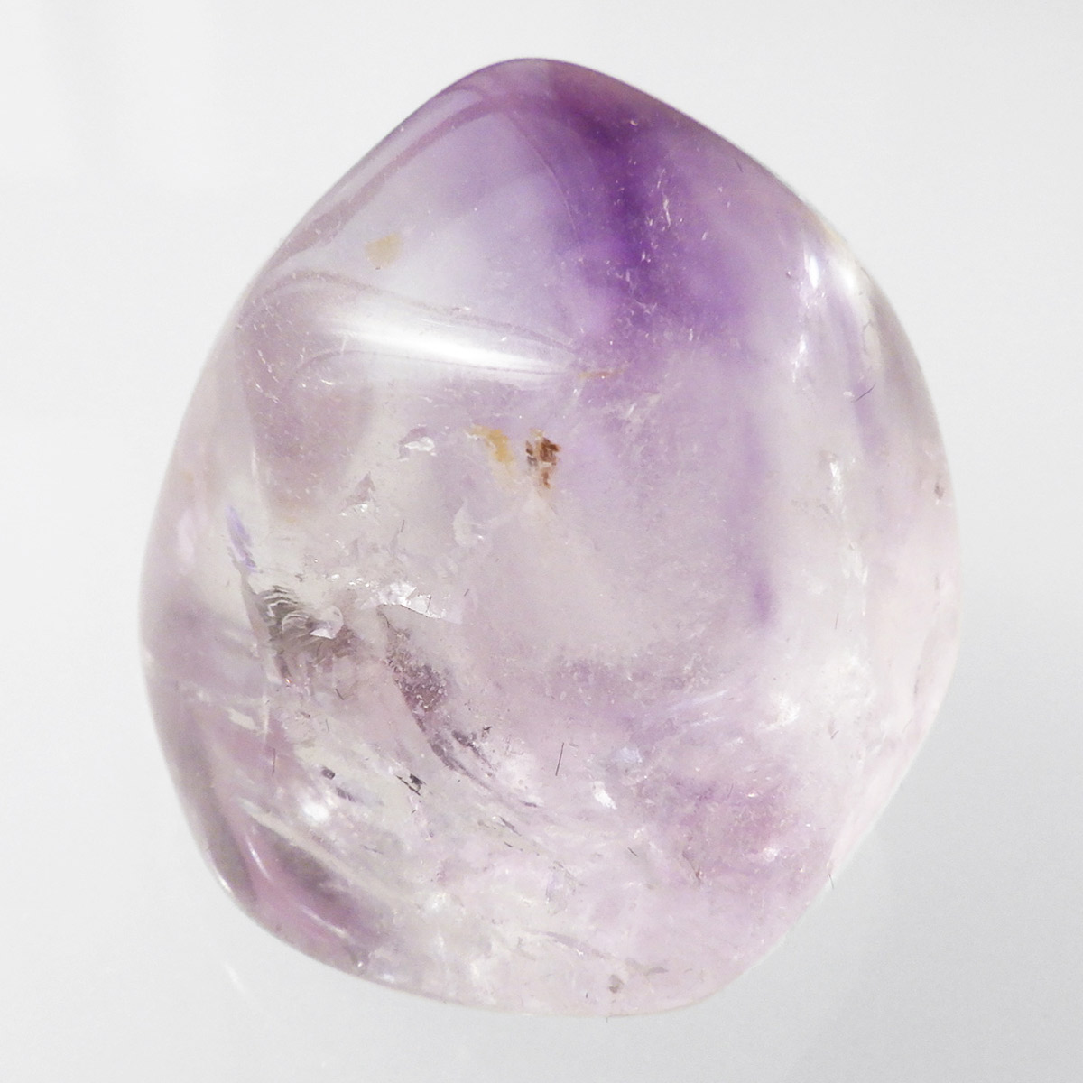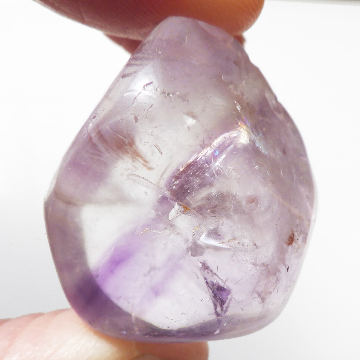 ブラジル産アメジストエレスチャル、タンブルです。エレスチャルは、水晶グループの中でも特に長い時間をかけて、特殊な成長過程を経て形成されたもののことを指し、「水晶の最終形態」とも言われています。エレスチャルの中でも、水晶の中にアメジスト部分が多く入っているものをアメジストエレスチャルと呼びます。非常に美しいインクルージョンでレインボーも確認できました。光に透かすと美しく、やっぱりいいなと見惚れてしまいます。透明度が高く紫色も濃いものは、なかなか手に入らないのでおすすめです。