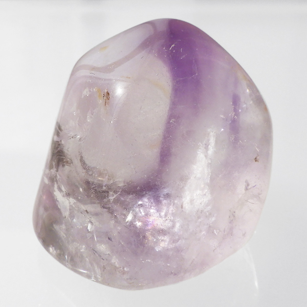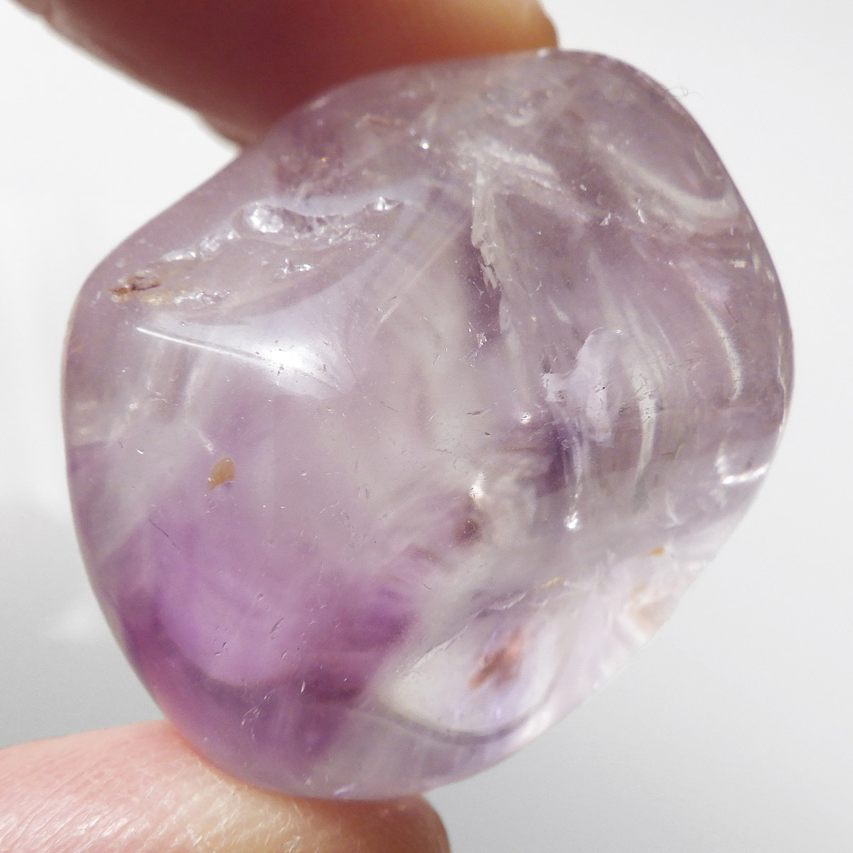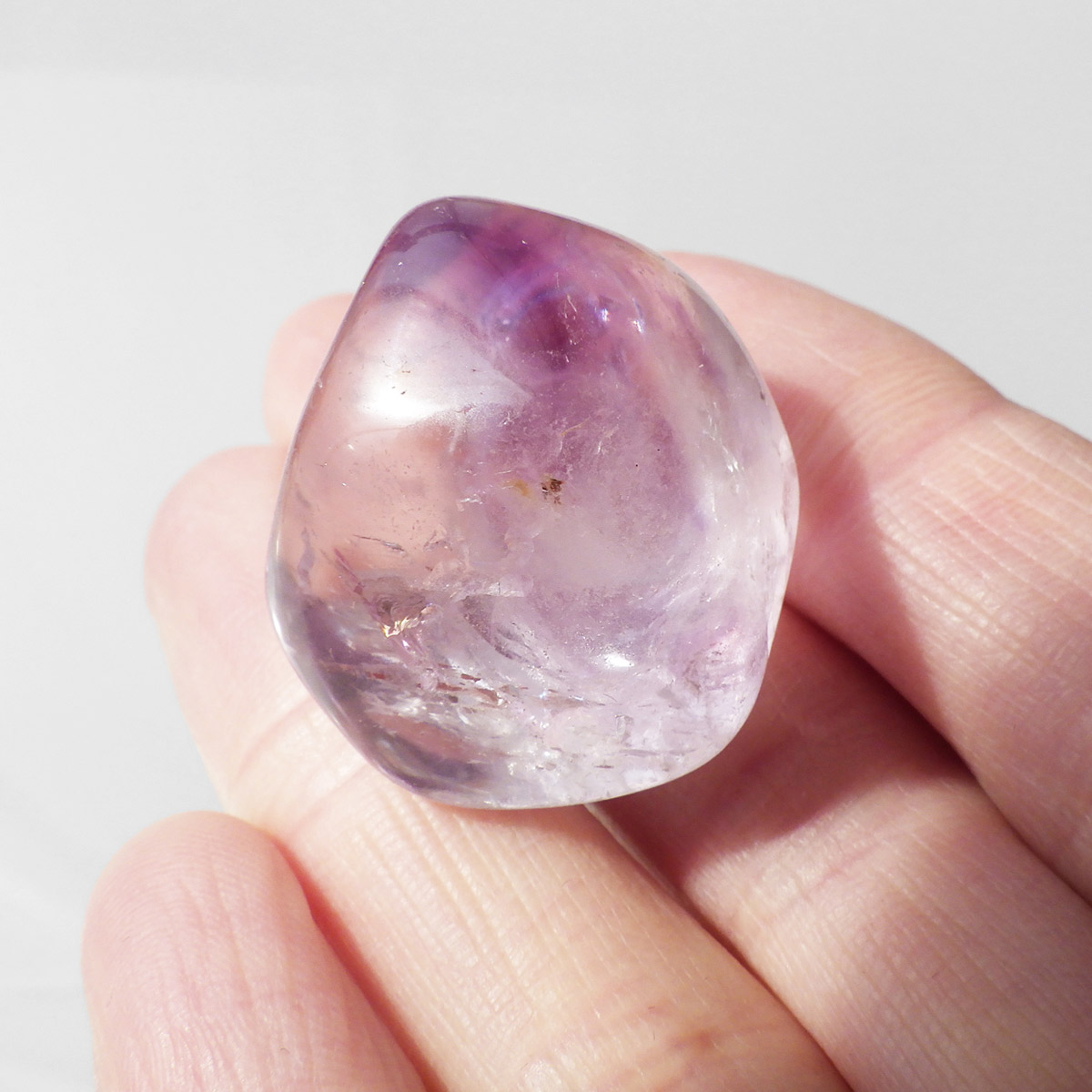 ブラジル産アメジストエレスチャル、タンブルです。エレスチャルは、水晶グループの中でも特に長い時間をかけて、特殊な成長過程を経て形成されたもののことを指し、「水晶の最終形態」とも言われています。エレスチャルの中でも、水晶の中にアメジスト部分が多く入っているものをアメジストエレスチャルと呼びます。非常に美しいインクルージョンでレインボーも確認できました。光に透かすと美しく、やっぱりいいなと見惚れてしまいます。透明度が高く紫色も濃いものは、なかなか手に入らないのでおすすめです。
