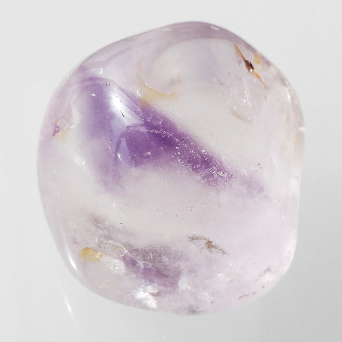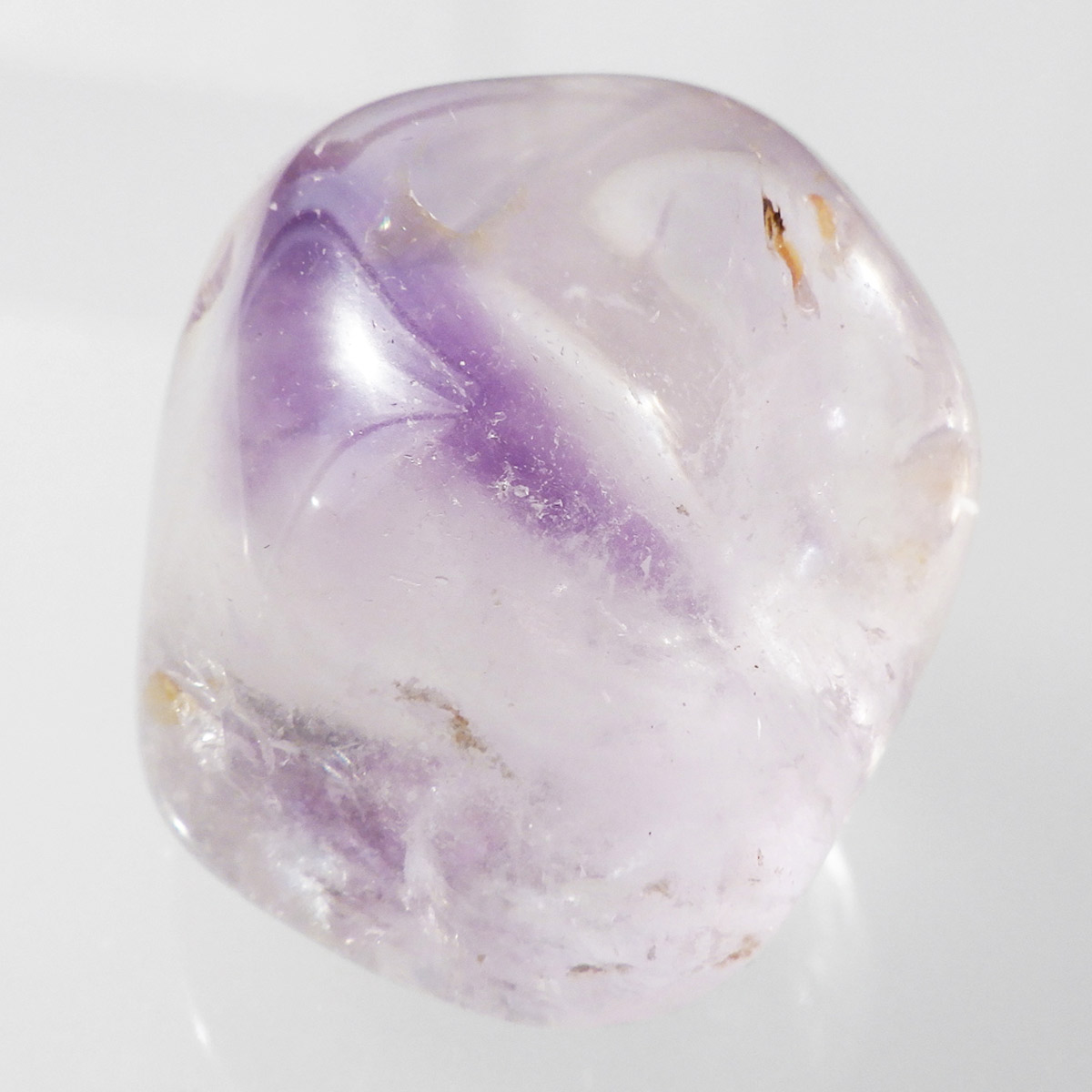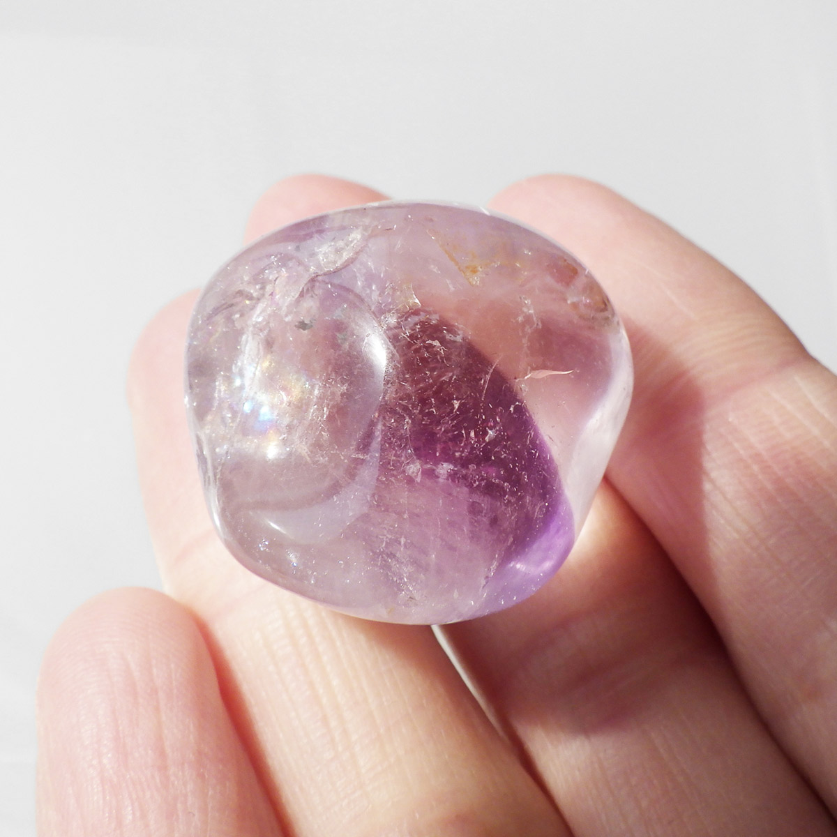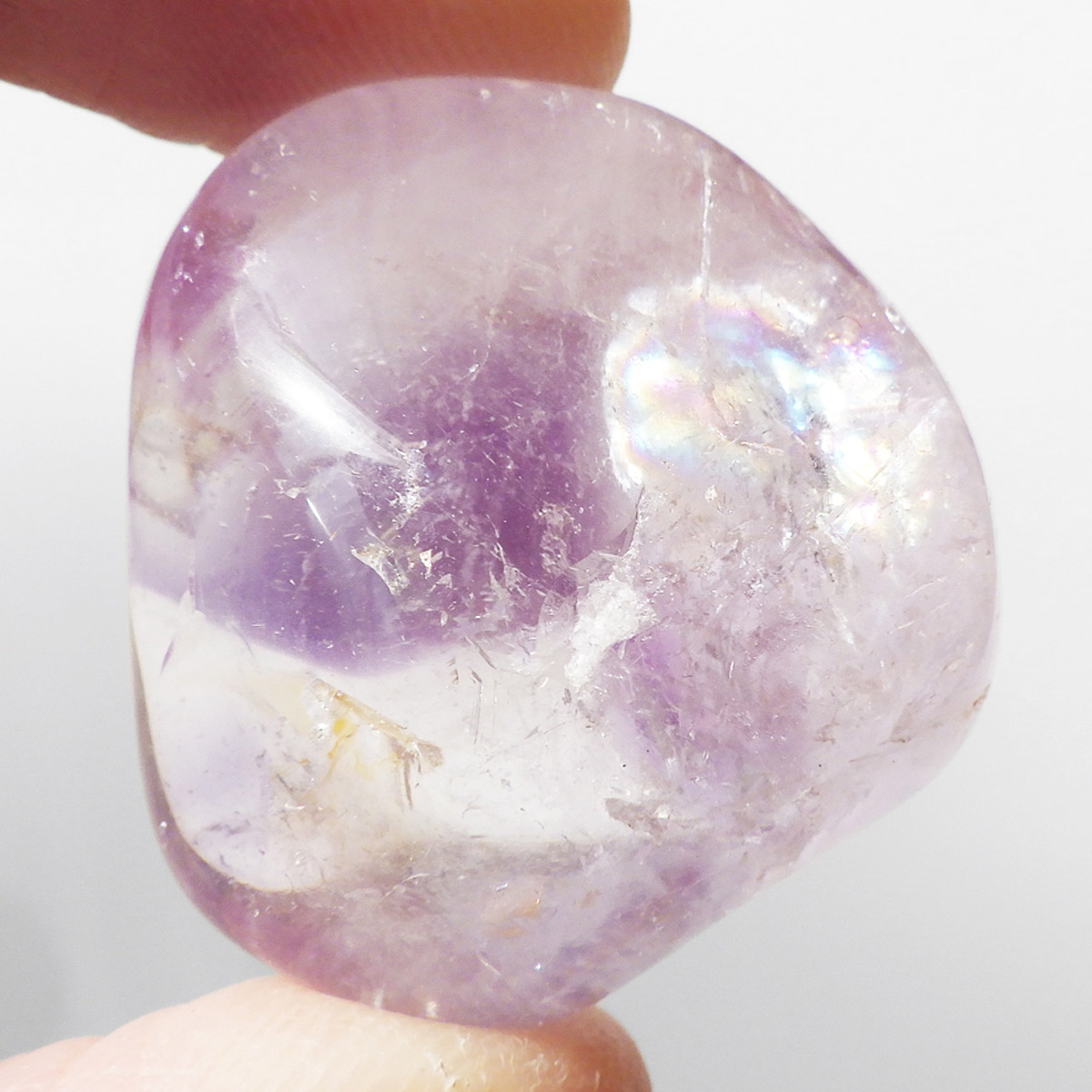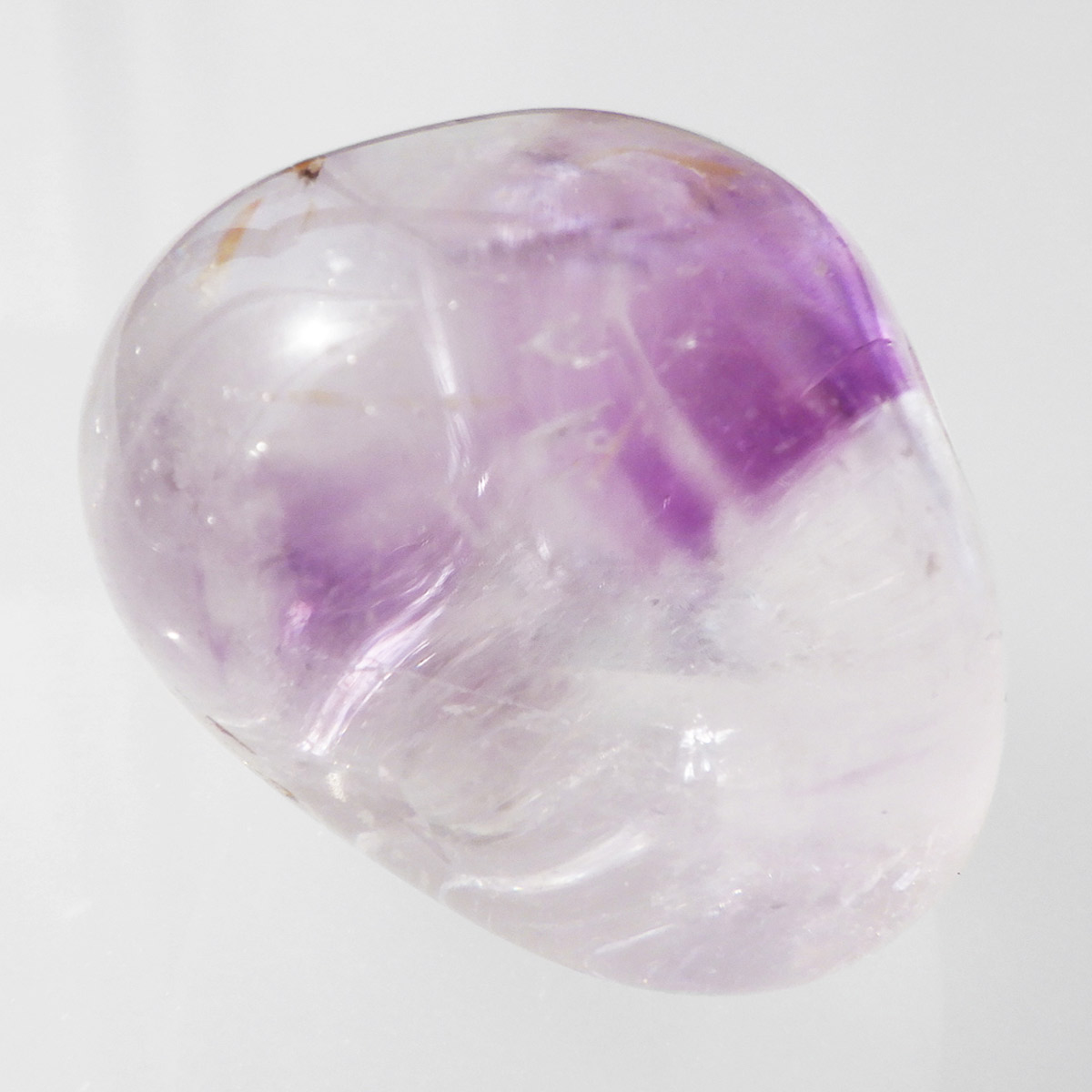 ブラジル産アメジストエレスチャル、タンブルです。エレスチャルは、水晶グループの中でも特に長い時間をかけて、特殊な成長過程を経て形成されたもののことを指し、「水晶の最終形態」とも言われています。エレスチャルの中でも、水晶の中にアメジスト部分が多く入っているものをアメジストエレスチャルと呼びます。非常に美しいインクルージョンでレインボーも確認できました。光に透かすと美しく、やっぱりいいなと見惚れてしまいます。透明度が高く紫色も濃いものは、なかなか手に入らないのでおすすめです。