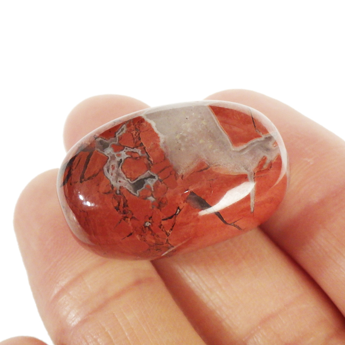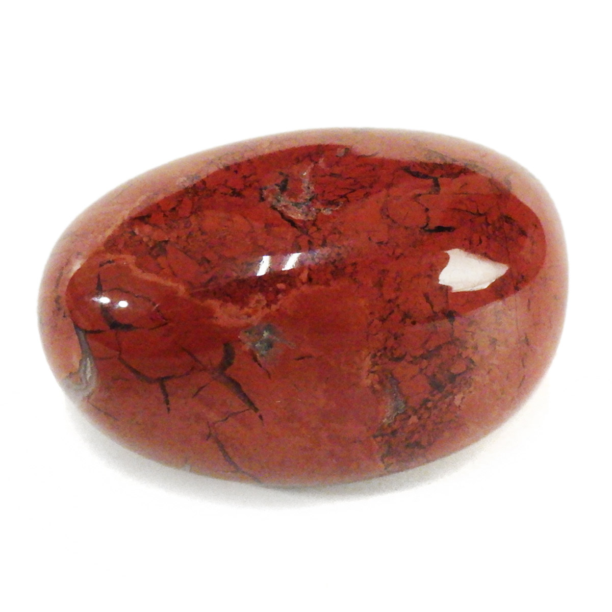 ブラジル産のポピージャスパー、タンブルです。 ジャスパーは、様々な不純物を含んだ石英の総称で、含まれる不純物によって、赤、緑、黄、黒、褐色など、多くの色や模様を持ちます。古くから「聖なる石」と崇められてきた鉱物で、太陽崇拝のインカ帝国では、レッドジャスパーが生命の源の石としてまつりに使用されていたそうです。このポピージャスパーは鮮やかで艶があり、石英によって独特の模様が楽しめます。
