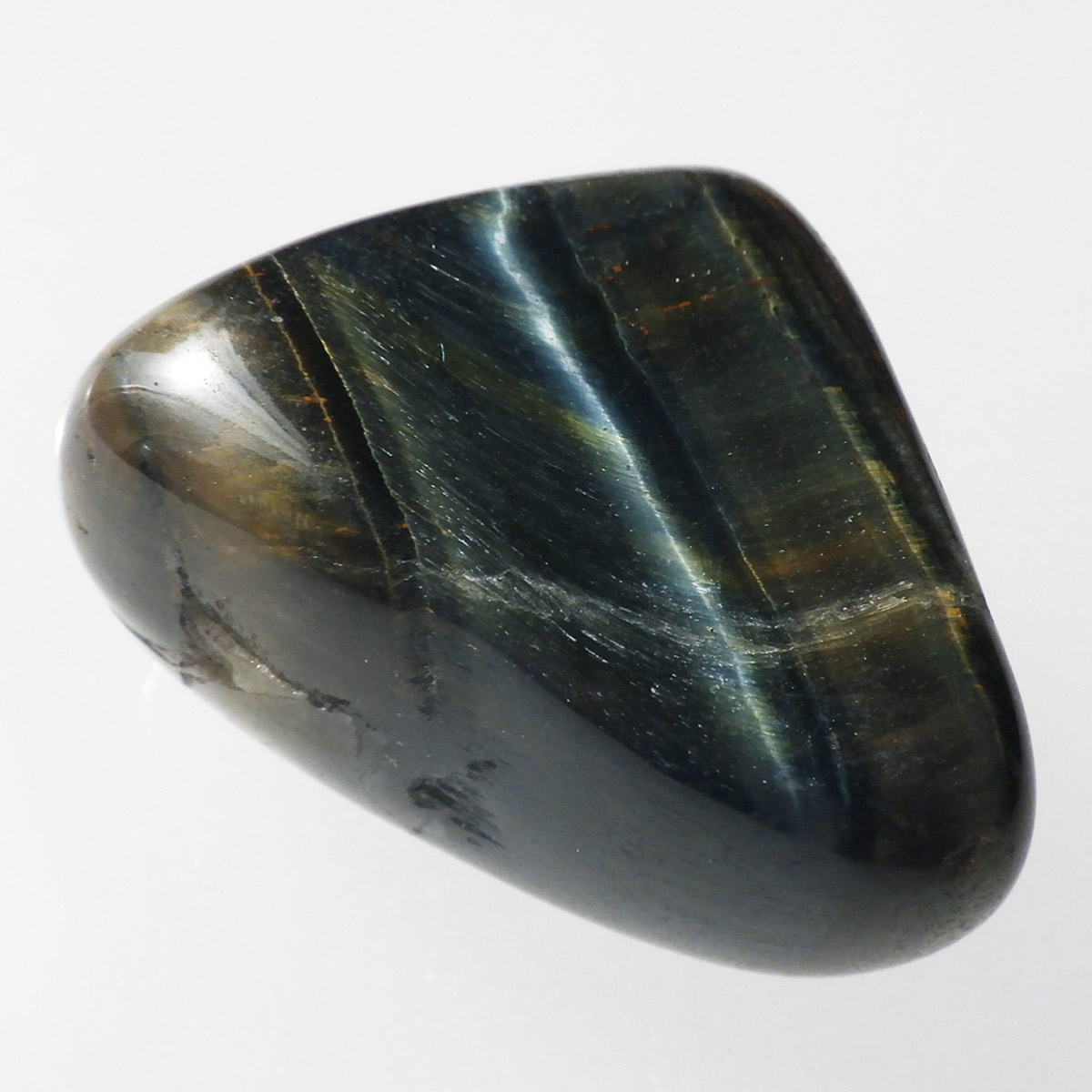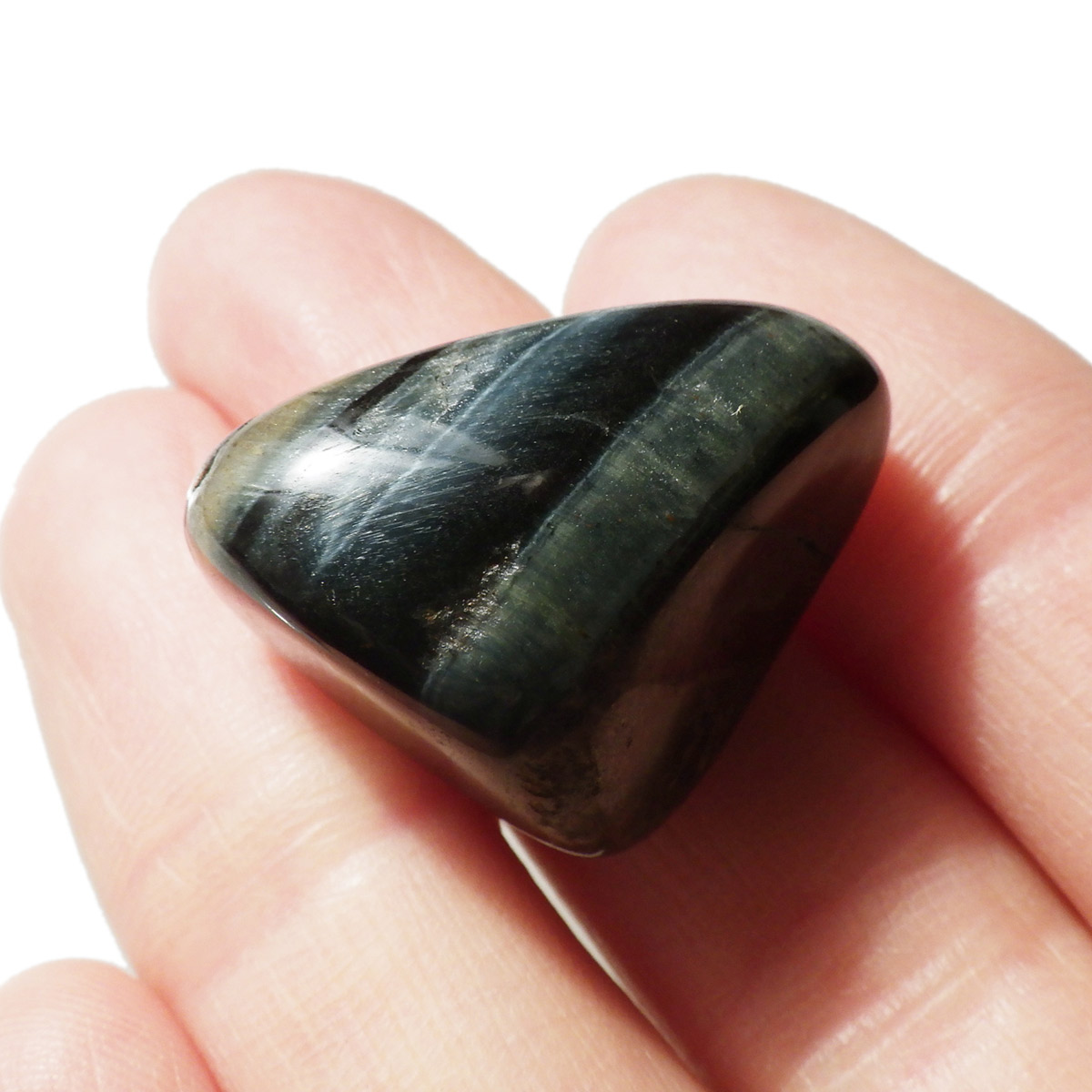 ブラジル産のウルフアイ、タンブルです。ウルフアイまたはウルフズアイとして表記されています。ウルフアイは流通名でホークスアイからタイガーアイに変化している間の両石の一面が同時に見られる石のことを呼んでいます。おおまかにホークスアイに分類されている場合もあるかと思います。色味でいえば青から黄色に変化する途中のものをウルフアイと呼びます。きれいに目が出ている特別なものを厳選してご紹介しております。ライトなどで照らすと、よりキラリとキャッツアイ効果が分かりやすく輝くかと思います。ウルフアイの名前の通り、かっこよく光り輝く素敵な石です。