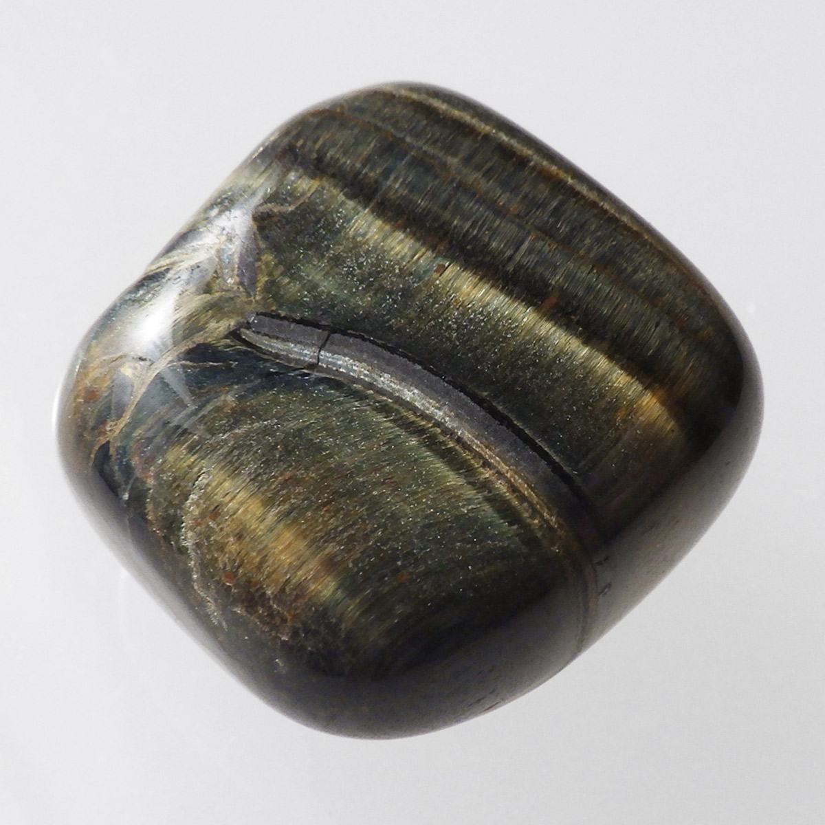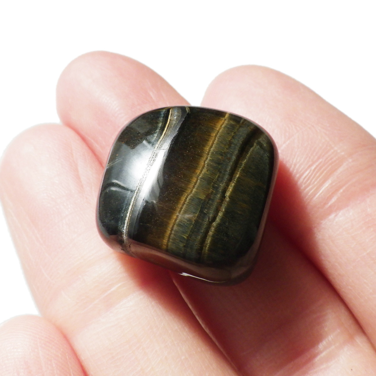 ブラジル産のウルフアイ、タンブルです。ウルフアイまたはウルフズアイとして表記されています。ウルフアイは流通名でホークスアイからタイガーアイに変化している間の両石の一面が同時に見られる石のことを呼んでいます。おおまかにホークスアイに分類されている場合もあるかと思います。色味でいえば青から黄色に変化する途中のものをウルフアイと呼びます。きれいに目が出ている特別なものを厳選してご紹介しております。ライトなどで照らすと、よりキラリとキャッツアイ効果が分かりやすく輝くかと思います。ウルフアイの名前の通り、かっこよく光り輝く素敵な石です。