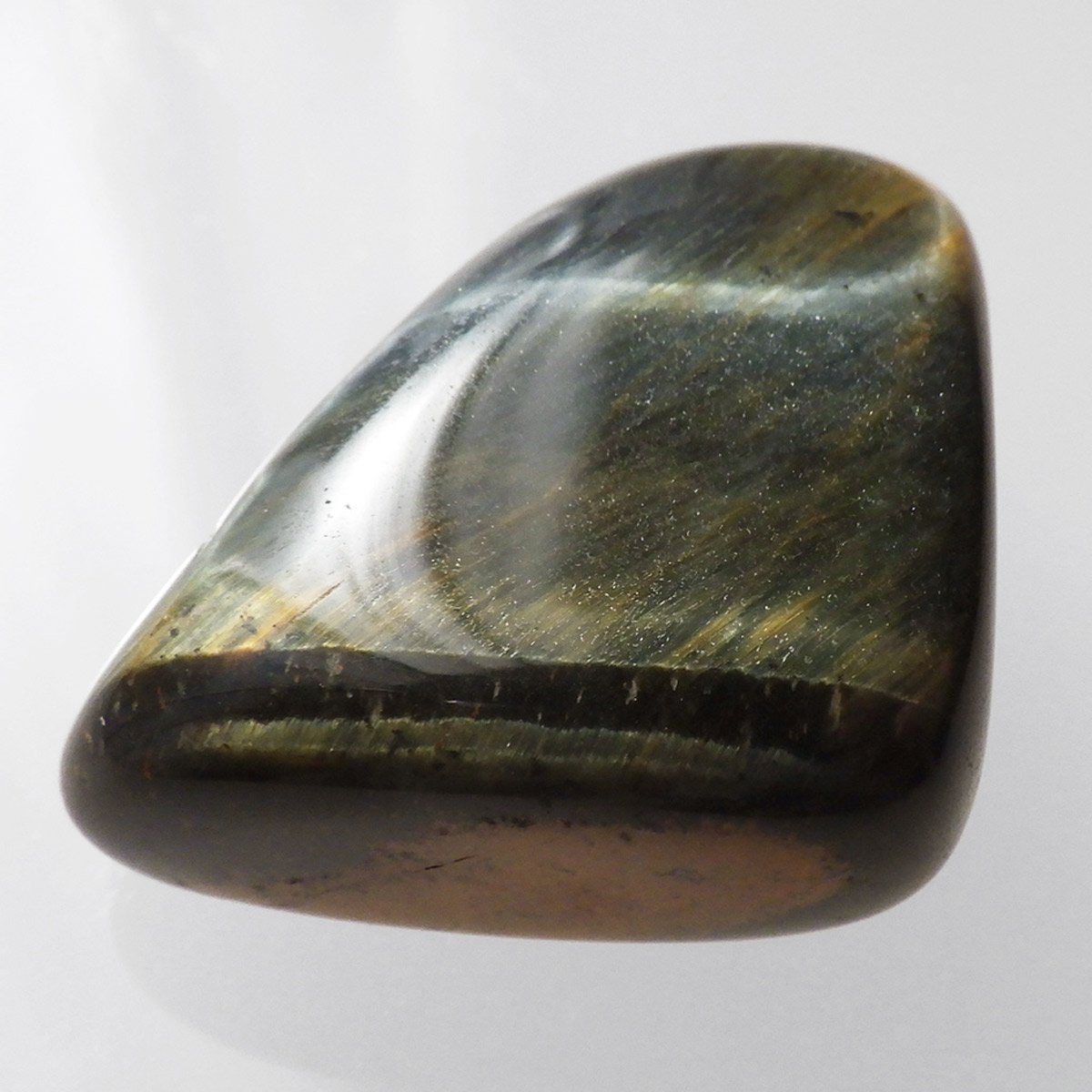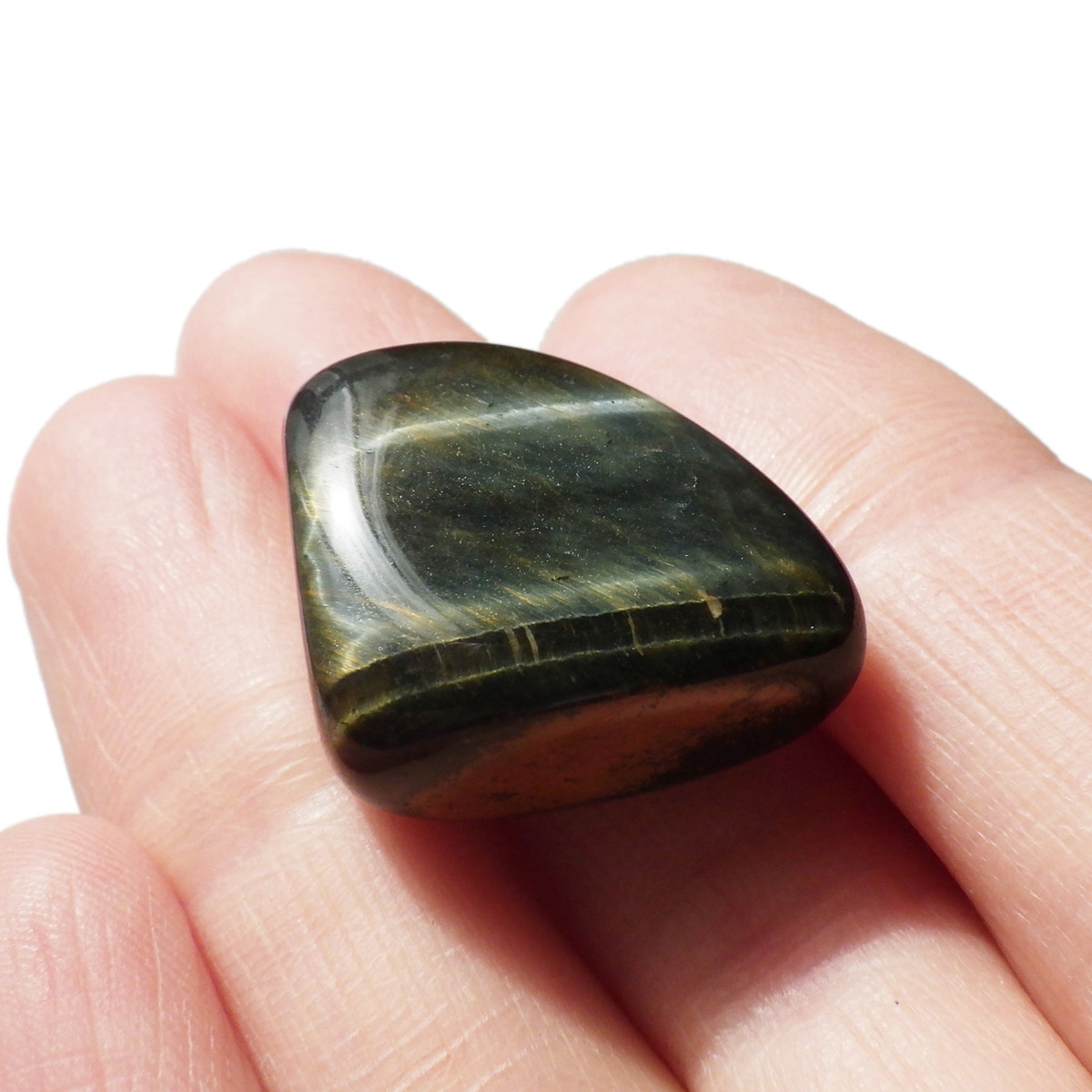 ブラジル産のウルフアイ、タンブルです。ウルフアイまたはウルフズアイとして表記されています。ウルフアイは流通名でホークスアイからタイガーアイに変化している間の両石の一面が同時に見られる石のことを呼んでいます。おおまかにホークスアイに分類されている場合もあるかと思います。色味でいえば青から黄色に変化する途中のものをウルフアイと呼びます。きれいに目が出ている特別なものを厳選してご紹介しております。ライトなどで照らすと、よりキラリとキャッツアイ効果が分かりやすく輝くかと思います。ウルフアイの名前の通り、かっこよく光り輝く素敵な石です。