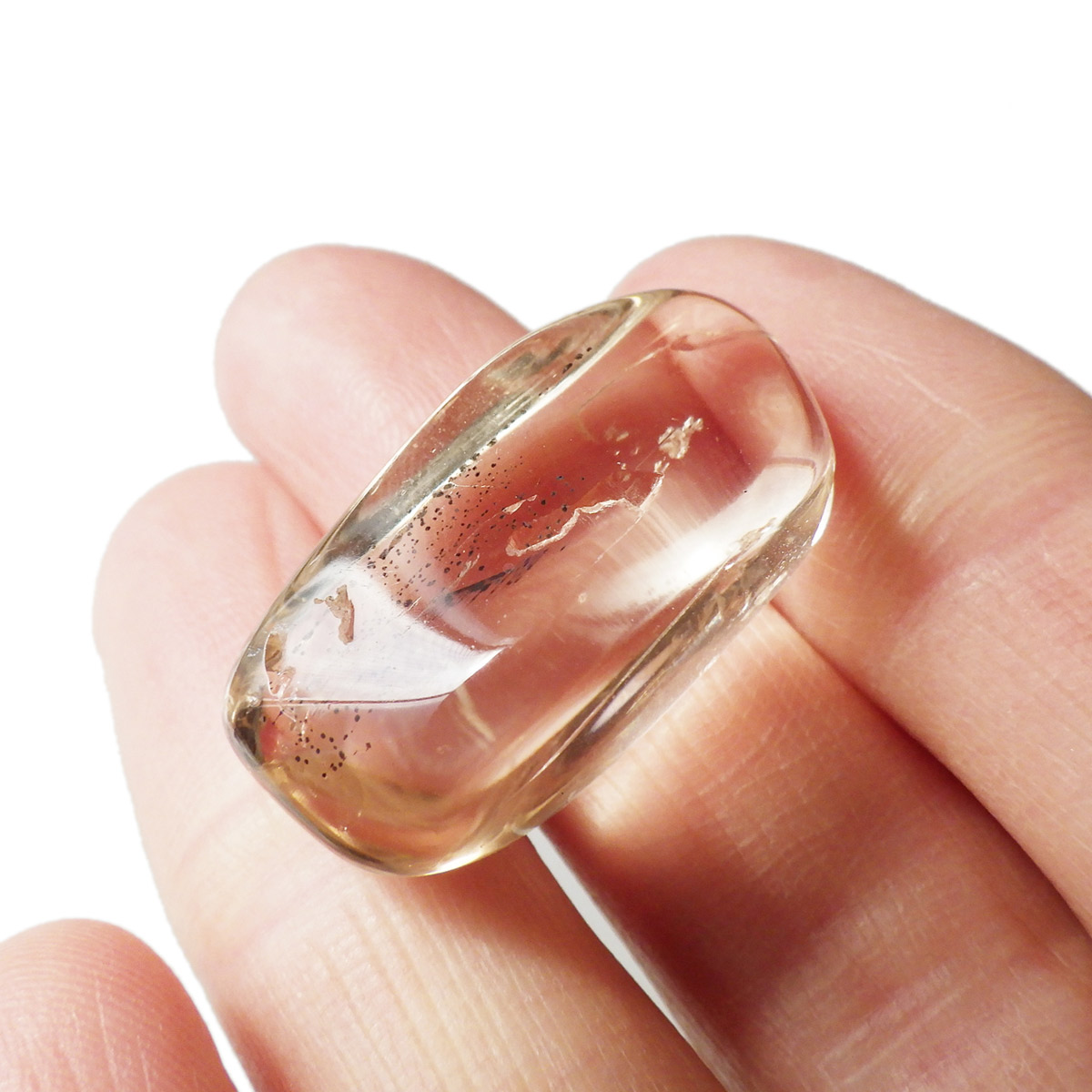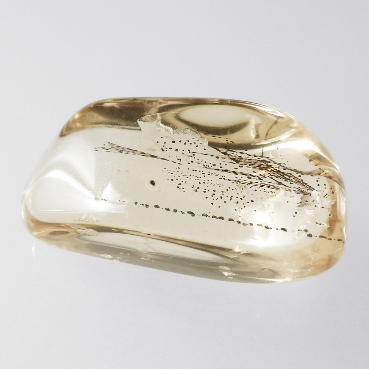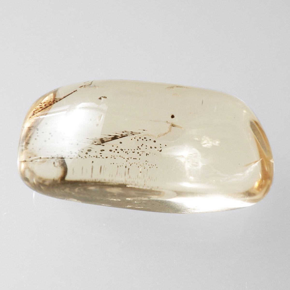 アフリカに位置するジンバブエ産のスキャポライト、タンブルです。スキャポライトは柱状結晶していることから、和名を柱石といいます。非常に希少な石なので、流通量は非常に少なくなっています。カラーバリエーションも豊富で、無色・白色・黄色・ピンク色・紫色・青色・褐色・灰色・灰黒色などがあります。透明度が高くシャンパンゴールドのカラーです。透明度が高いことから内部を見ると結晶の筋が見られます。