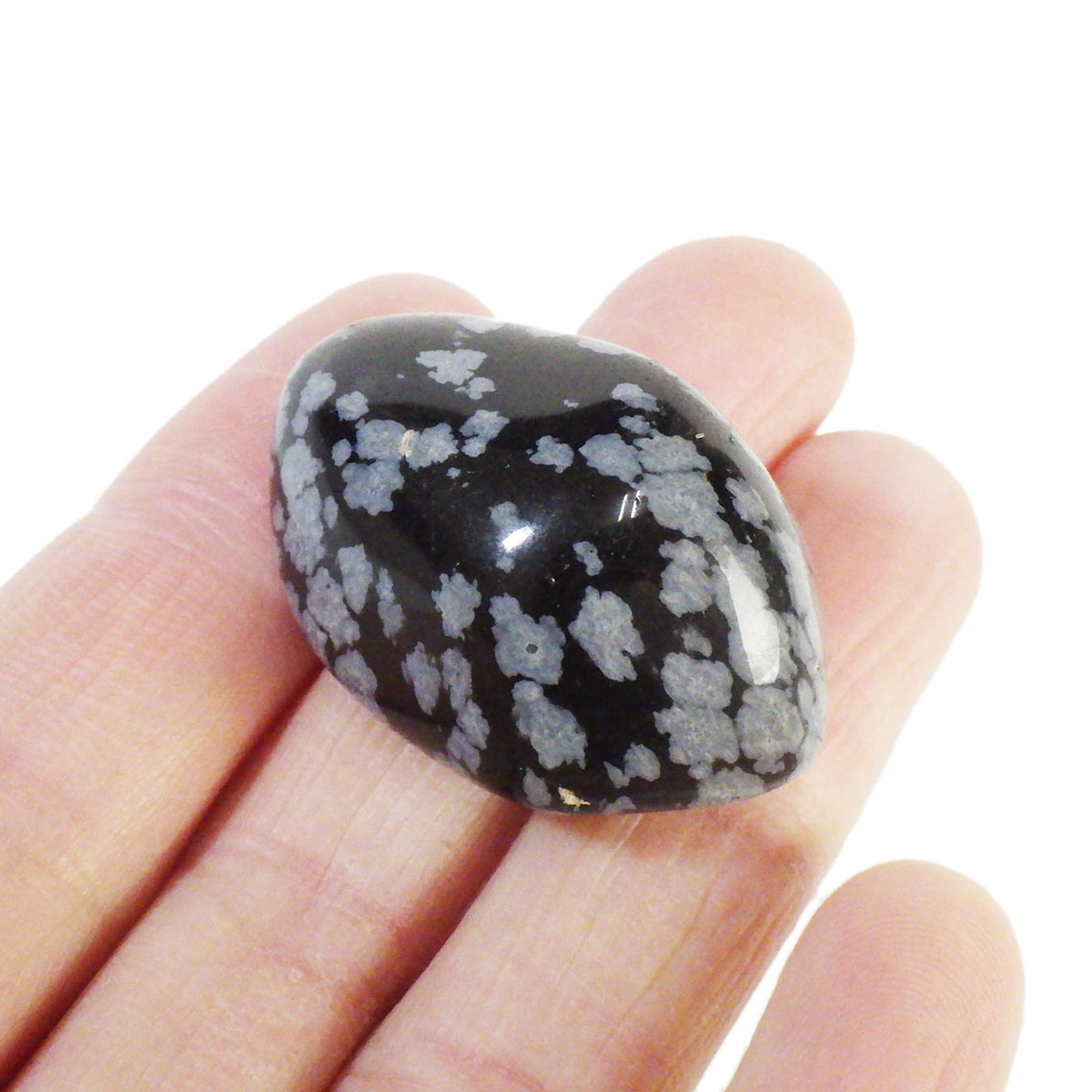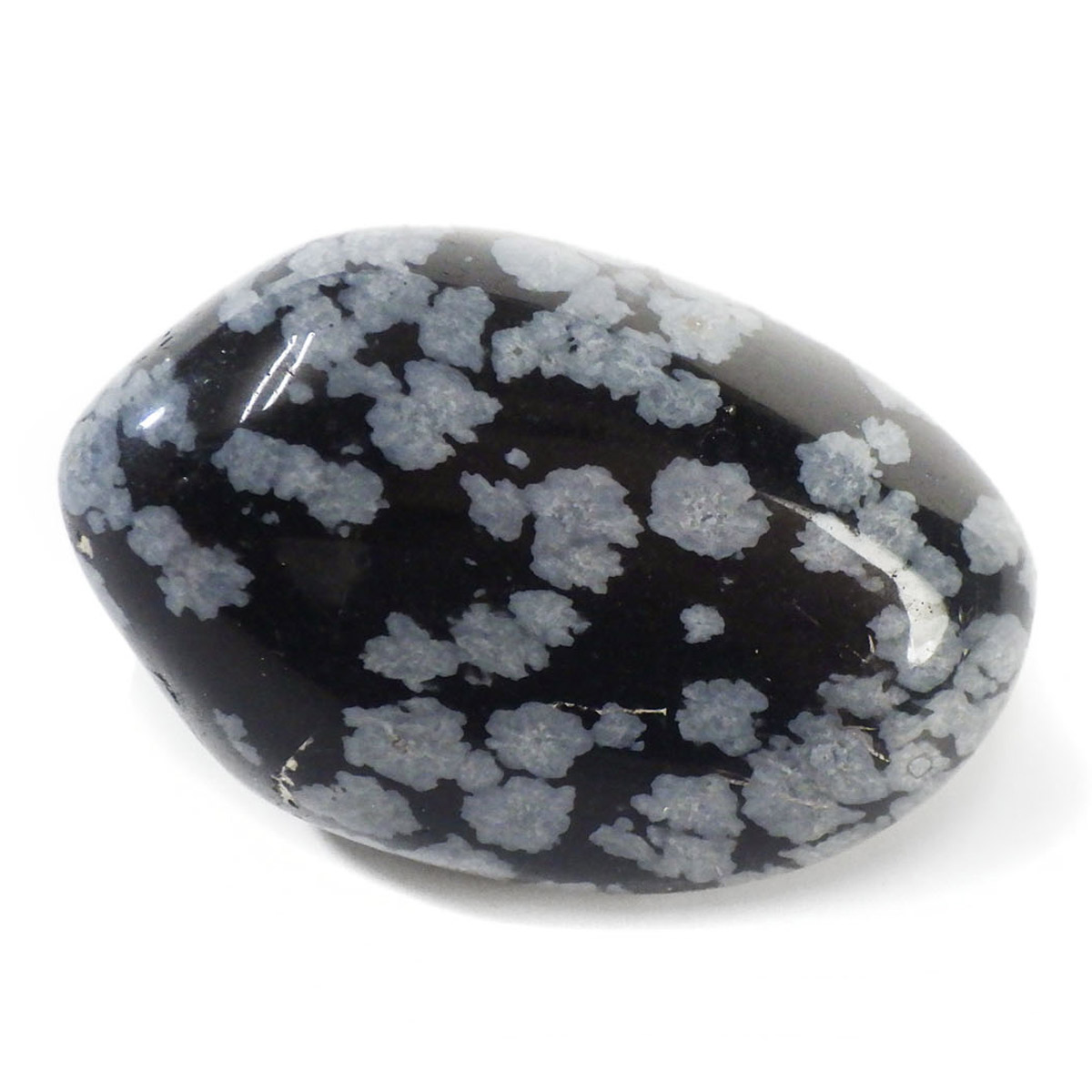 アメリカ・ユタ州産のスノーフレークオブシディアン、タンブルです。オブシディアンは、火山性の天然ガラスです。その中にクリストバライトと言う火山性鉱物が入り込んで、白い斑点模様を織り成しているのです。表面に雪の結晶のような模様が見えるのが特徴です。
