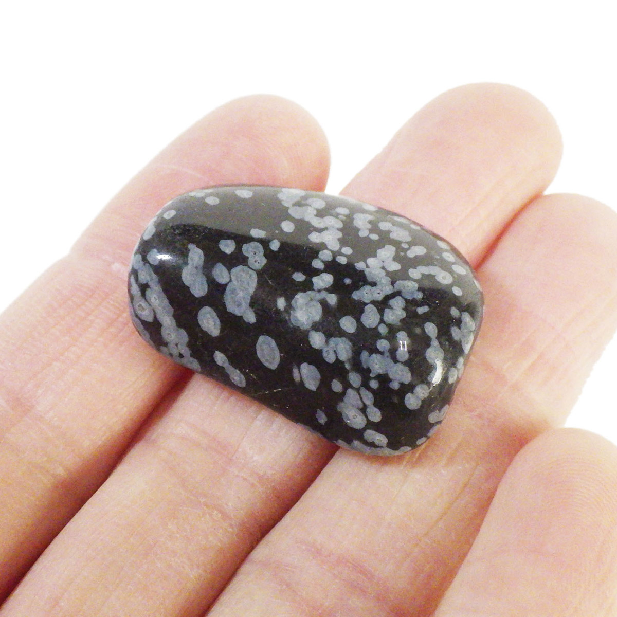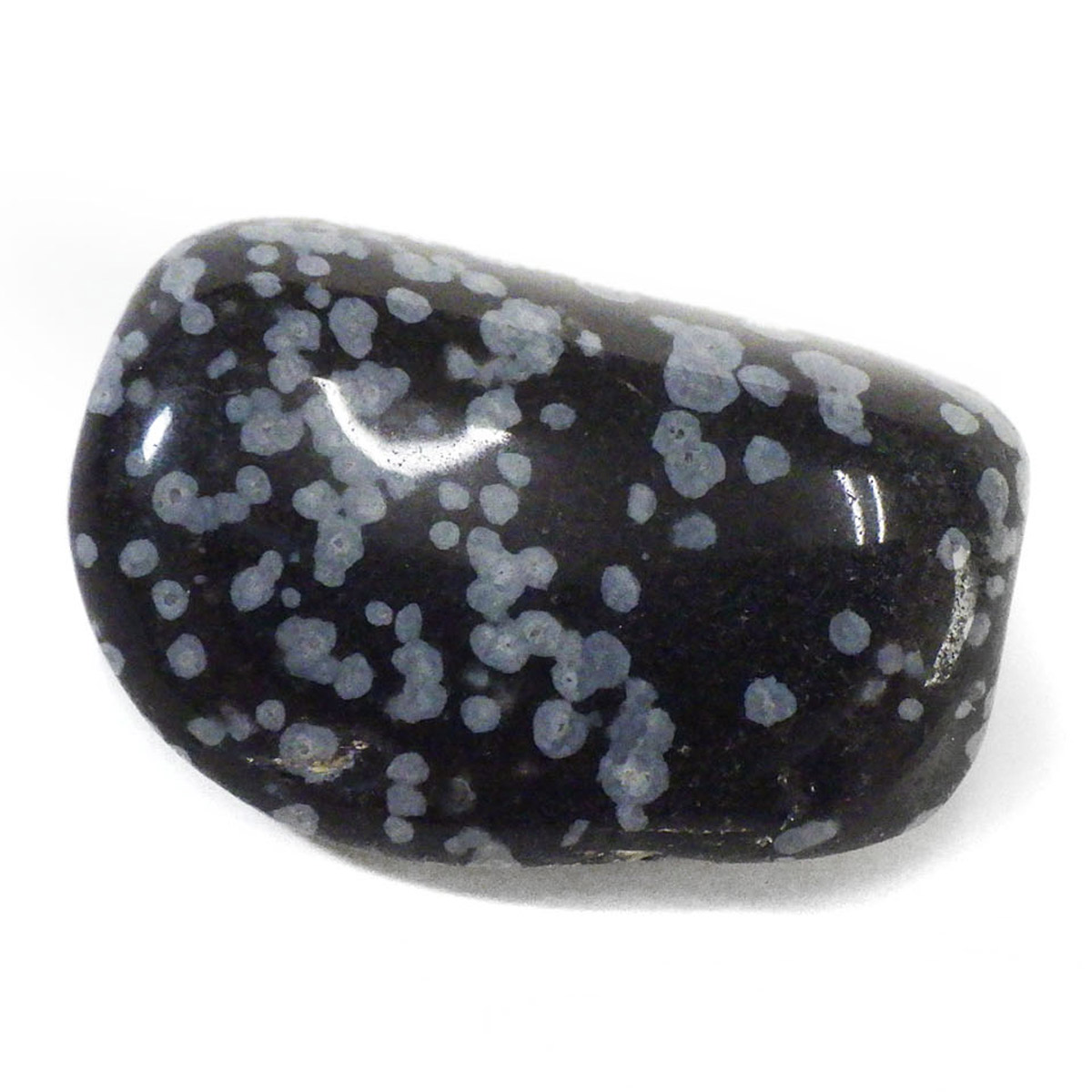 アメリカ・ユタ州産のスノーフレークオブシディアン、タンブルです。オブシディアンは、火山性の天然ガラスです。その中にクリストバライトと言う火山性鉱物が入り込んで、白い斑点模様を織り成しているのです。表面に雪の結晶のような模様が見えるのが特徴です。