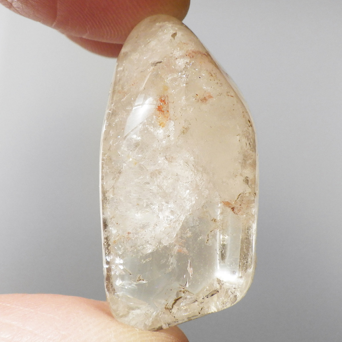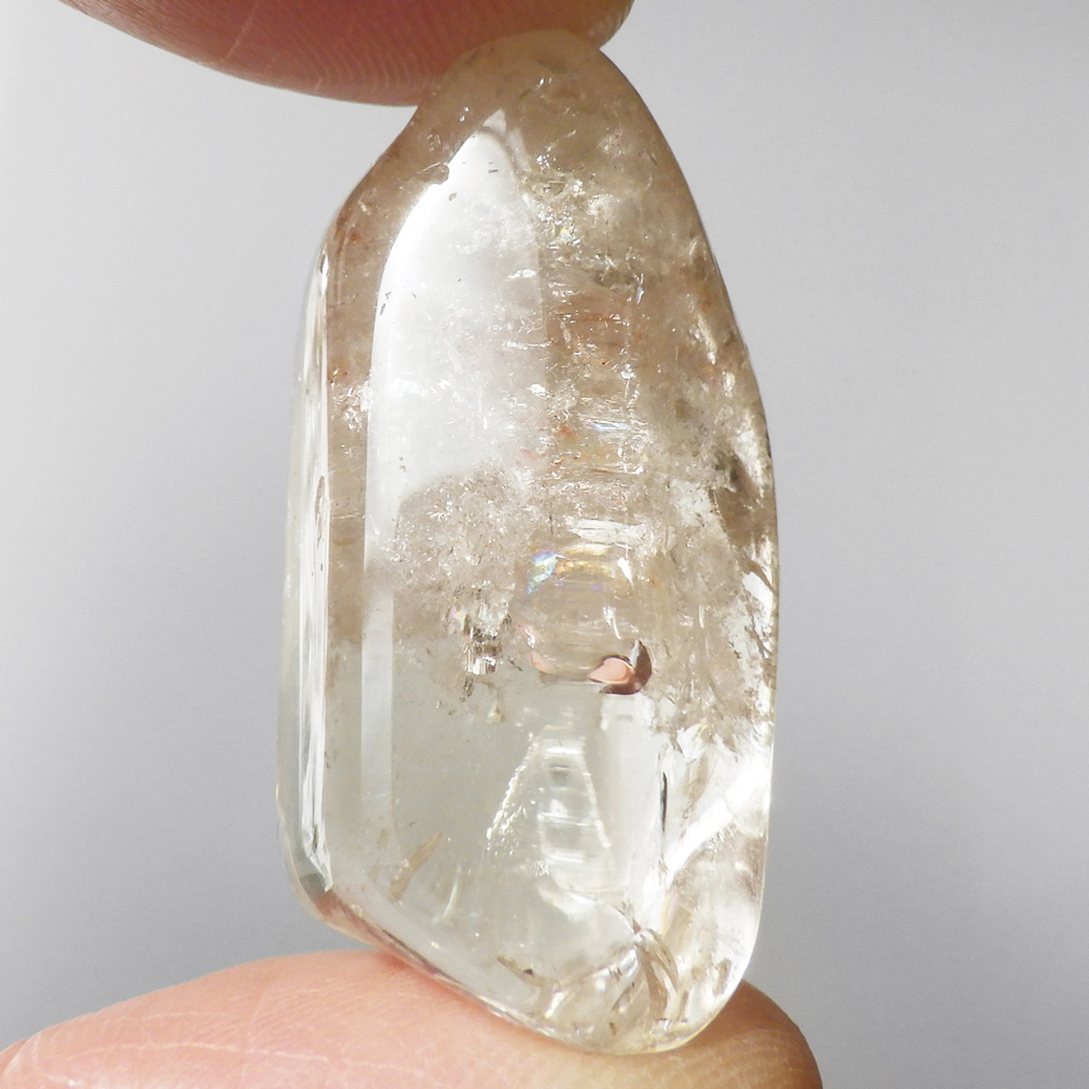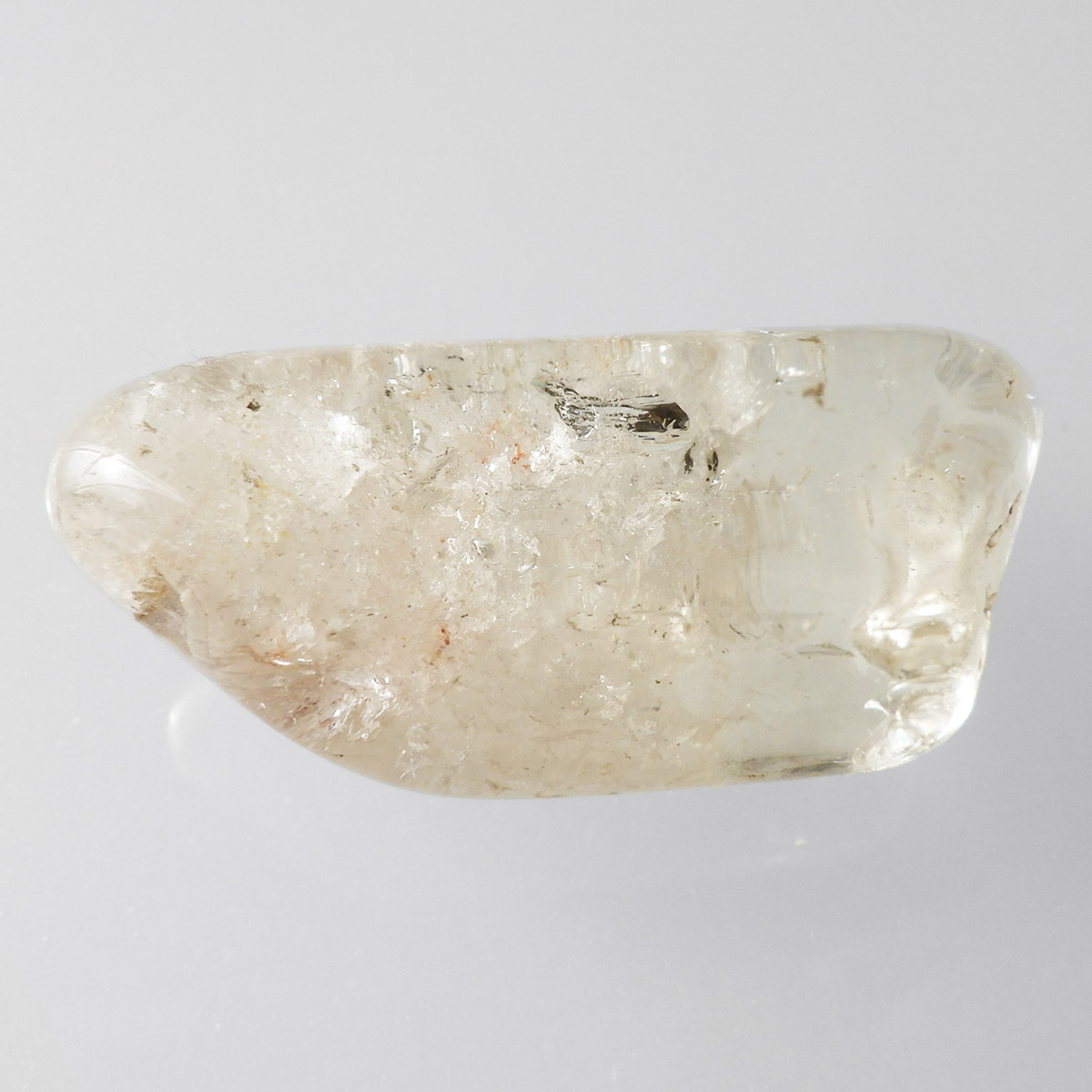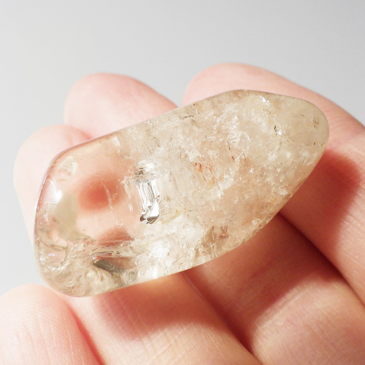 マダガスカル産のスモーキーシトリン、タンブルです。ほのかな色味、宝石のような美しさではないかもしれませんが、純粋できれいです。現在流通しているシトリンのほとんどが、アメジストもしくはスモーキークォーツに加熱処理を施したものが大半で、ナチュラルなものは大変希少です。そんな希少価値の高い、ナチュラルマダガスカルスモーキーシトリンです。透明度が抜群に高く、キラキラと美しい光沢が見られます。