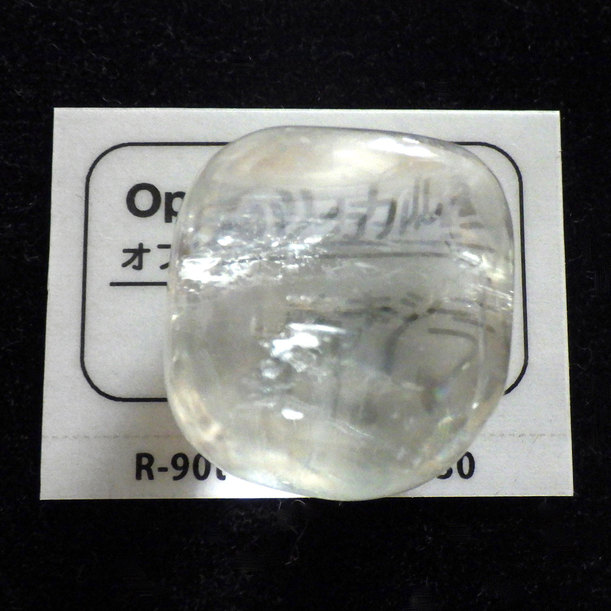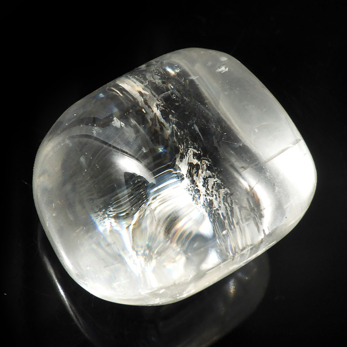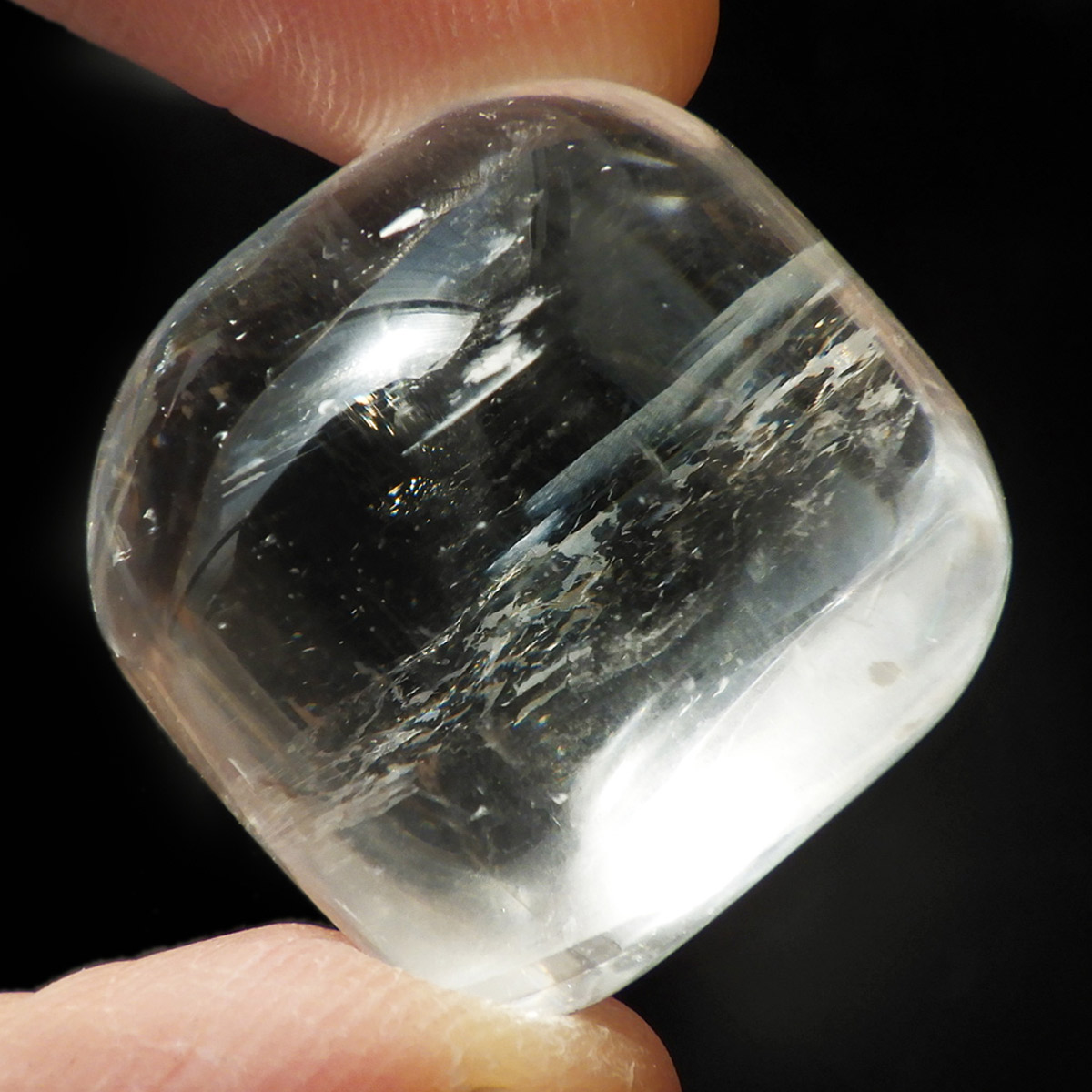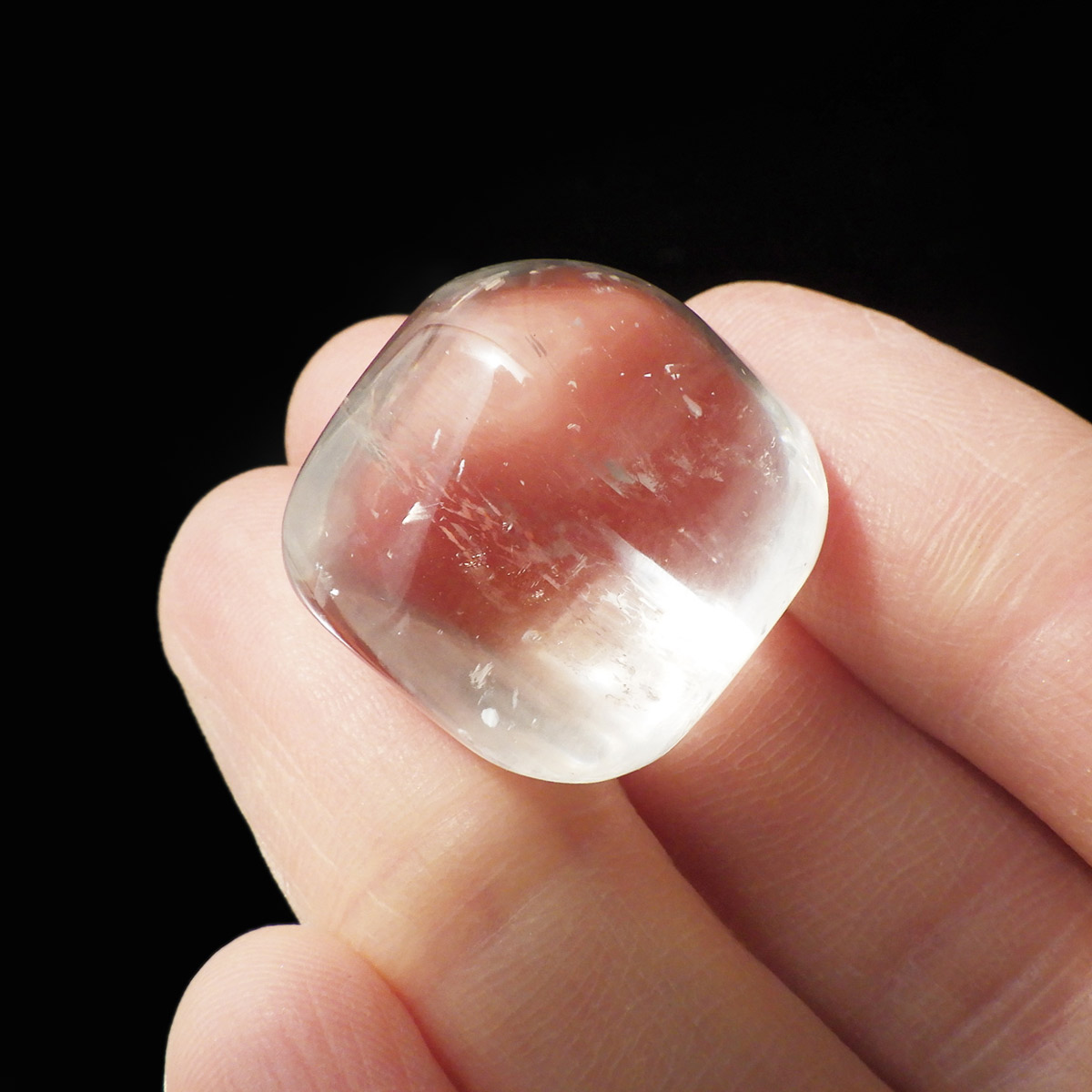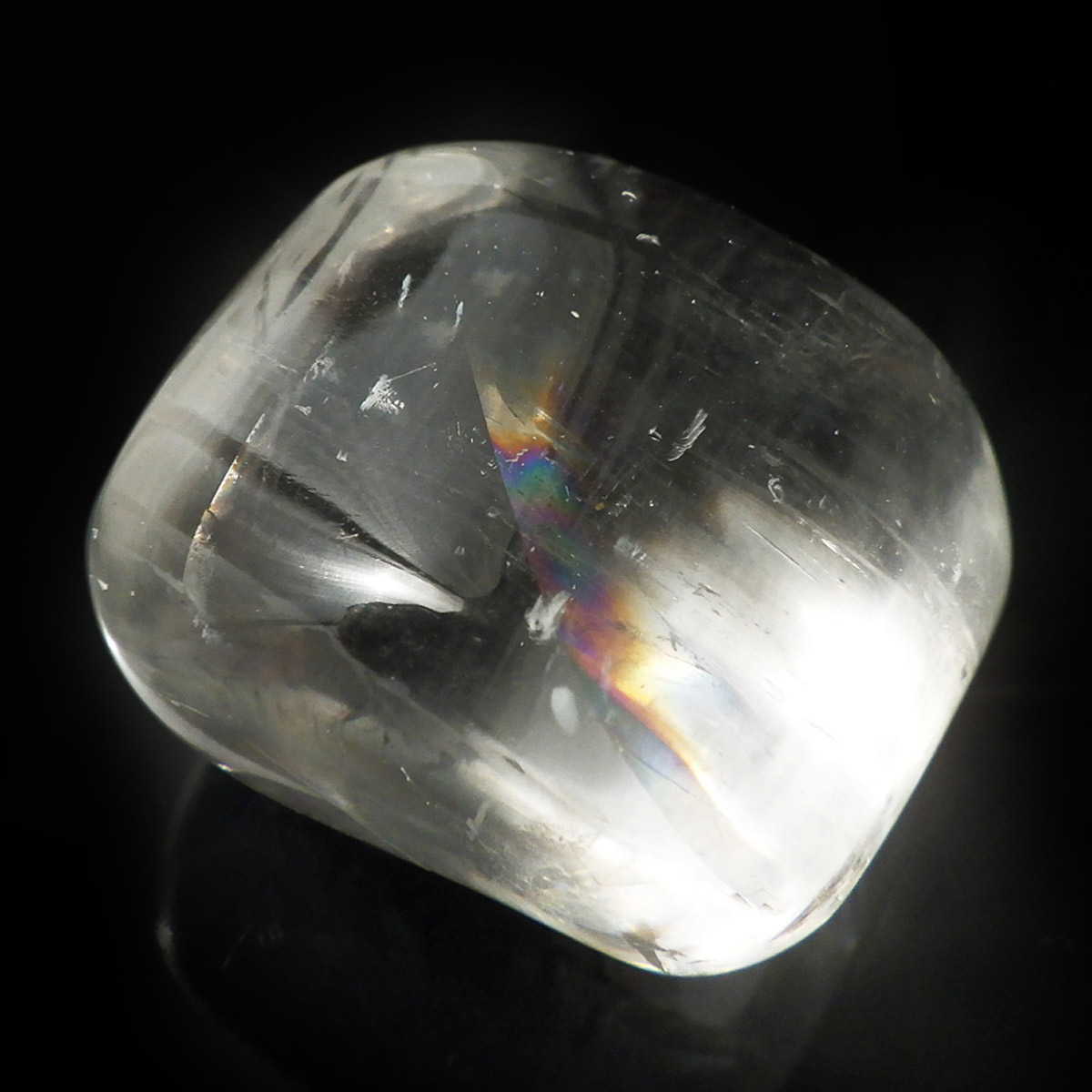 メキシコ産のオプティカルカルサイト、タンブルです。無色透明で良質のカルサイトのことをオプティカルカルサイトと呼びます。高い透明度を持ち、様々な角度からレインボーを見ることができます。複屈折という光学現象を持ち、文字の上に載せると二つにダブって見える「ダブリング(二重像現象)」のような現象を起こします。透明度が高く、レインボーも見られ、とてもきれいでおすすめです。