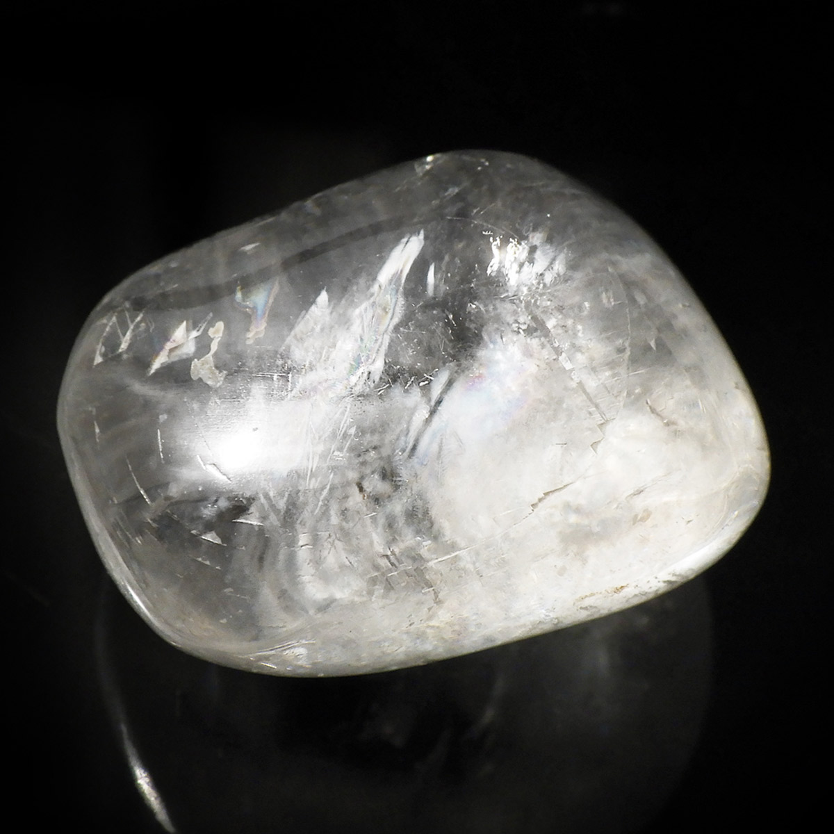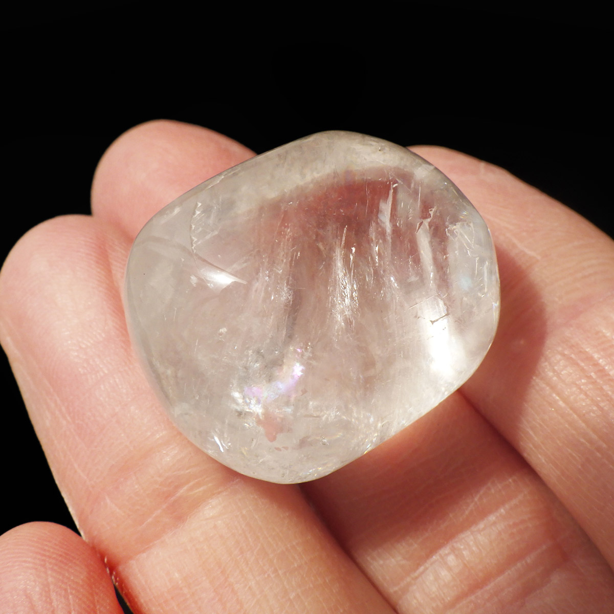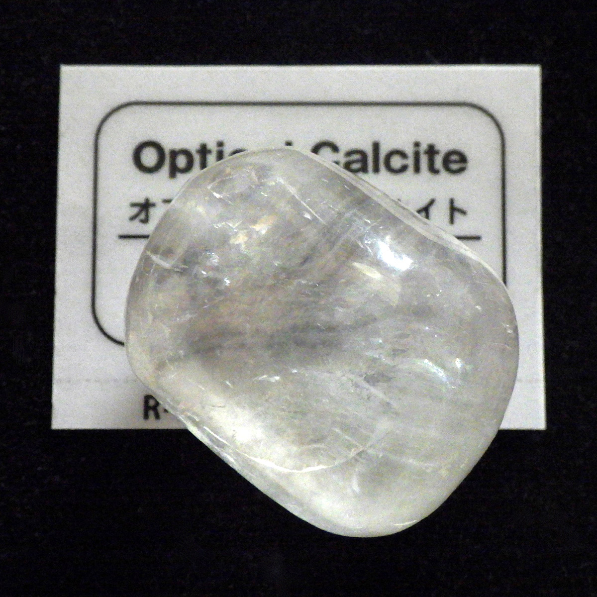 メキシコ産のオプティカルカルサイト、タンブルです。無色透明で良質のカルサイトのことをオプティカルカルサイトと呼びます。高い透明度を持ち、様々な角度からレインボーを見ることができます。複屈折という光学現象を持ち、文字の上に載せると二つにダブって見える「ダブリング(二重像現象)」のような現象を起こします。透明度が高く、レインボーも見られ、とてもきれいでおすすめです。