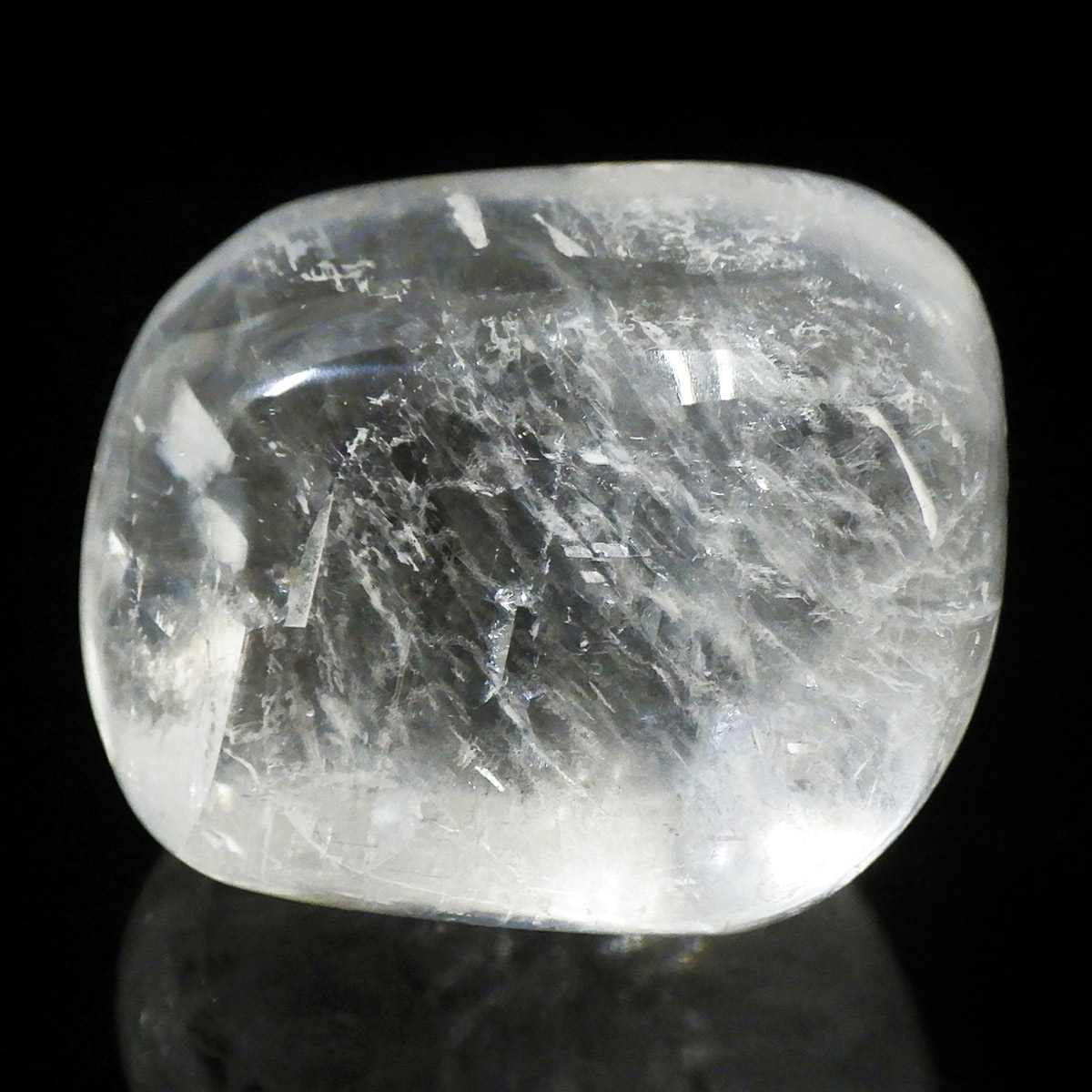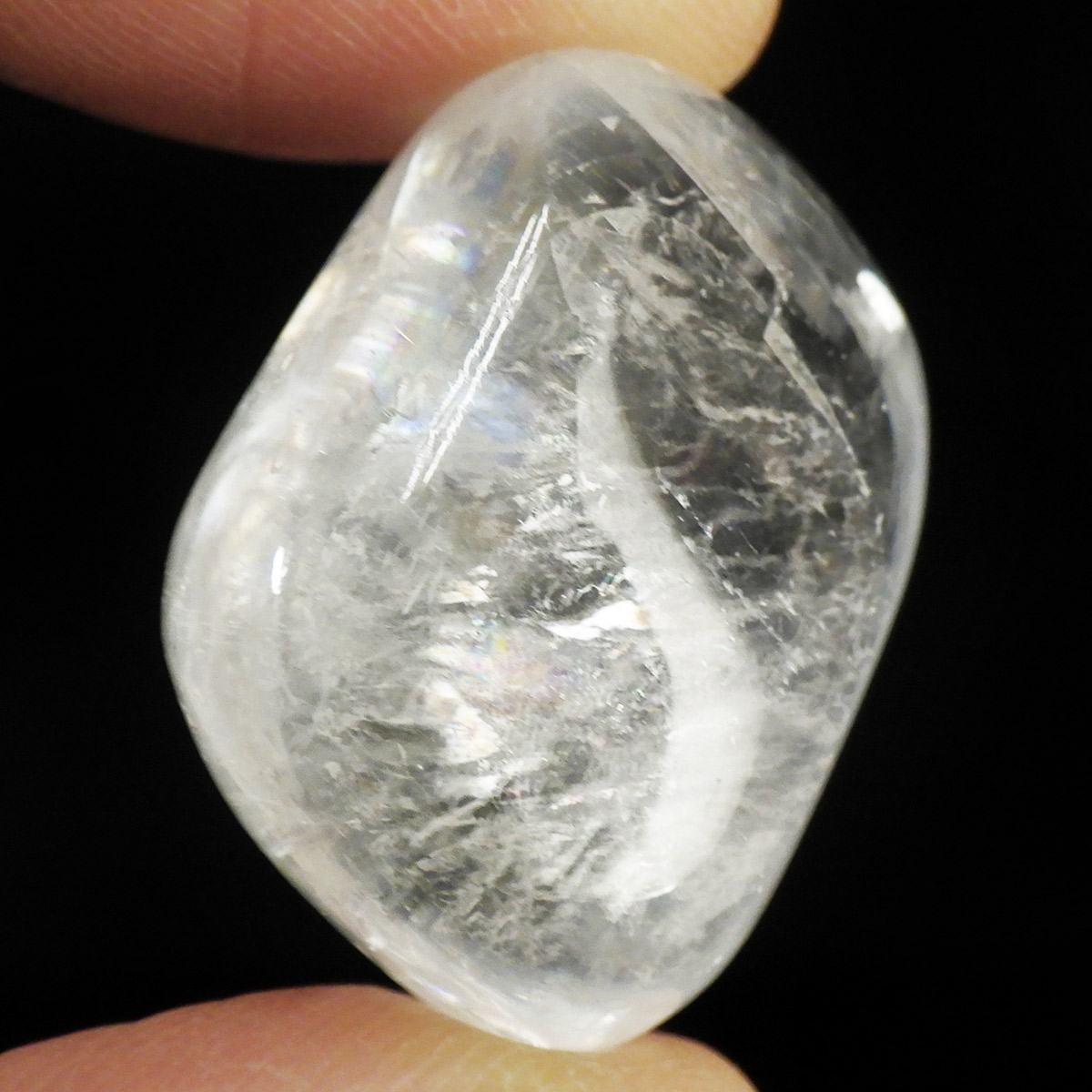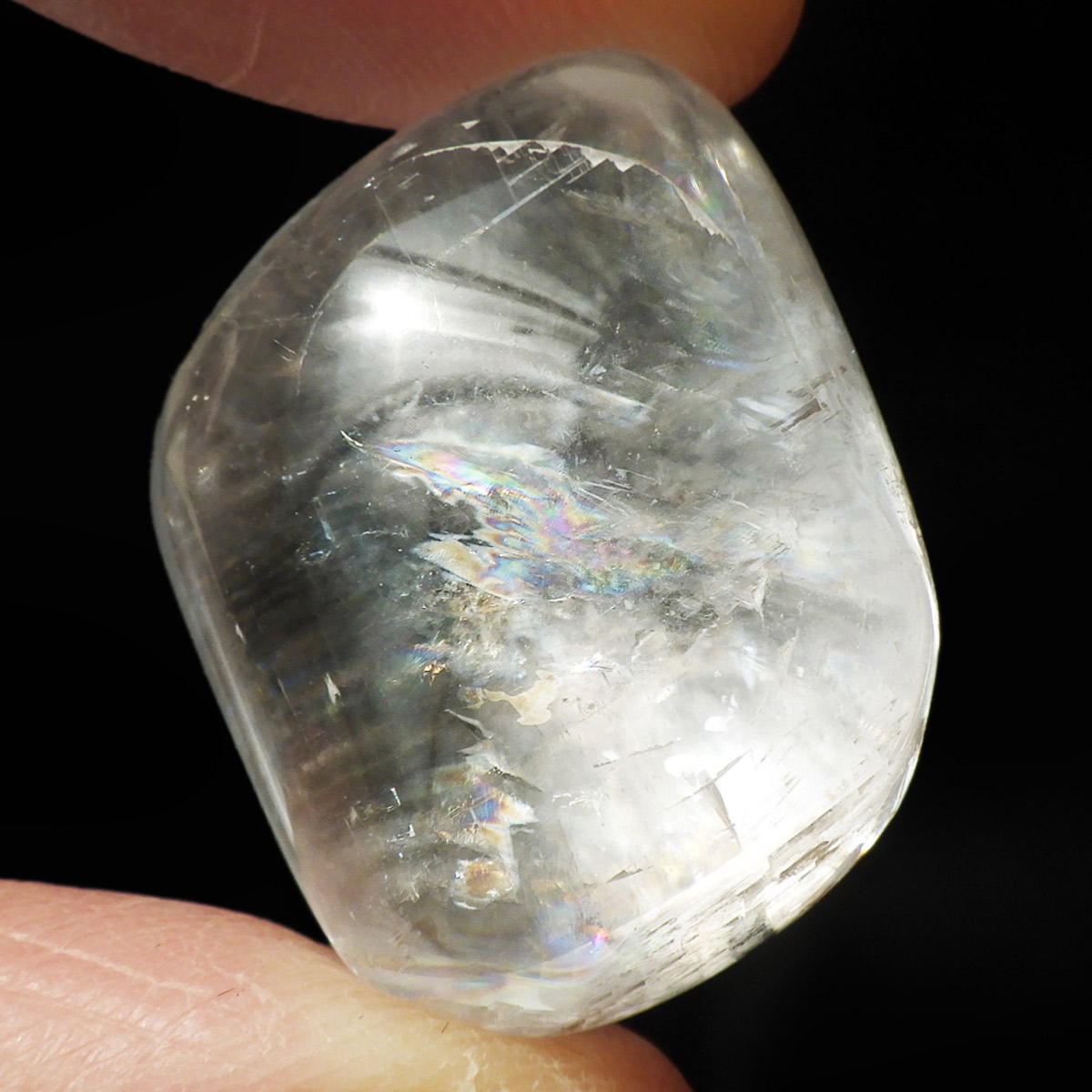 メキシコ産のオプティカルカルサイト、タンブルです。無色透明で良質のカルサイトのことをオプティカルカルサイトと呼びます。高い透明度を持ち、様々な角度からレインボーを見ることができます。複屈折という光学現象を持ち、文字の上に載せると二つにダブって見える「ダブリング(二重像現象)」のような現象を起こします。透明度が高く、レインボーも見られ、とてもきれいでおすすめです。