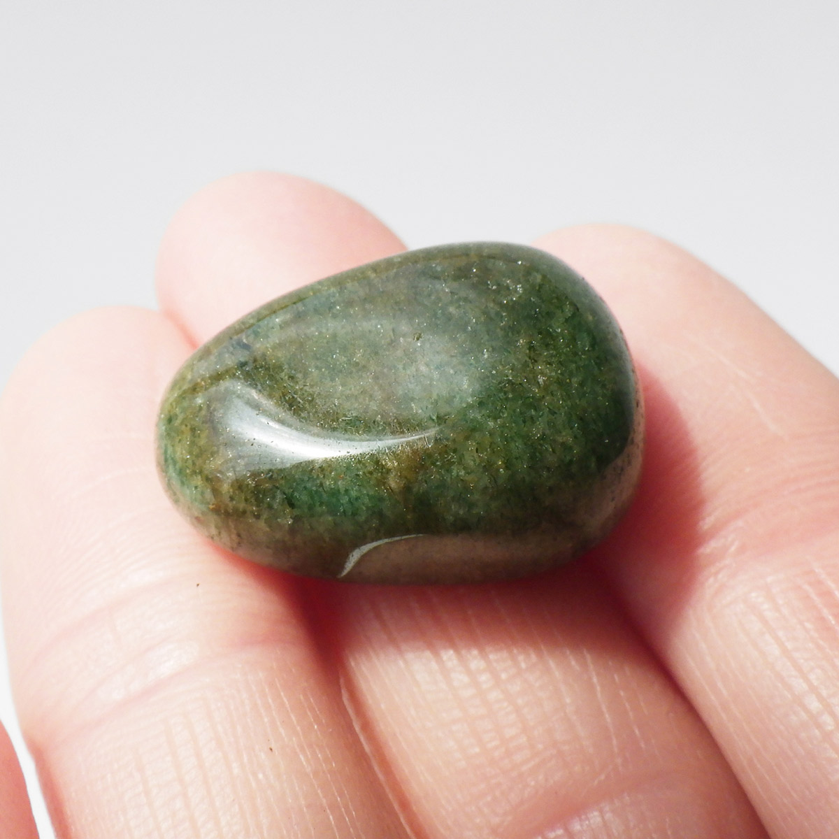 南アフリカ産のフックサイト、タンブルです。フックサイト、発音によりフクサイト、またはクロムマイカと呼ばれております。マイカ(雲母)グループの中のモスコバイト(白雲母)の変種で緑色になったものがフックサイトです。和名はクロム白雲母でクロムにより緑色に発色しております。写真では分かりずらいですが、雲母の粒子で表面はキラキラとしております。 フックサイトは、非常に癒しの効果が高いヒーリングストーンとして知られています。ストレスや不安などを和らげ、リラックスした精神状態をもたらしてくれるとされ、自分らしく生きることができずストレスを感じている人にも効果的です。自分の心の声に素直に従って自分らしい人生を生きていけるよう導いてくれるといわれています。