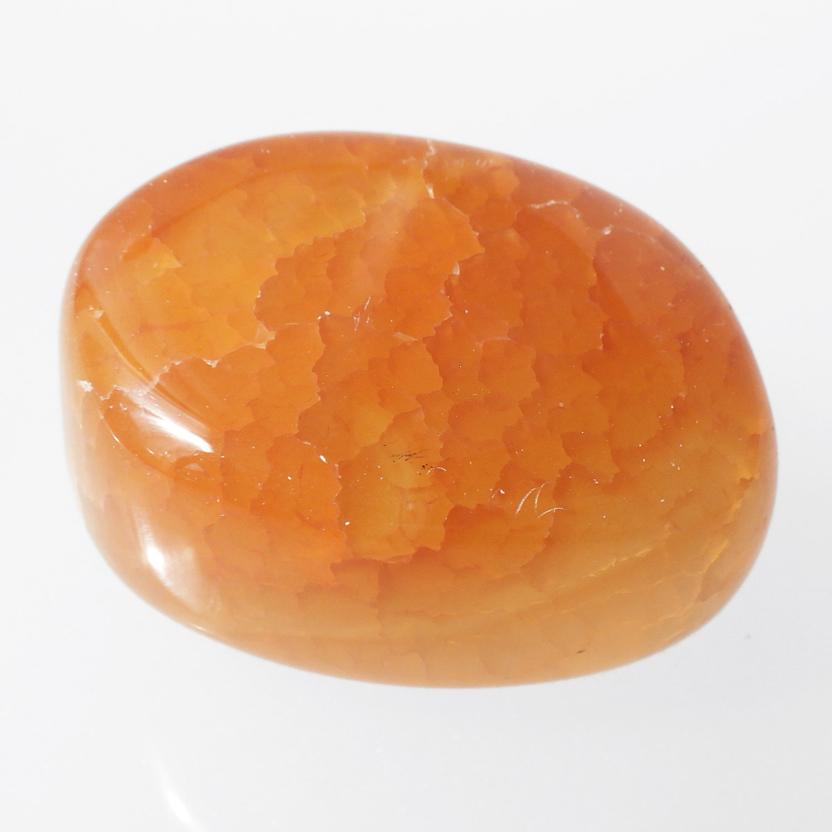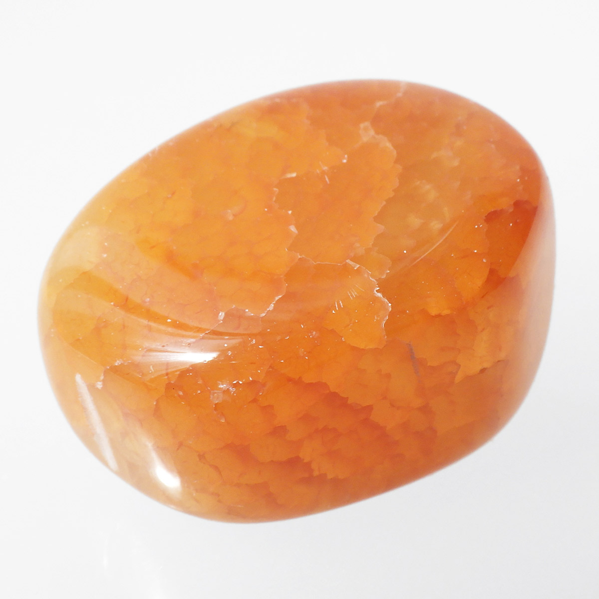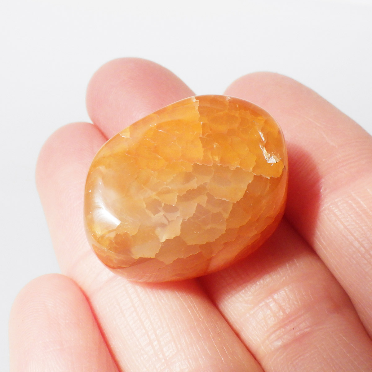 チャイナ産のファイヤーアゲート、タンブルです。アゲートの和名は「瑪瑙」。 目に見えないほど細かい石英の結晶で構成されており、緻密に固まり色むらの少ないものを「カルセドニー」、色彩の変化や縞模様などがあるのもを「アゲート」と区別しています。 火炎に似た紅色の濃淡が重なる亀甲模様のアゲートを中国ではファイヤーアゲートと呼んでいます。