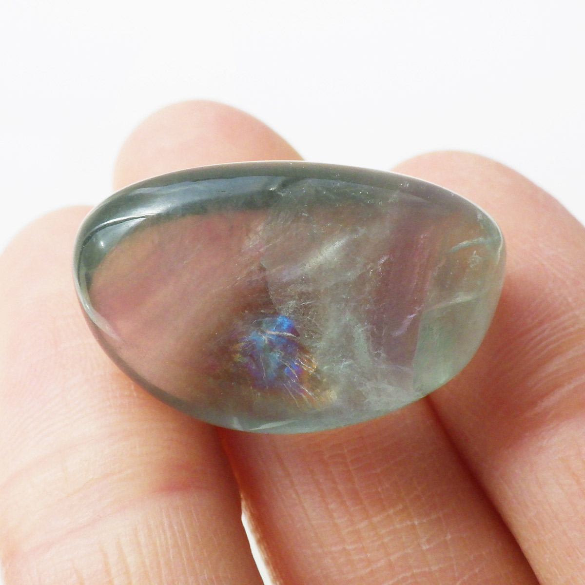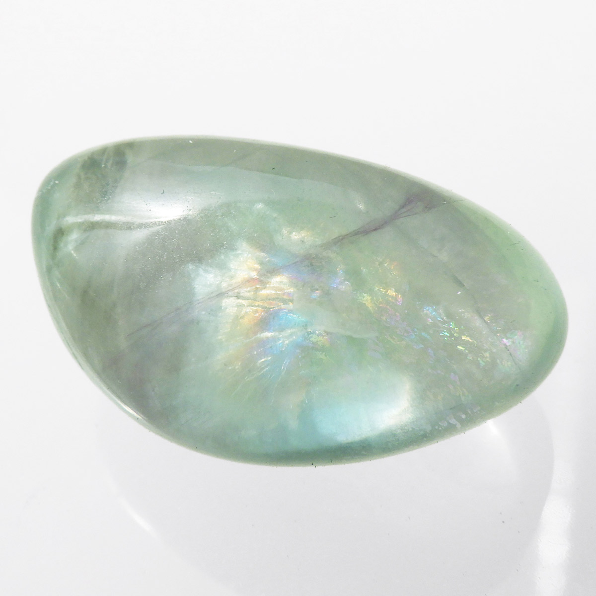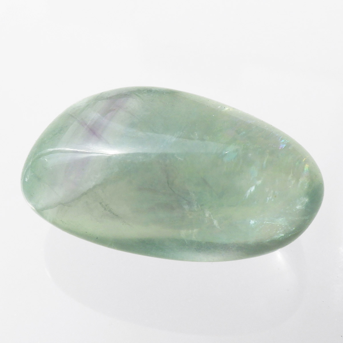 ブルーグリーンフローライト、タンブルです。 大変透明度が高く、いろいろなカラーの色彩が見られます。蛍石の名前の通り、様々な角度からその美しさを楽しむことができます。光にかざして透かすと、カラーが複雑に入り乱れており、そのグラデーションが大変きれいです。