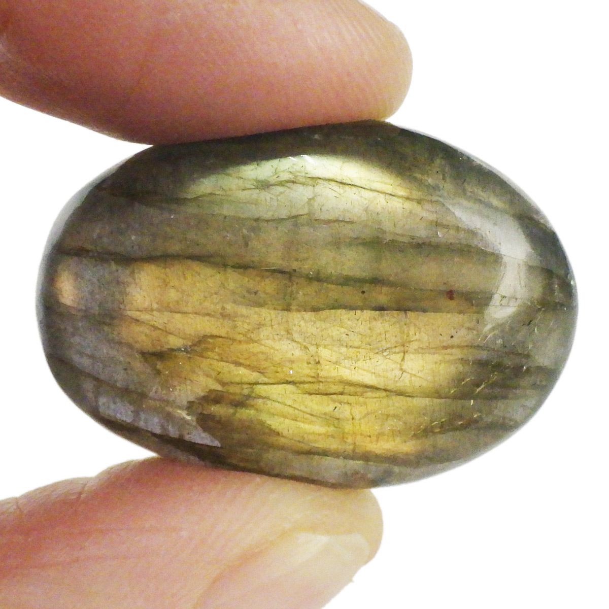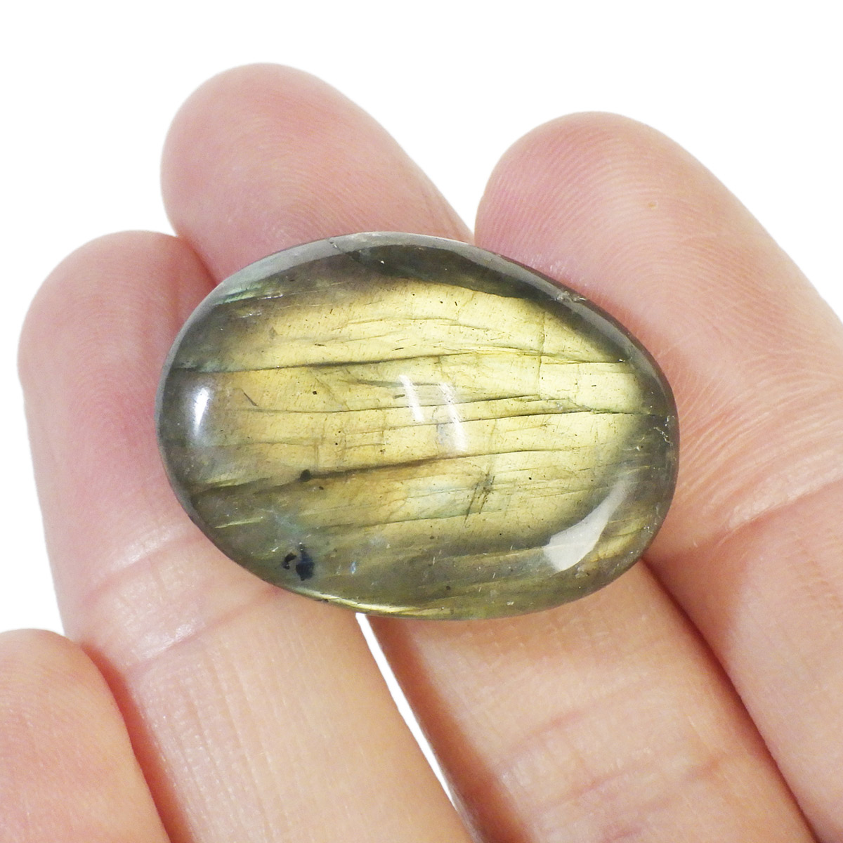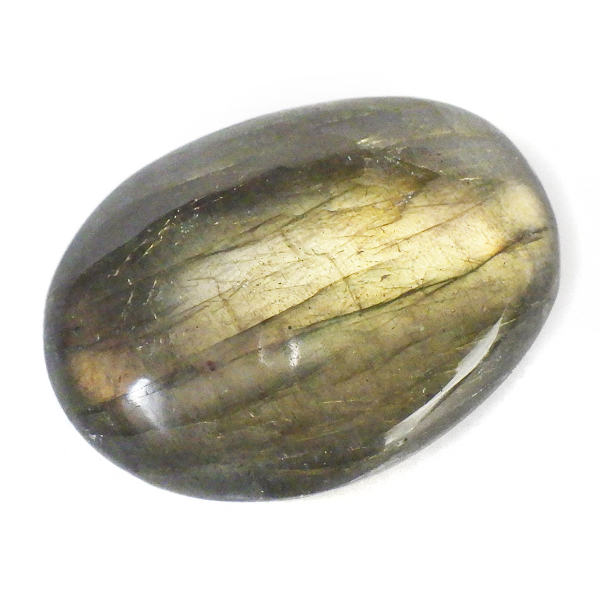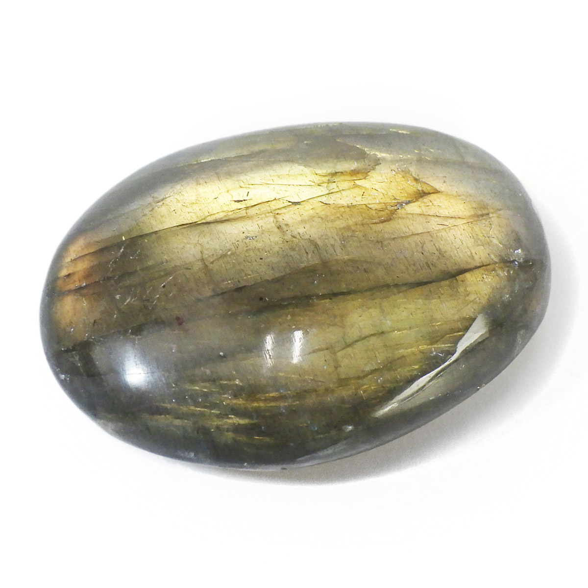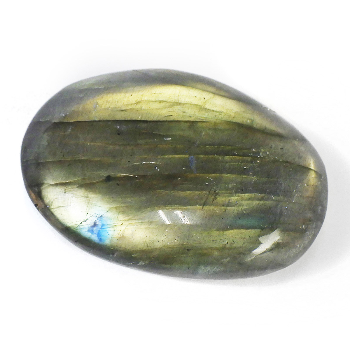 マダガスカル産のラブラドライト、タンブルです。ラブラドライトは見る角度によってオーロラのような色彩を変えるラブラドレッセンスという美しい光を持つのが特徴です。表と裏全面にラブラドレッセンスが見られます。通称フルフラッシュラブラドライトでマクラメやワイヤーアートなどにもおすすめなサイズです。