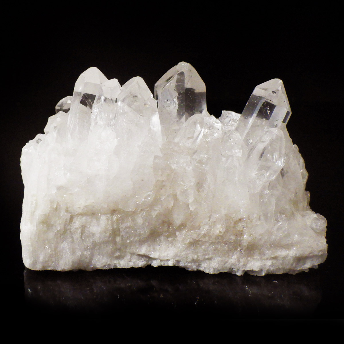 良質な水晶の産地、ブラジル ミナスジェライス州産 の水晶クラスターです。この水晶クラスターの特徴は、しっかりと水晶柱が育っている安定感のある姿。「これぞ、水晶クラスター」という形状をしています。 非常に透明度の高い大小様々な結晶が複雑に絡み合い、見る角度によって様々な表情を見せる大変美しいクラスターです。