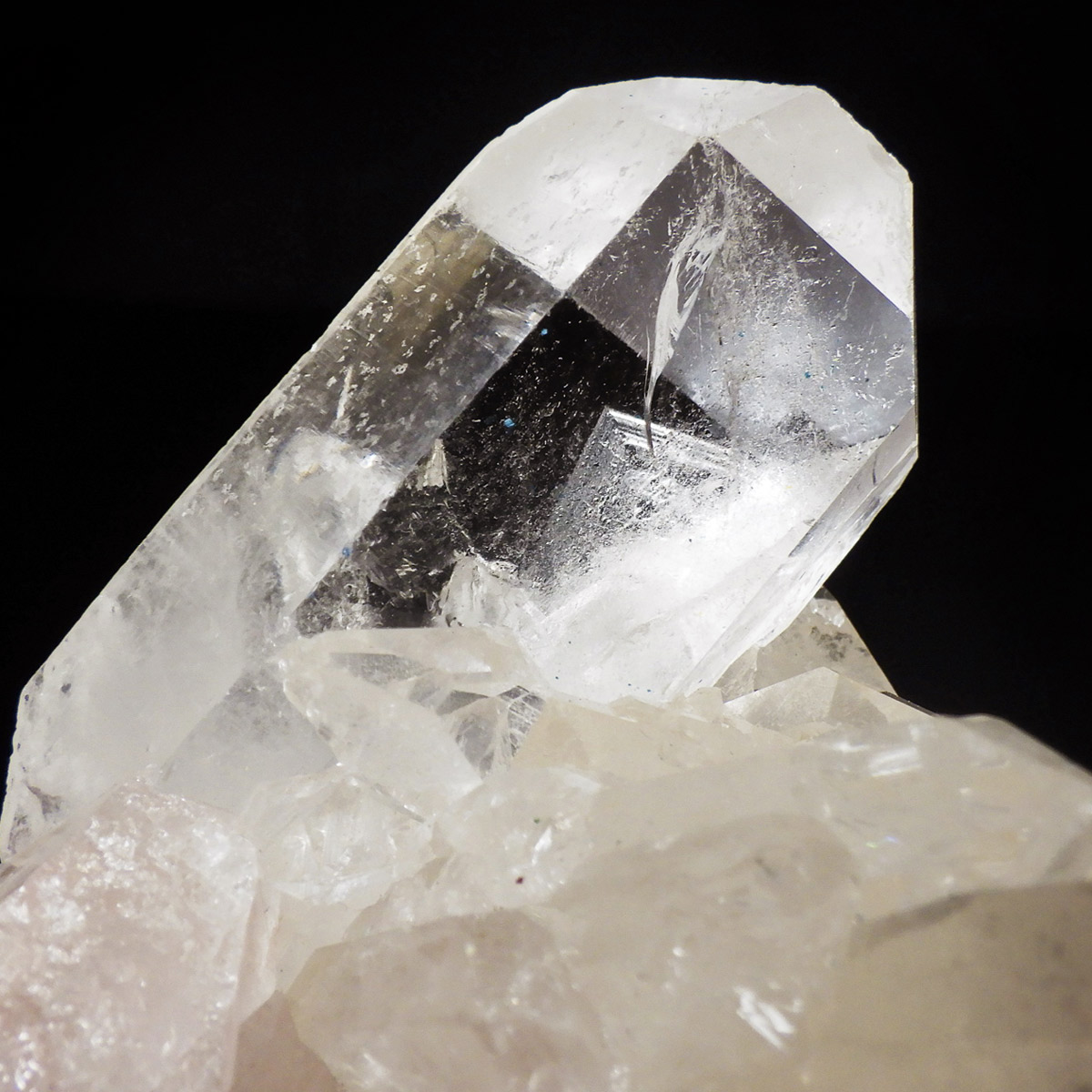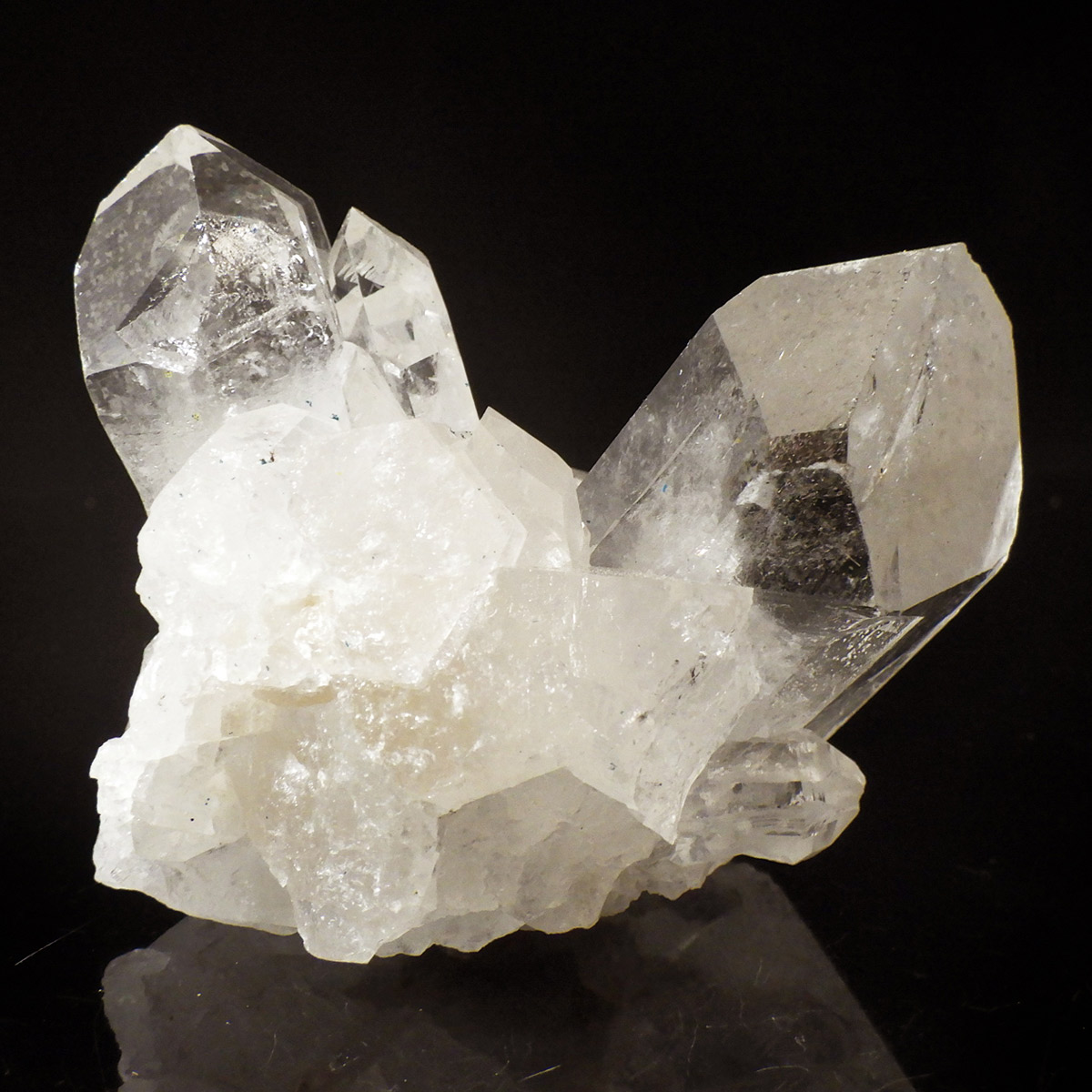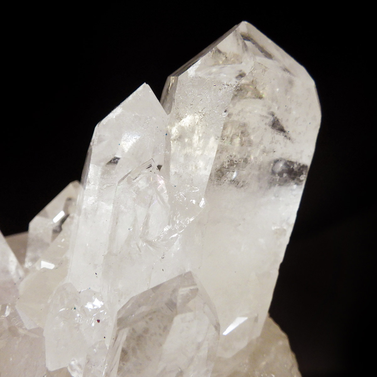 良質な水晶の産地、ブラジル ミナスジェライス州産 の水晶クラスターです。この水晶クラスターの特徴は、高い透明度と、どっしりとした水晶柱が安定感を感じさせる一点で、見る角度によって様々な表情を見せる大変美しいクラスターです。