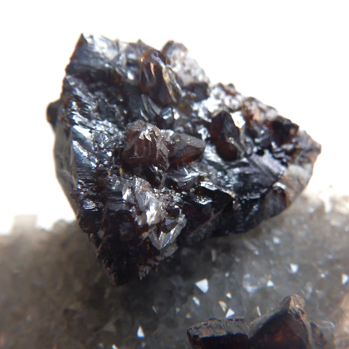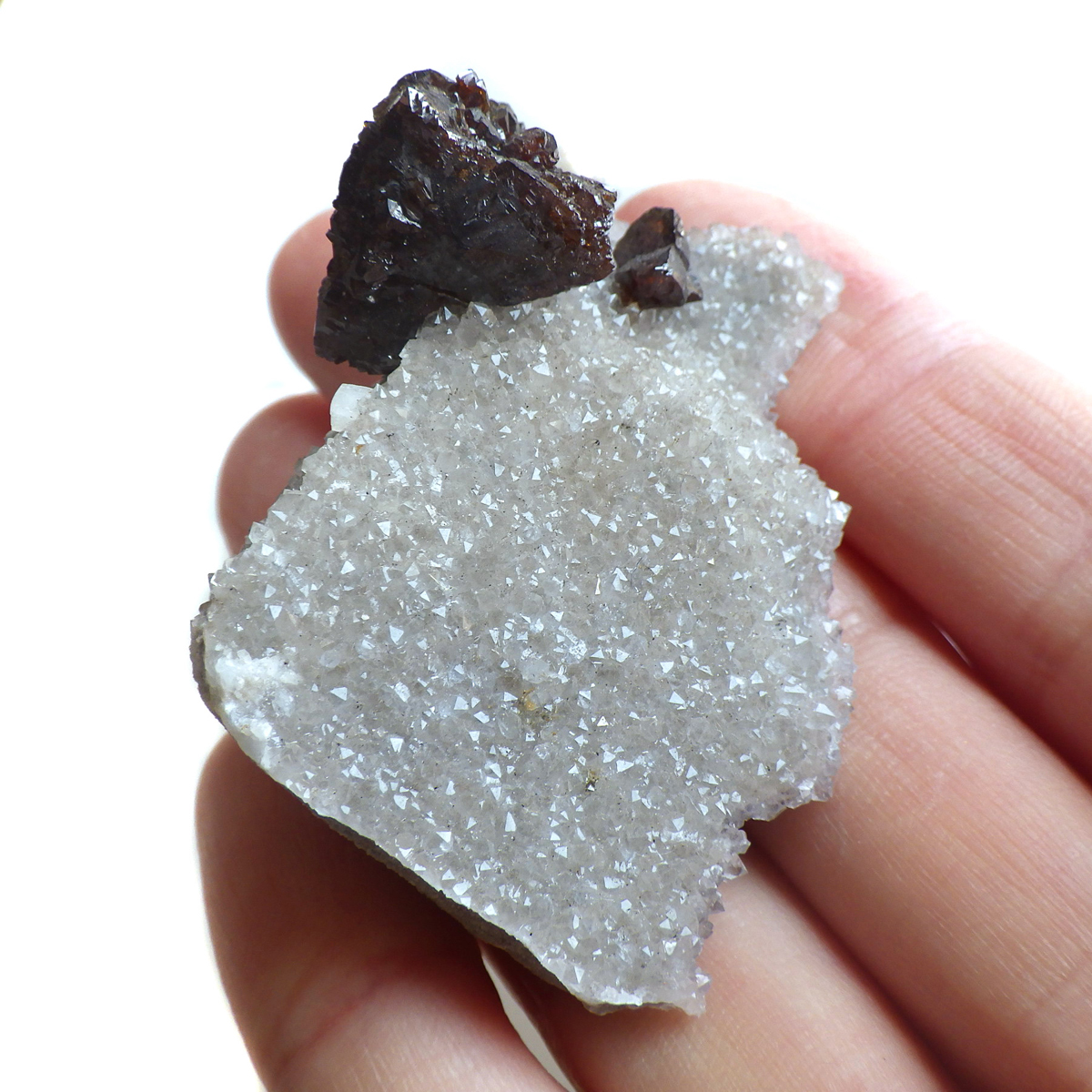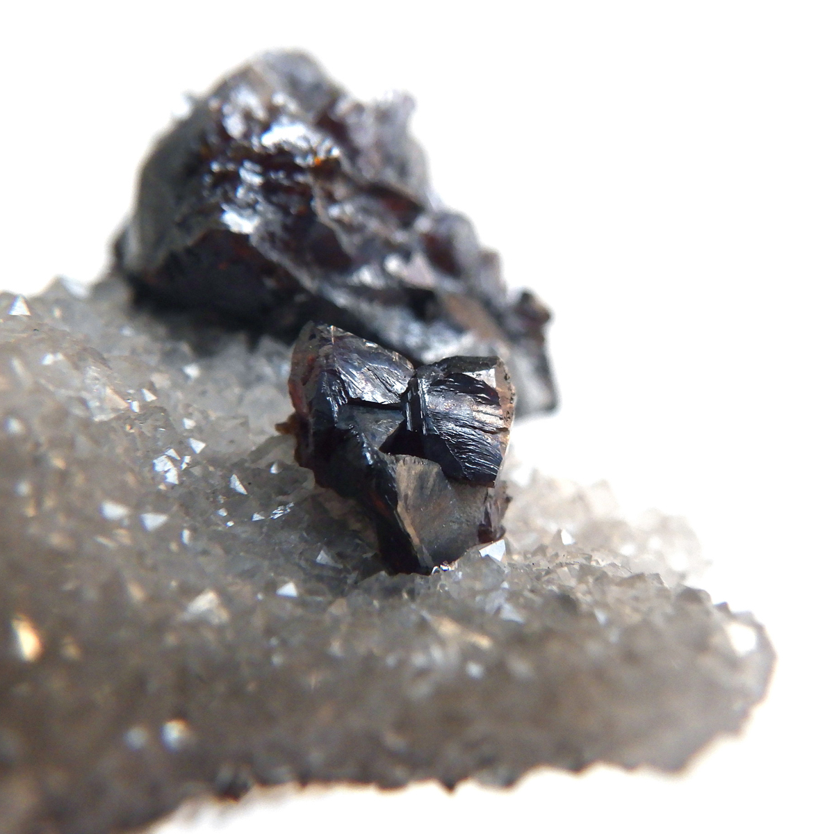 アメリカ・テネシー州産のスファレライト原石です。 スファレライトはガレーナなどの他の鉱物とよく間違えられていたことからギリシャ語のあてにならないという意味のsphalerosにちなんで名付けられたそうです。スファレライトは和名で閃亜鉛鉱といいます。水晶やカルサイトと共生しており、どちらの結晶もキラキラと美しい原石です。